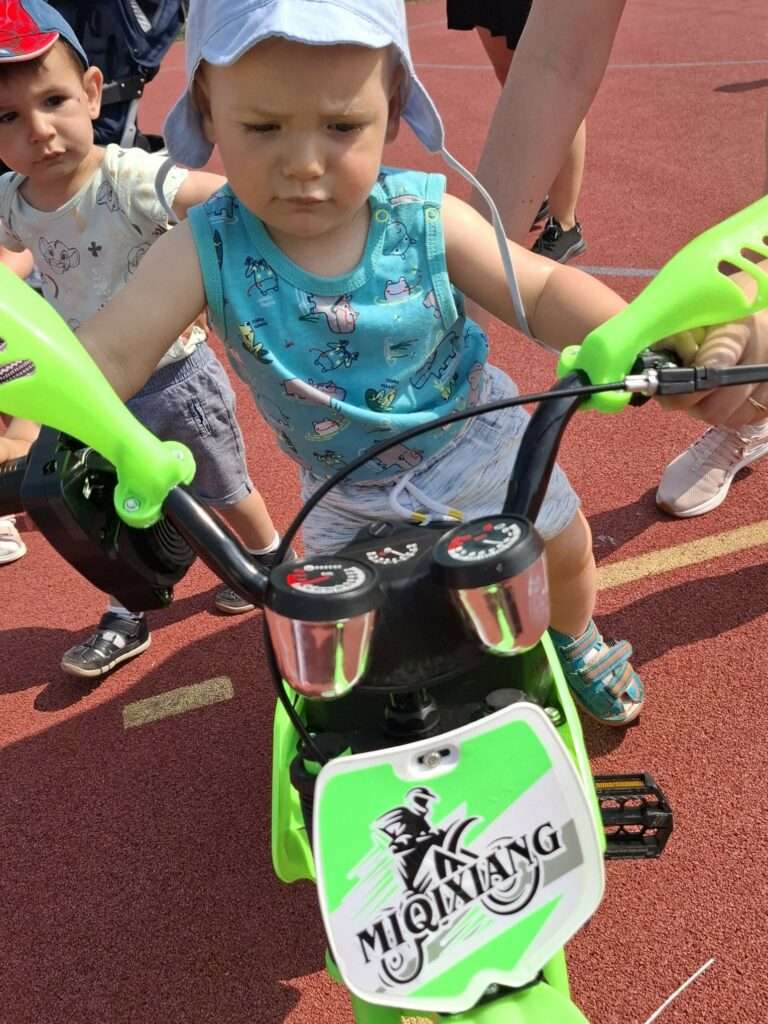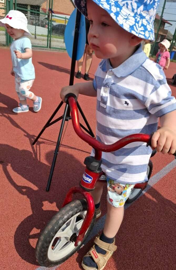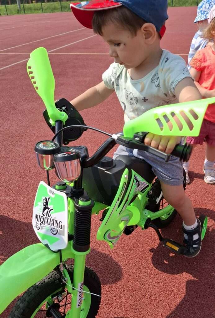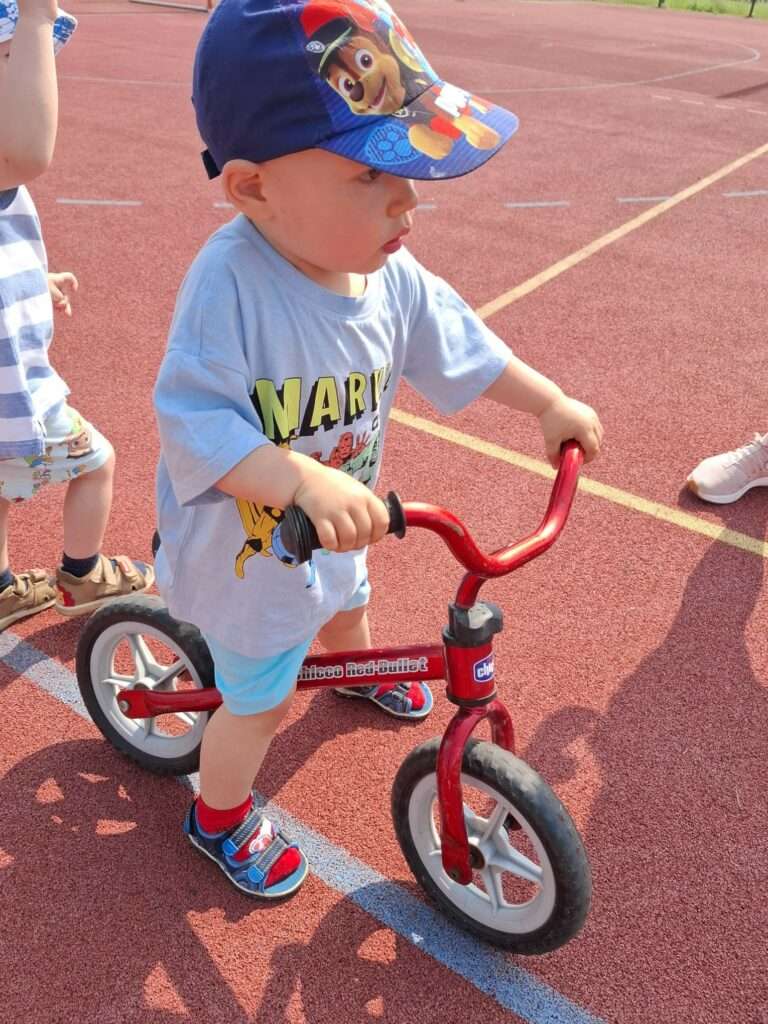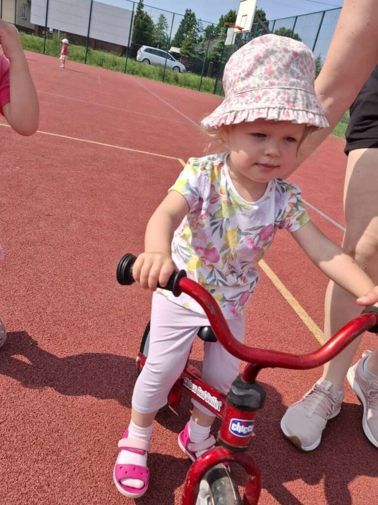 Nasze maluchy zamieniły się w małych rowerzystów. Na boisku czekał na nich wyjątkowy tor, po którym mogły poćwiczyć jazdę na rowerkach. ![]()