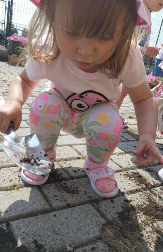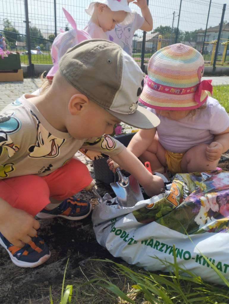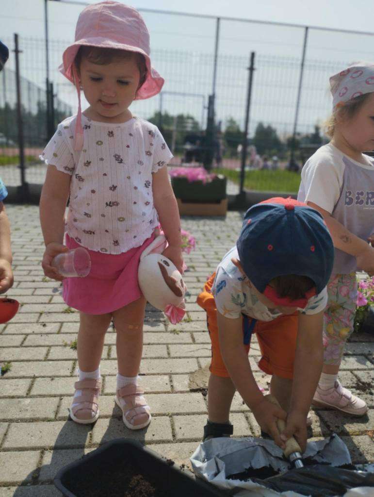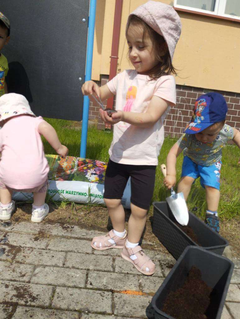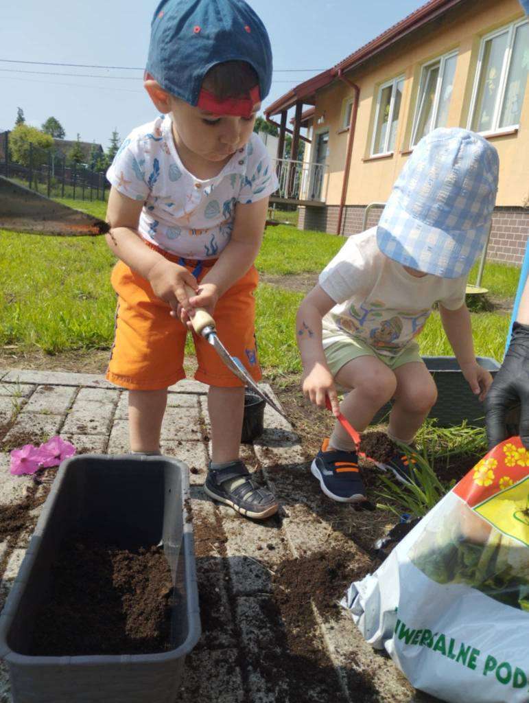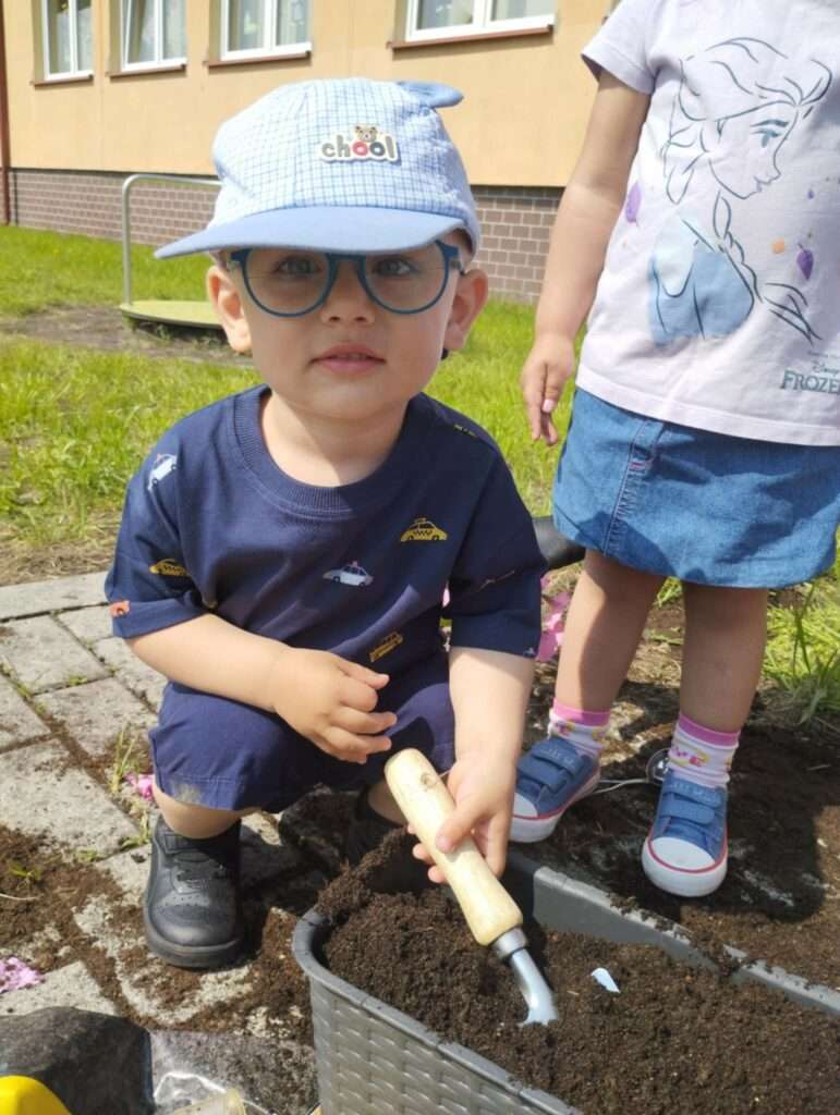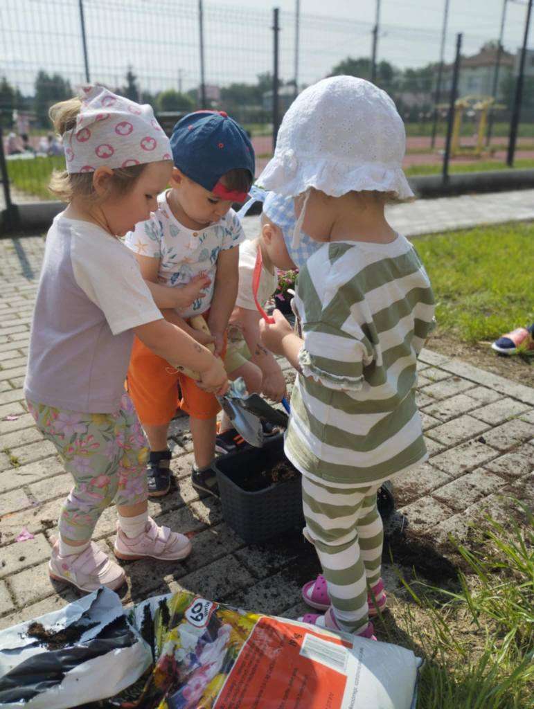 Dzieci wyposażone w konewki, łopatki i kubeczki z wielkim zaangażowaniem pomagały w przesadzaniu roślin. Dla naszych małych odkrywców była to nie tylko wspaniała zabawa, ale też cenne doświadczenie wspierające rozwój sensoryczny, motorykę małą oraz budowanie relacji z naturą.![]()