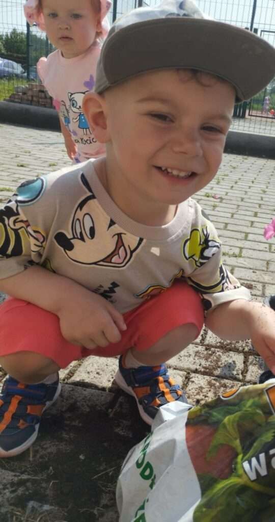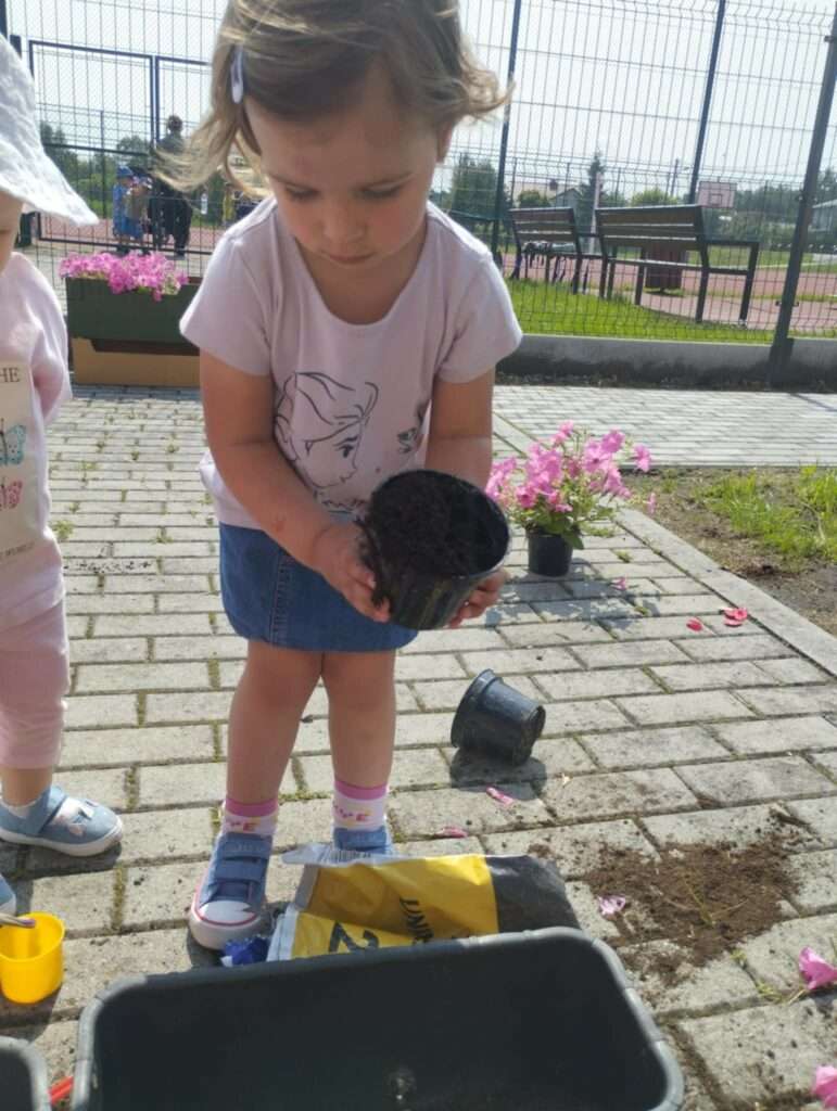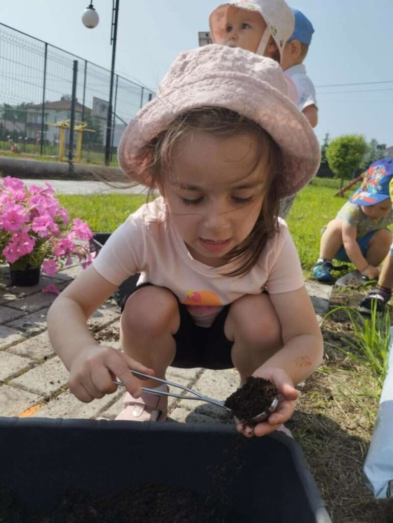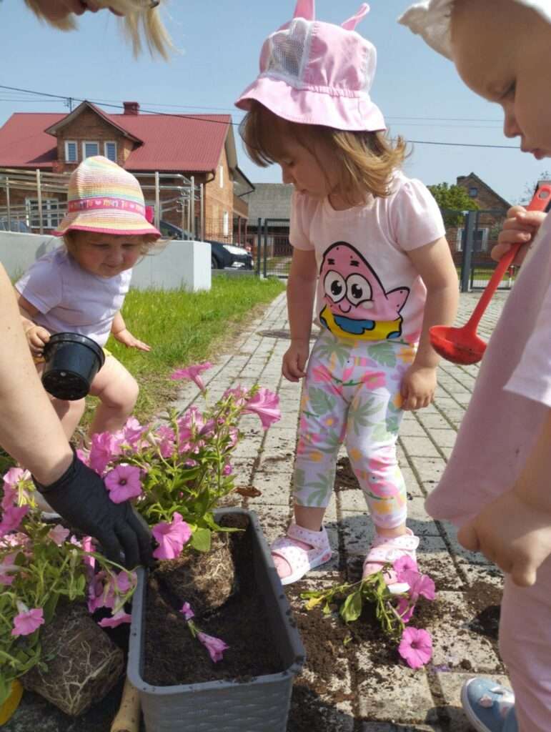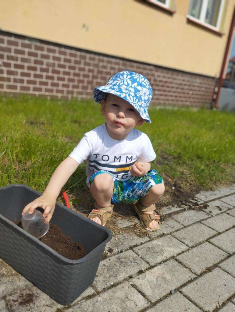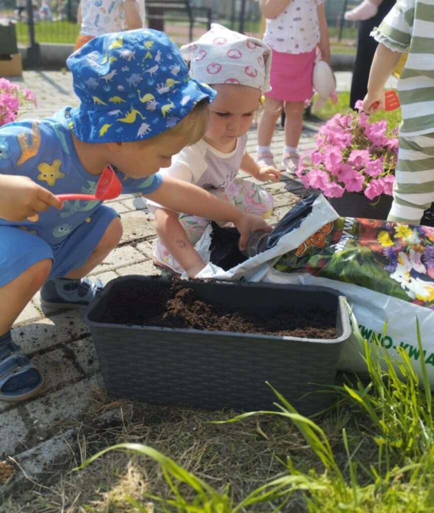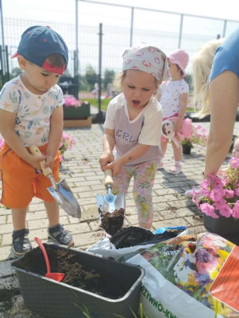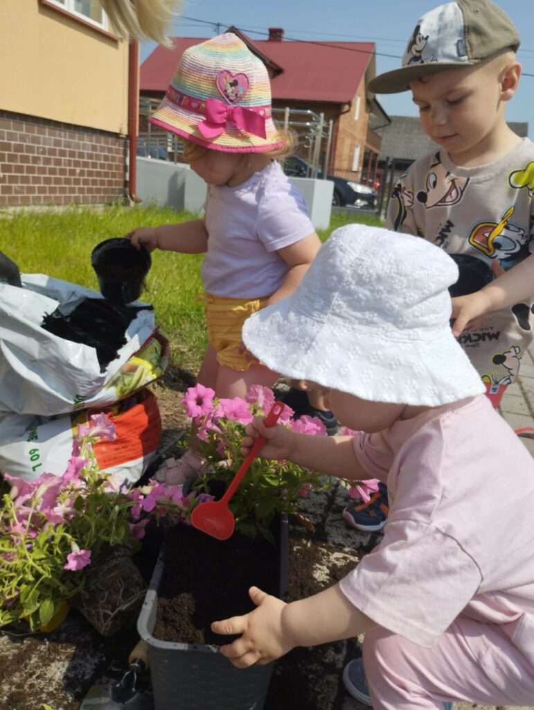 Dzieci wyposażone w konewki, łopatki i kubeczki z wielkim zaangażowaniem pomagały w przesadzaniu roślin. Dla naszych małych odkrywców była to nie tylko wspaniała zabawa, ale też cenne doświadczenie wspierające rozwój sensoryczny, motorykę małą oraz budowanie relacji z naturą.![]()