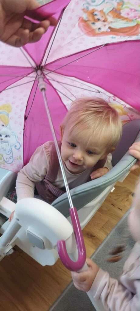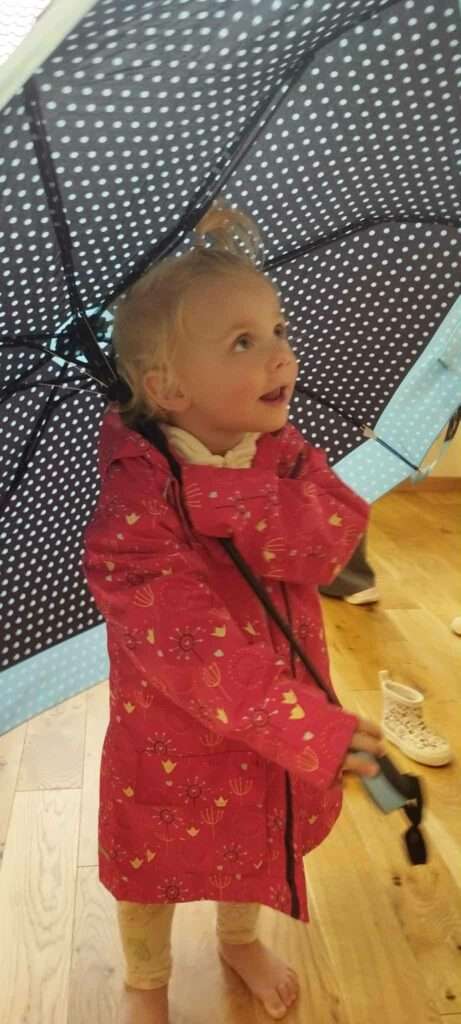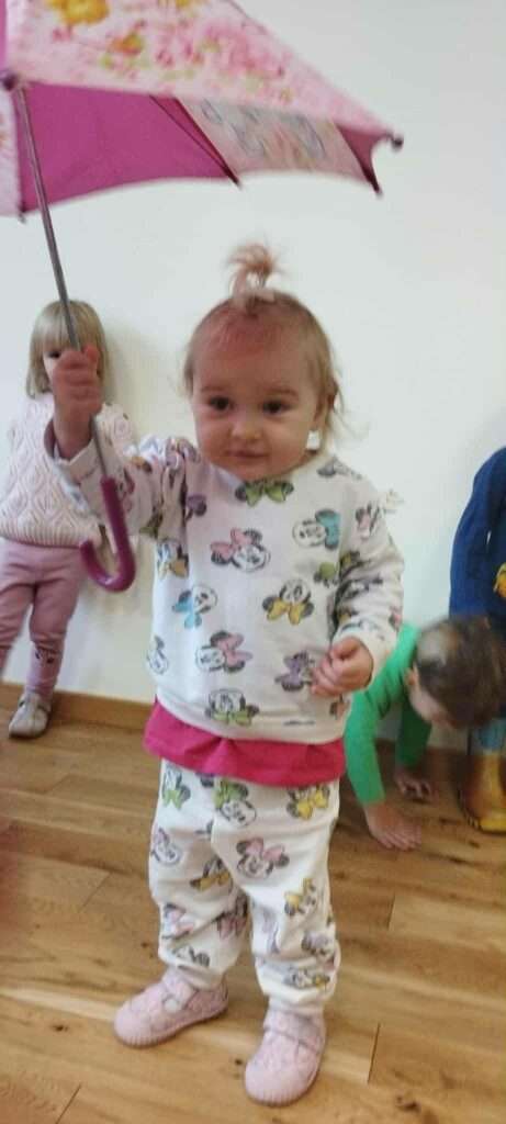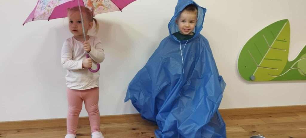 Rozmawialiśmy o tym, jak przygotować się na wyjście w deszczową pogodę – dzieci już wiedzą, że potrzebne są kalosze, kurtka przeciwdeszczowa i oczywiście parasol. ![]()