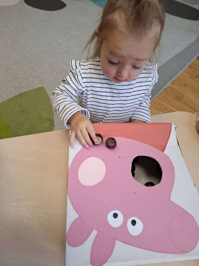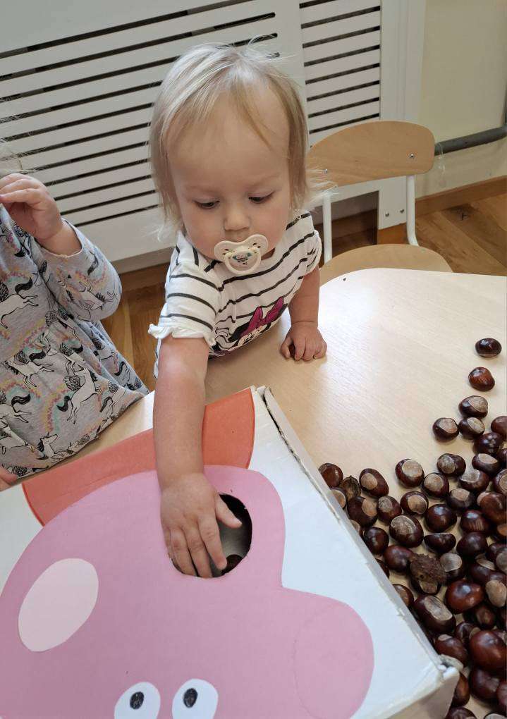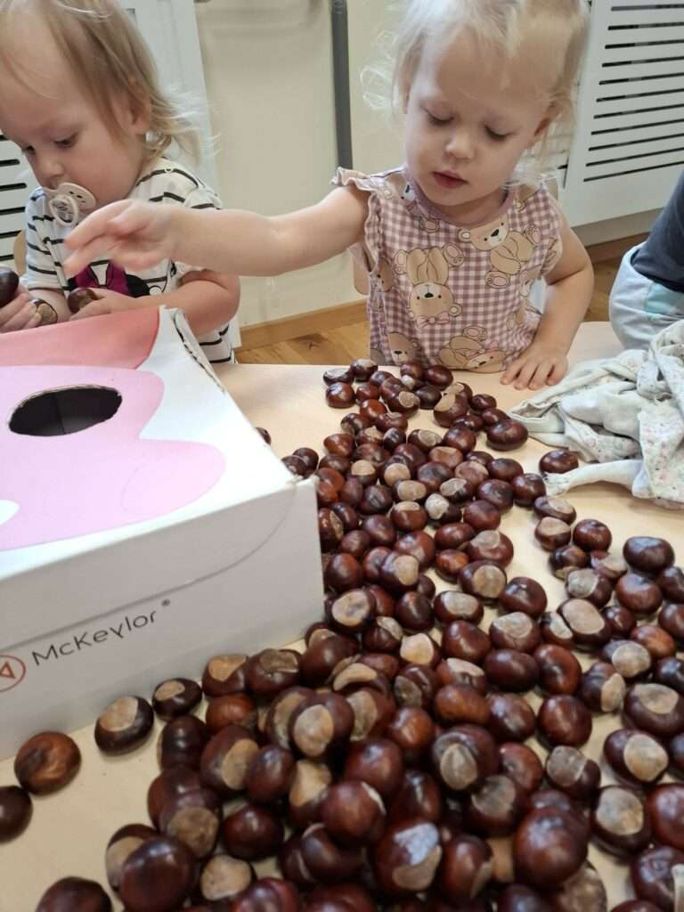Jesień obdarowuje nas swoimi pięknymi darami, a jednym z nich są kasztany – błyszczące, brązowe skarby pełne dobrej energii. Nasze maluchy miały okazję uczestniczyć w niezwykłych aktywnościach, w których tematem przewodnim były kasztany. Najpierw dzieci oglądały i dotykały te jesienne owoce, poznając ich kształt i fakturę. Następnie odbyła się wesoła zabawa w „karmienie zwierzątek kasztanami”, która wywołała mnóstwo uśmiechów i radości.