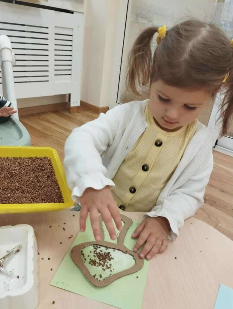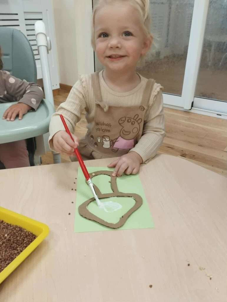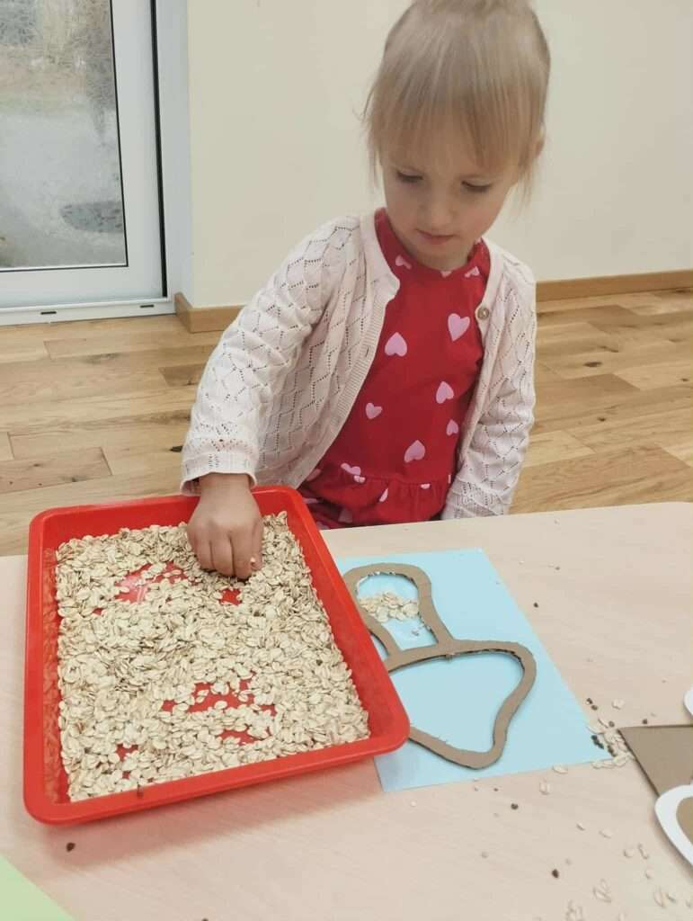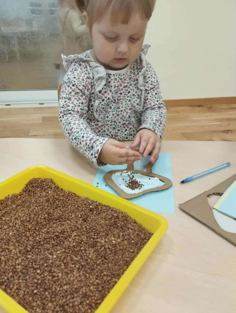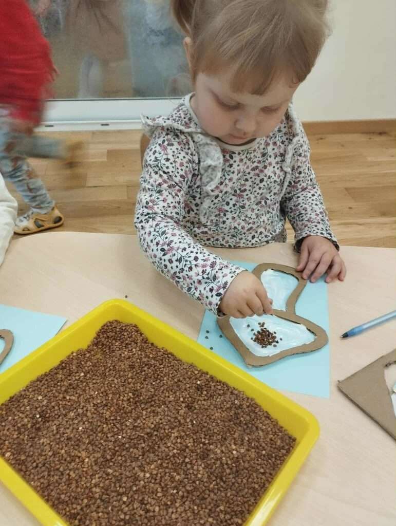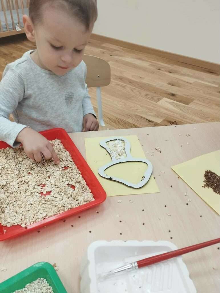 Z pomocą szablonów dzieci najpierw malowały klejem kapelusze i nóżki grzybków, a następnie posypywały je kaszą gryczaną, kaszą jęczmienną i płatkami owsianymi.
