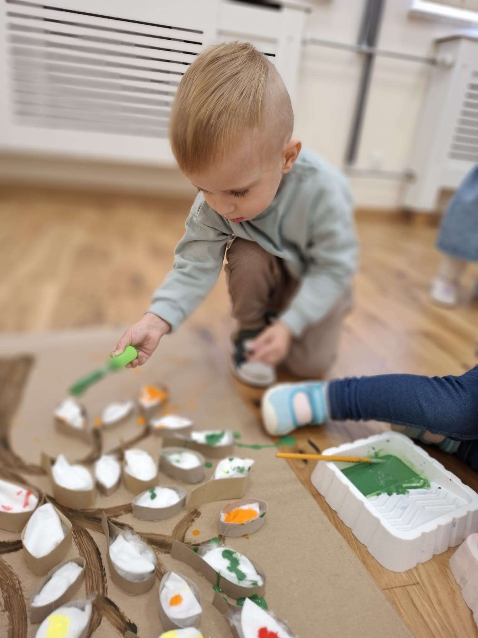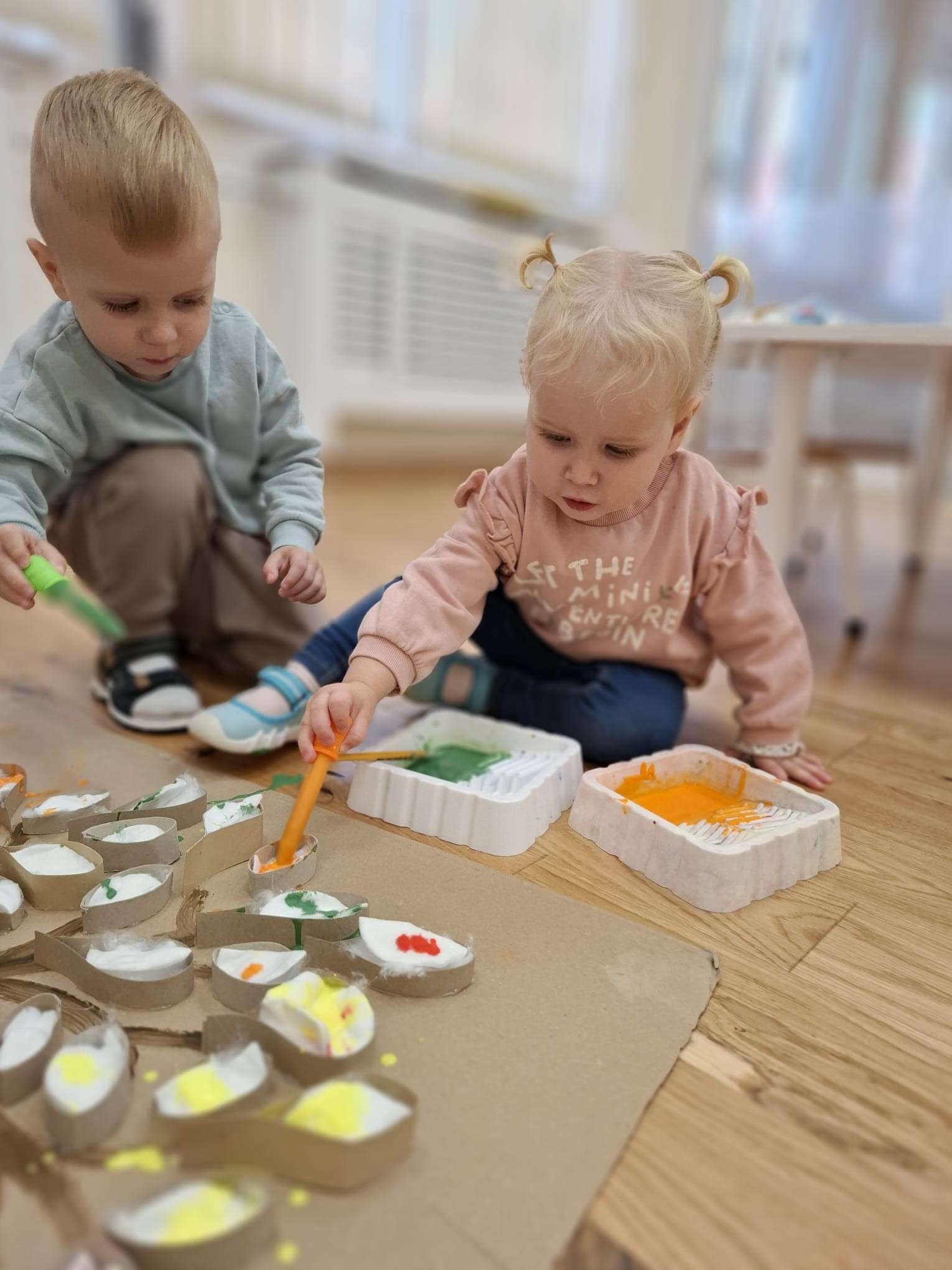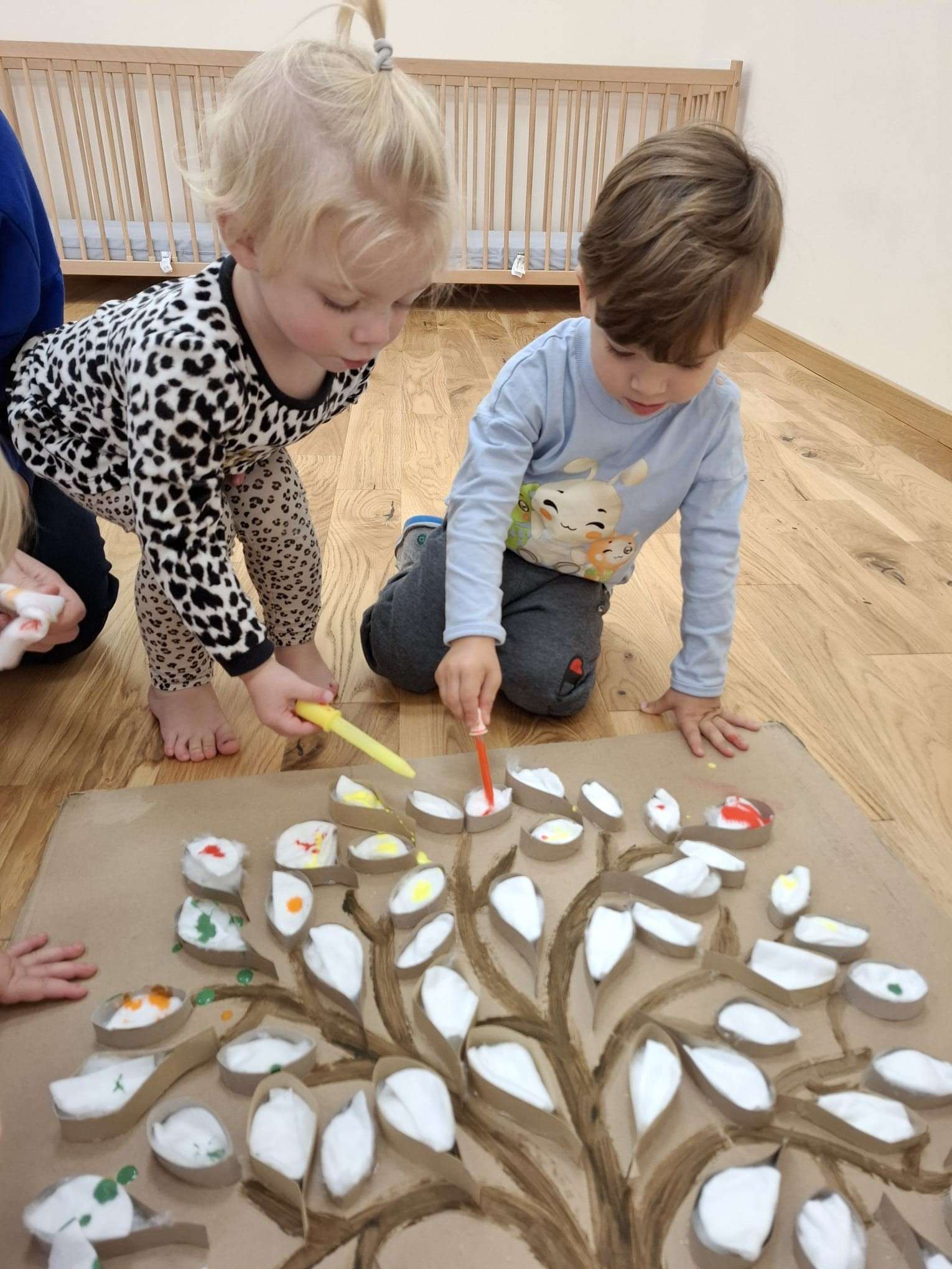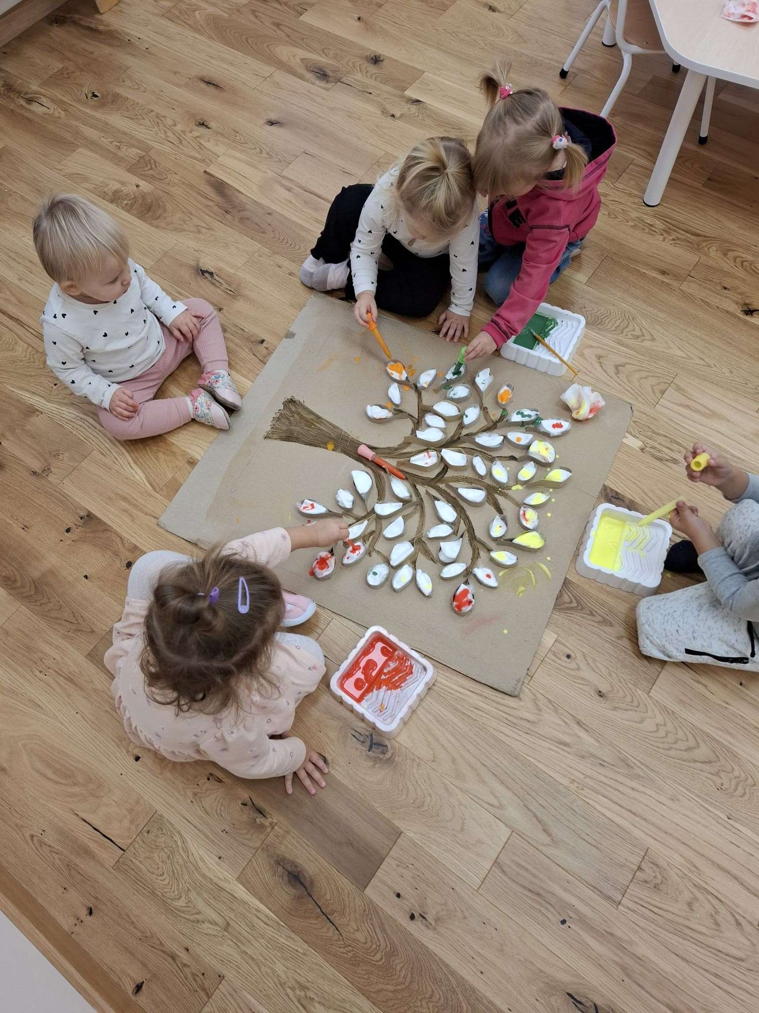 Każdy listek został zakroplony kolorami jesieni – zielenią, czerwienią, pomarańczą oraz żółcią – tworząc razem piękne, barwne dzieło grupowe.![]()