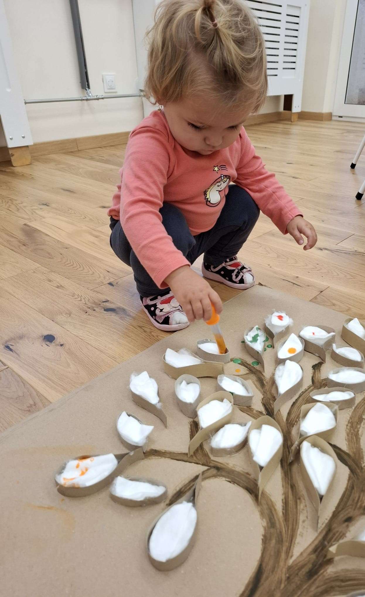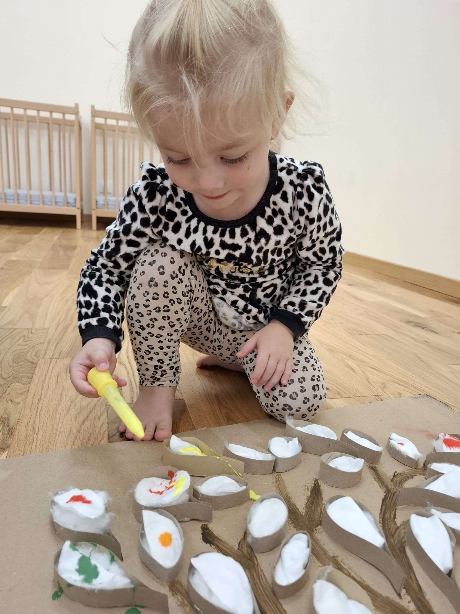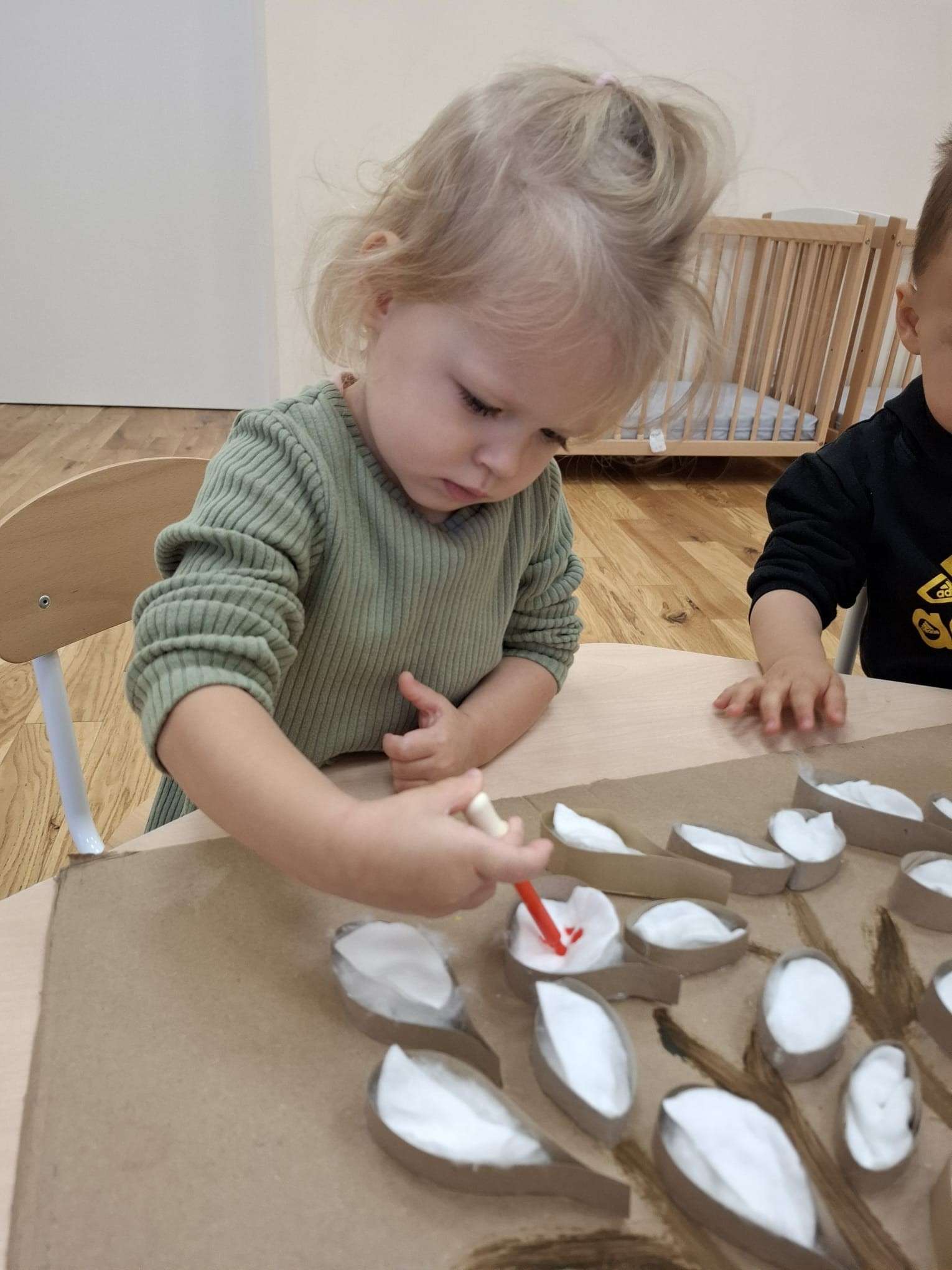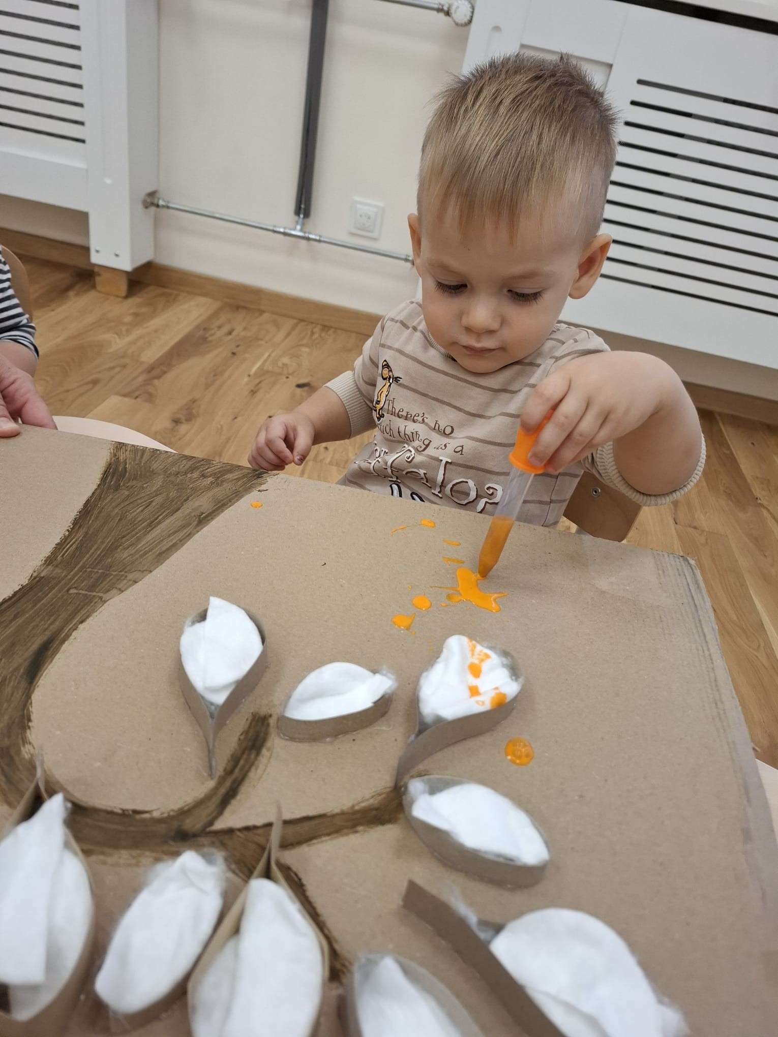 Z tej okazji nasze małe rączki zamieniły się w prawdziwe artystyczne narzędzia. Dzieci tworzyły duże jesienne drzewo, malując „listki” z płatków kosmetycznych przy pomocy pipet.![]()