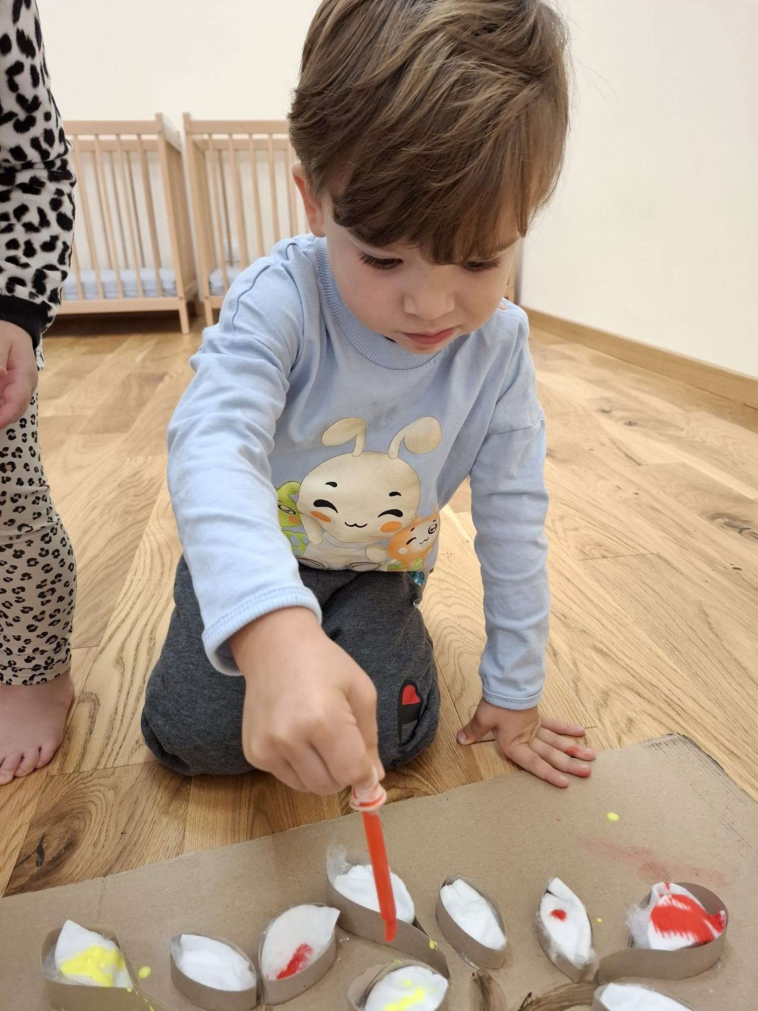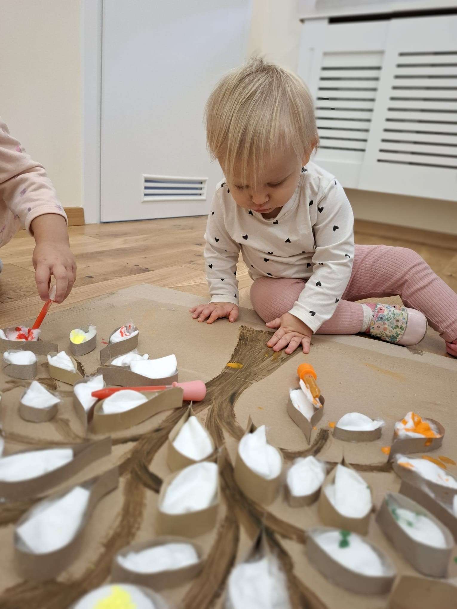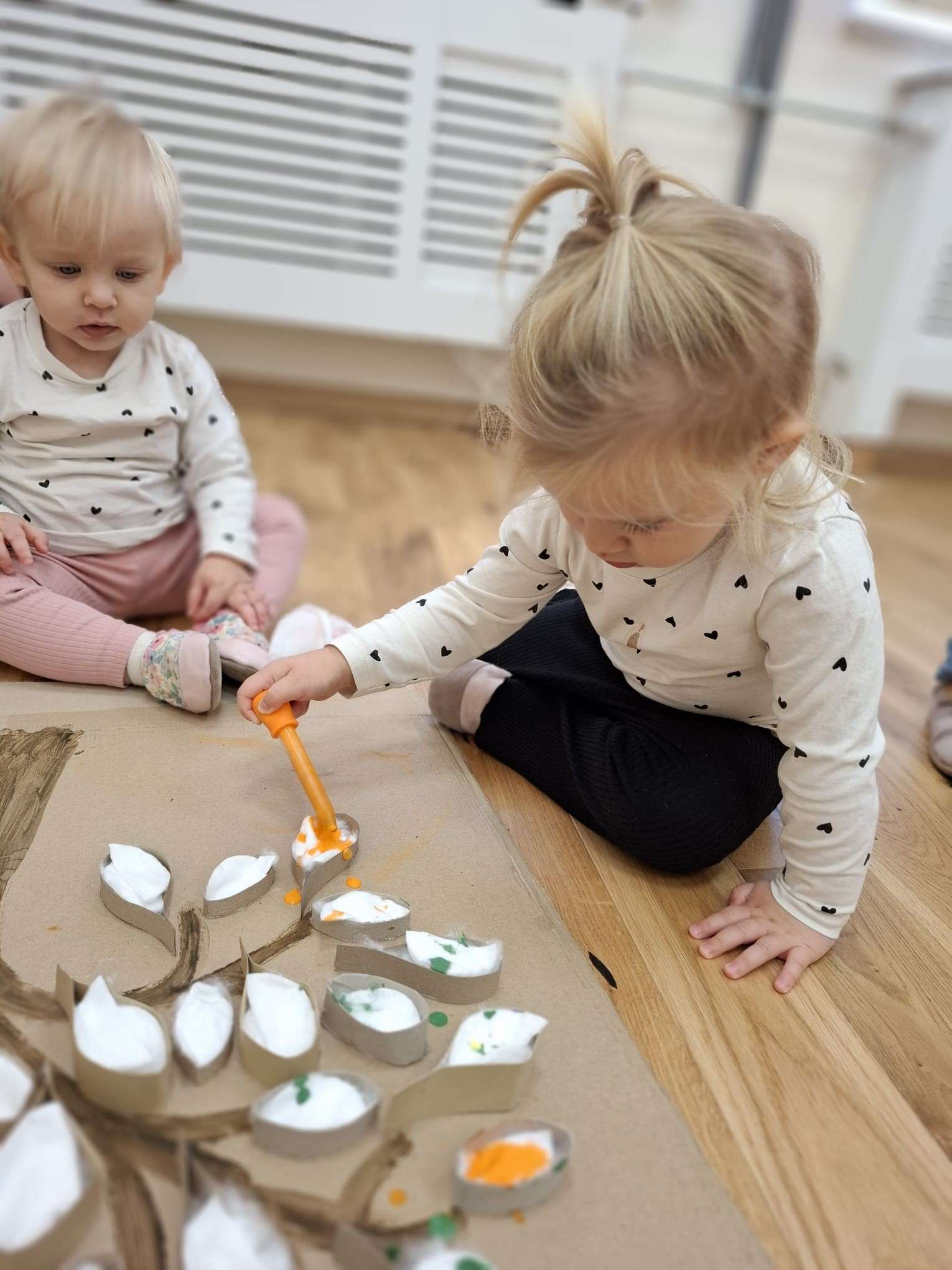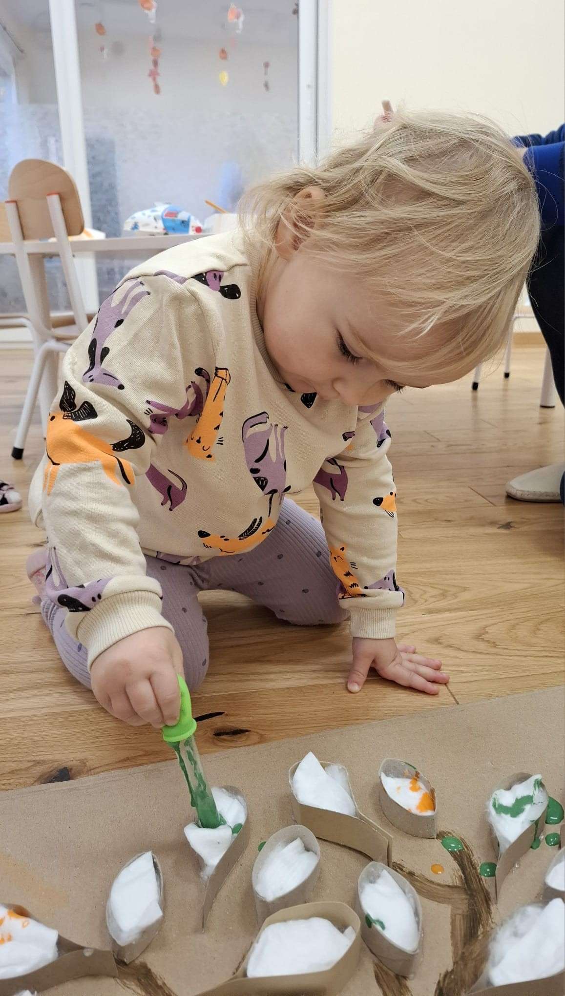 Z tej okazji nasze małe rączki zamieniły się w prawdziwe artystyczne narzędzia. Dzieci tworzyły duże jesienne drzewo, malując „listki” z płatków kosmetycznych przy pomocy pipet.![]()