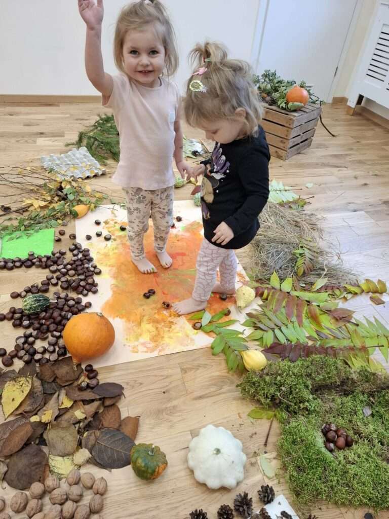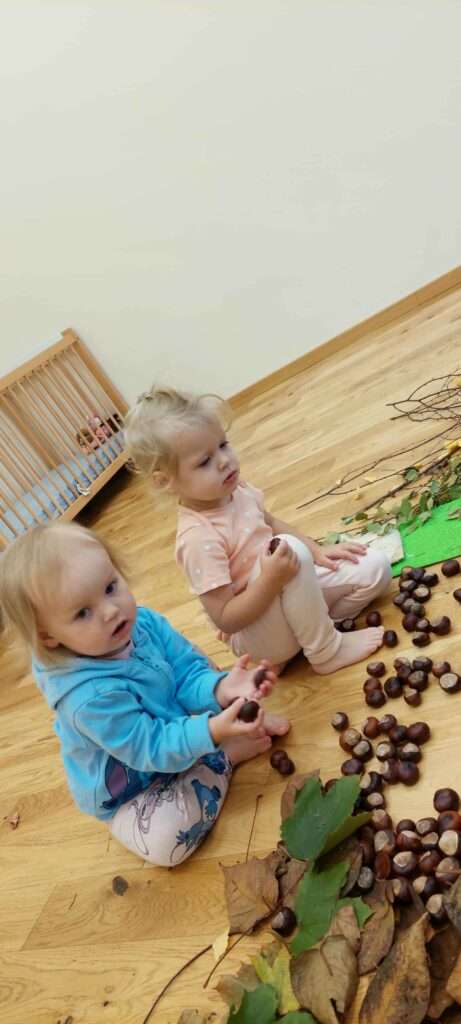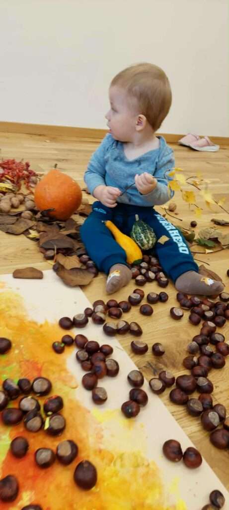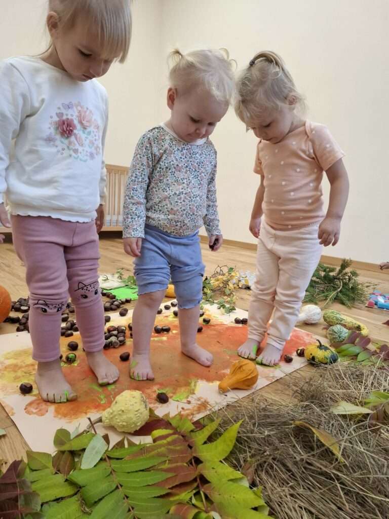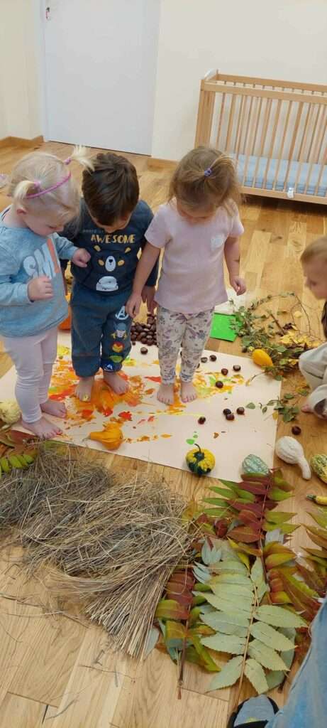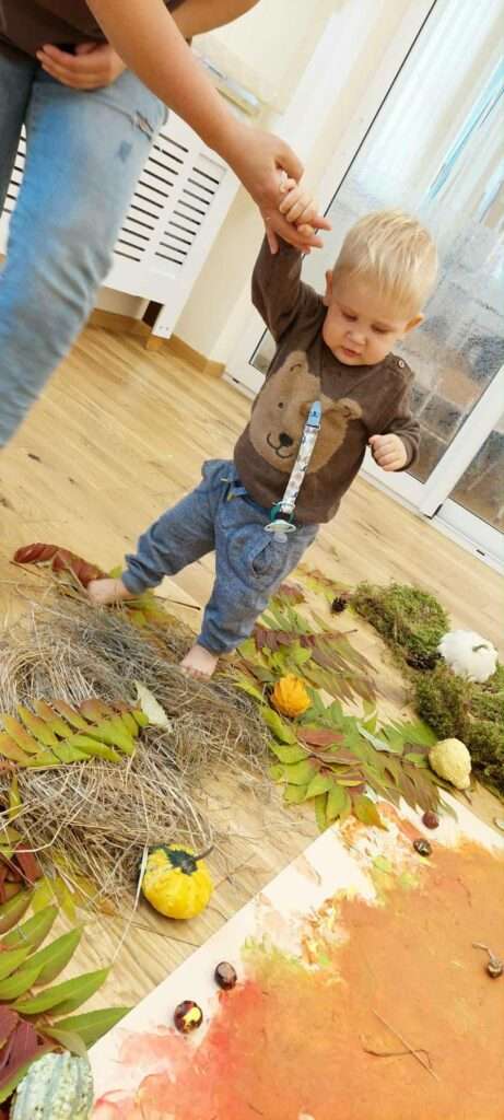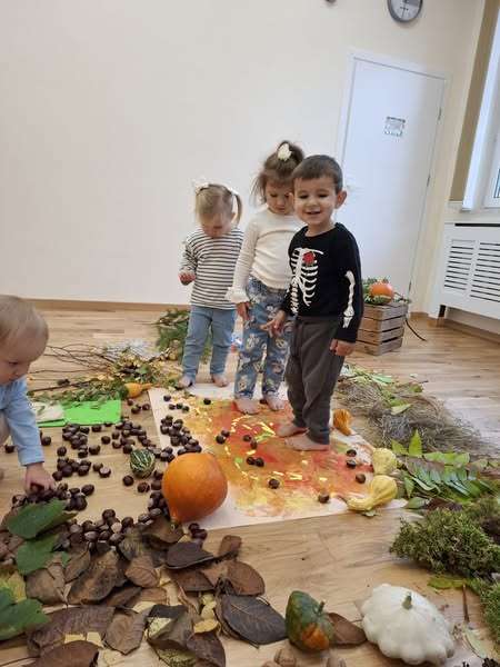 Nasze maluszki z ogromnym zaangażowaniem spacerowały po jesiennej dróżce wypełnionej liśćmi, kasztanami, żołędziami i miękkim mchem. To była prawdziwa uczta dla zmysłów – dużo śmiechu, ciekawości i radości z odkrywania różnych faktur i dźwięków natury. ![]()