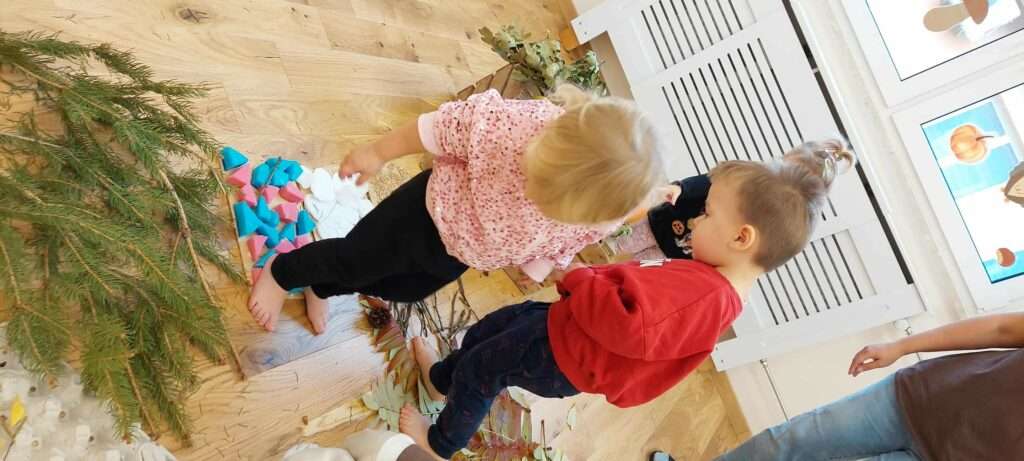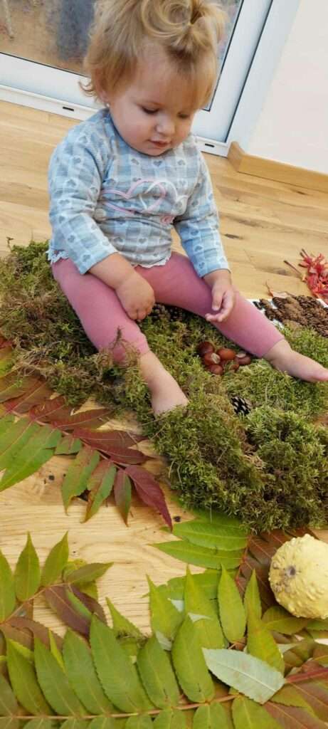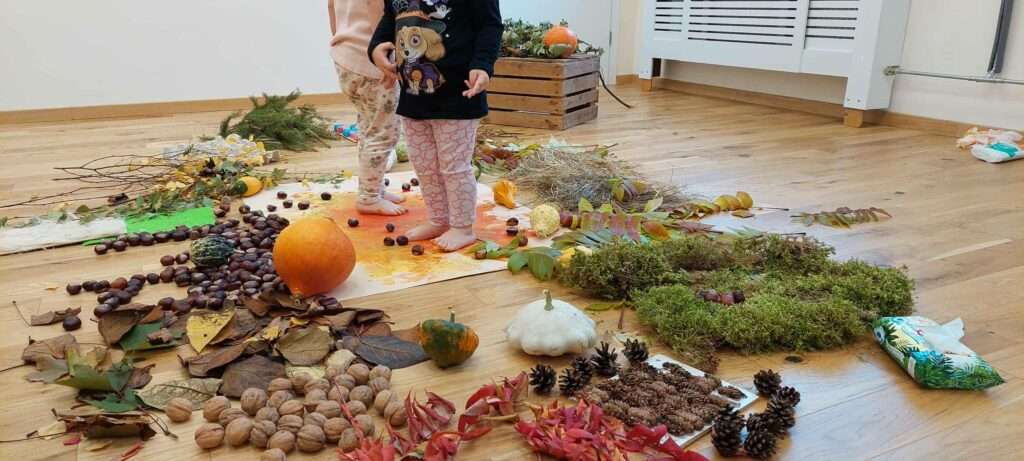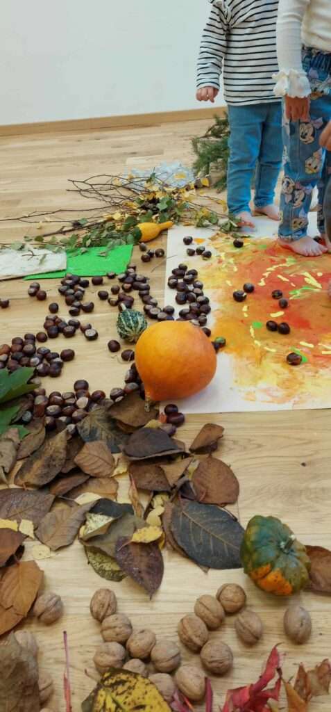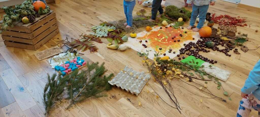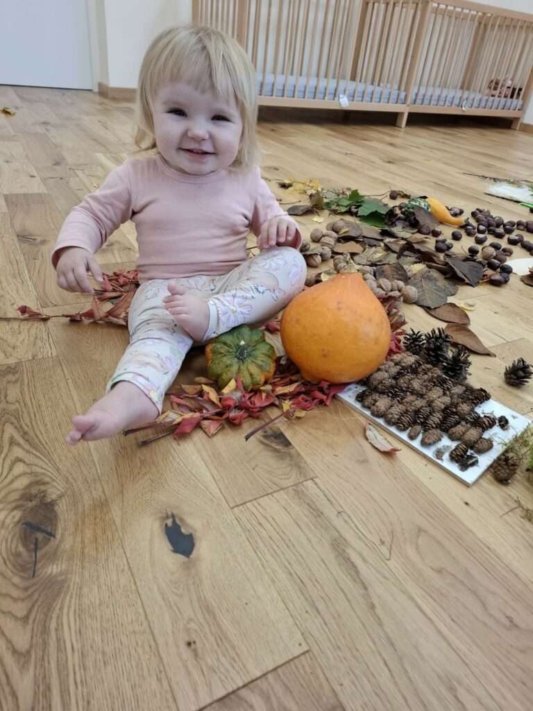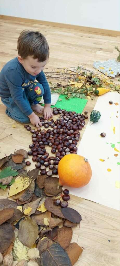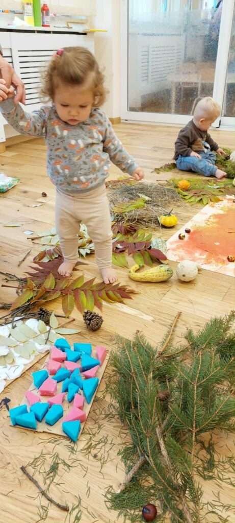 Nasze maluszki z ogromnym zaangażowaniem spacerowały po jesiennej dróżce wypełnionej liśćmi, kasztanami, żołędziami i miękkim mchem. To była prawdziwa uczta dla zmysłów – dużo śmiechu, ciekawości i radości z odkrywania różnych faktur i dźwięków natury. ![]()