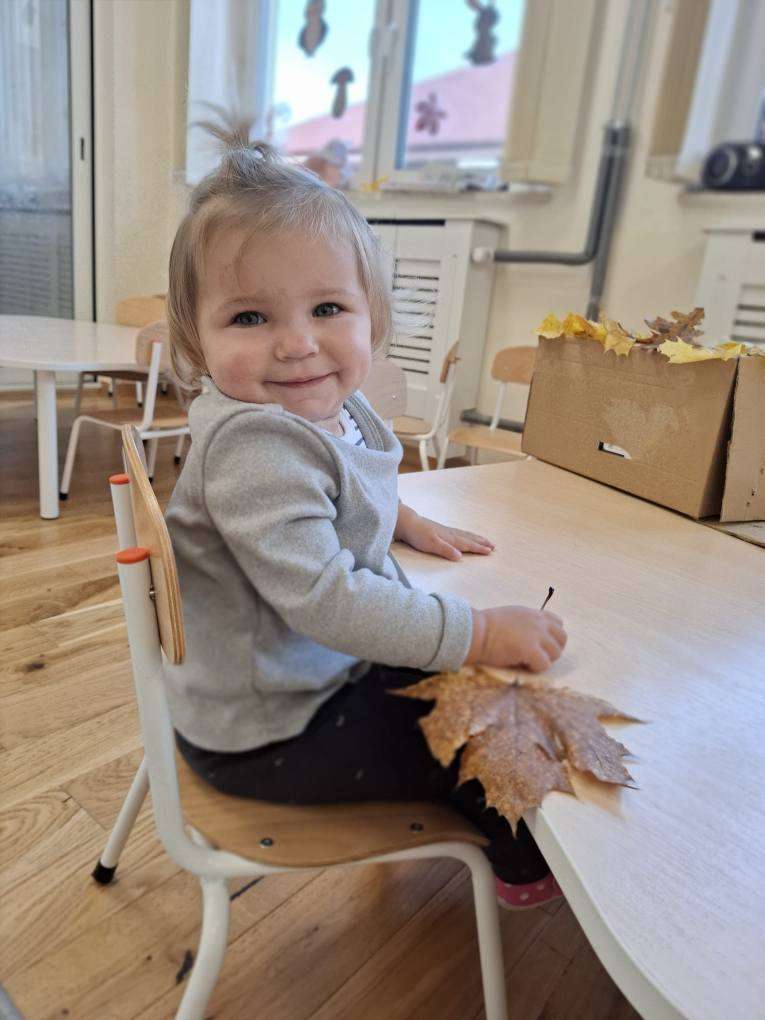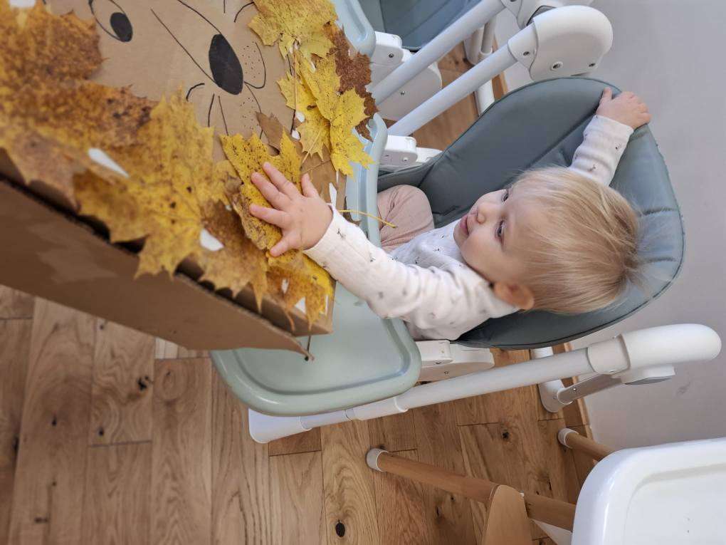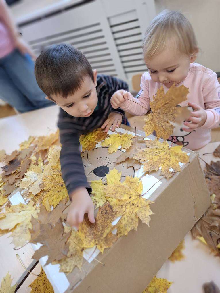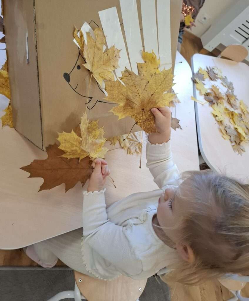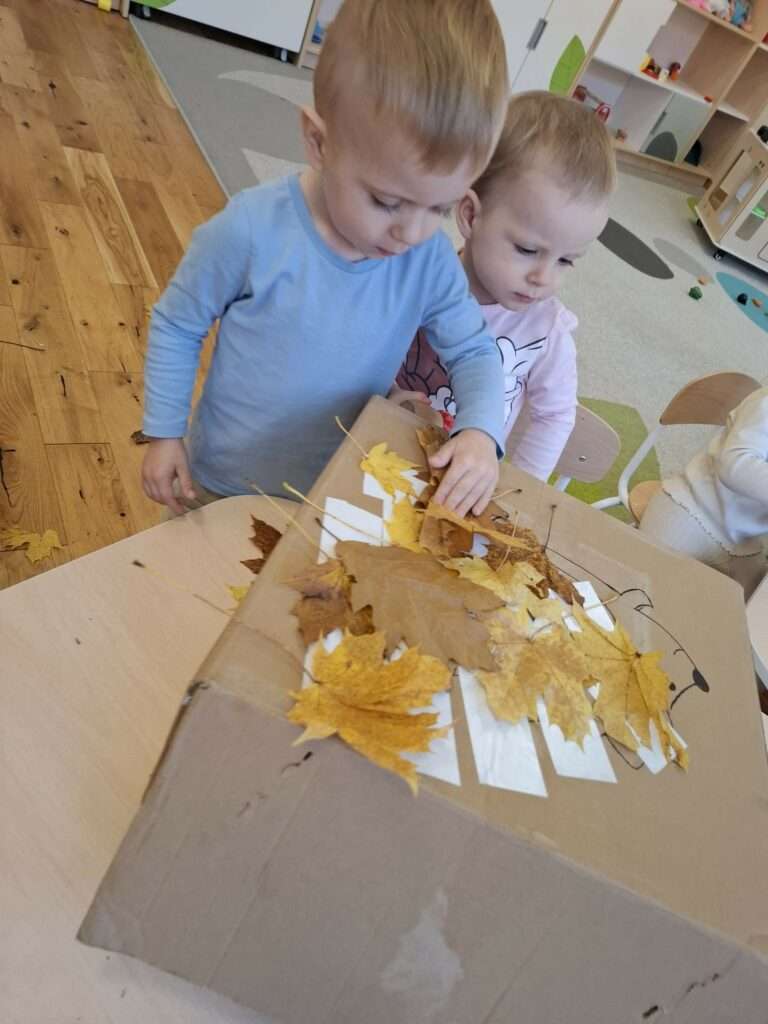 Dzieci z wielkim zaangażowaniem przyklejały liście do przygotowanych wzorów, tworząc wyjątkowe prace plastyczne. Każda z nich była pełna barw i dziecięcej wyobraźni.