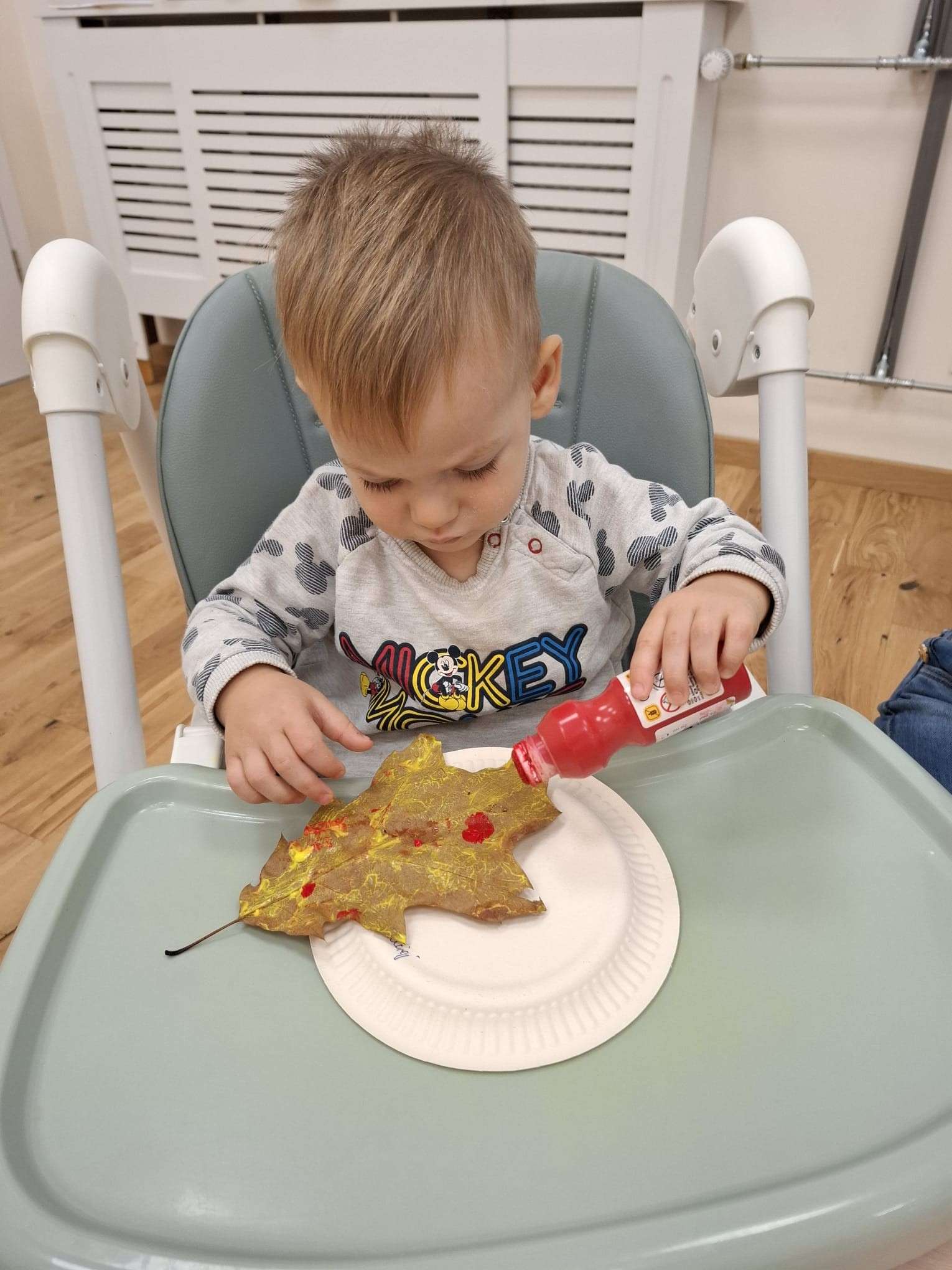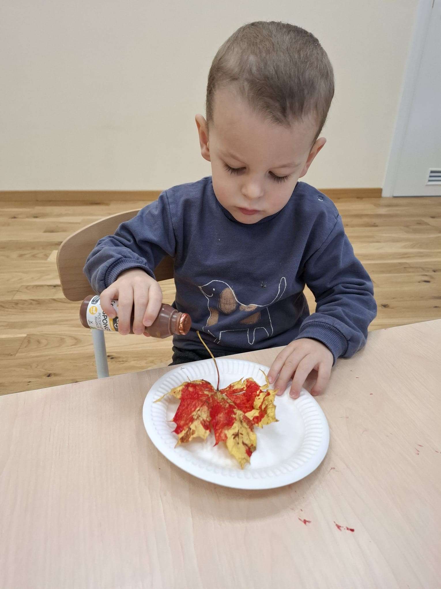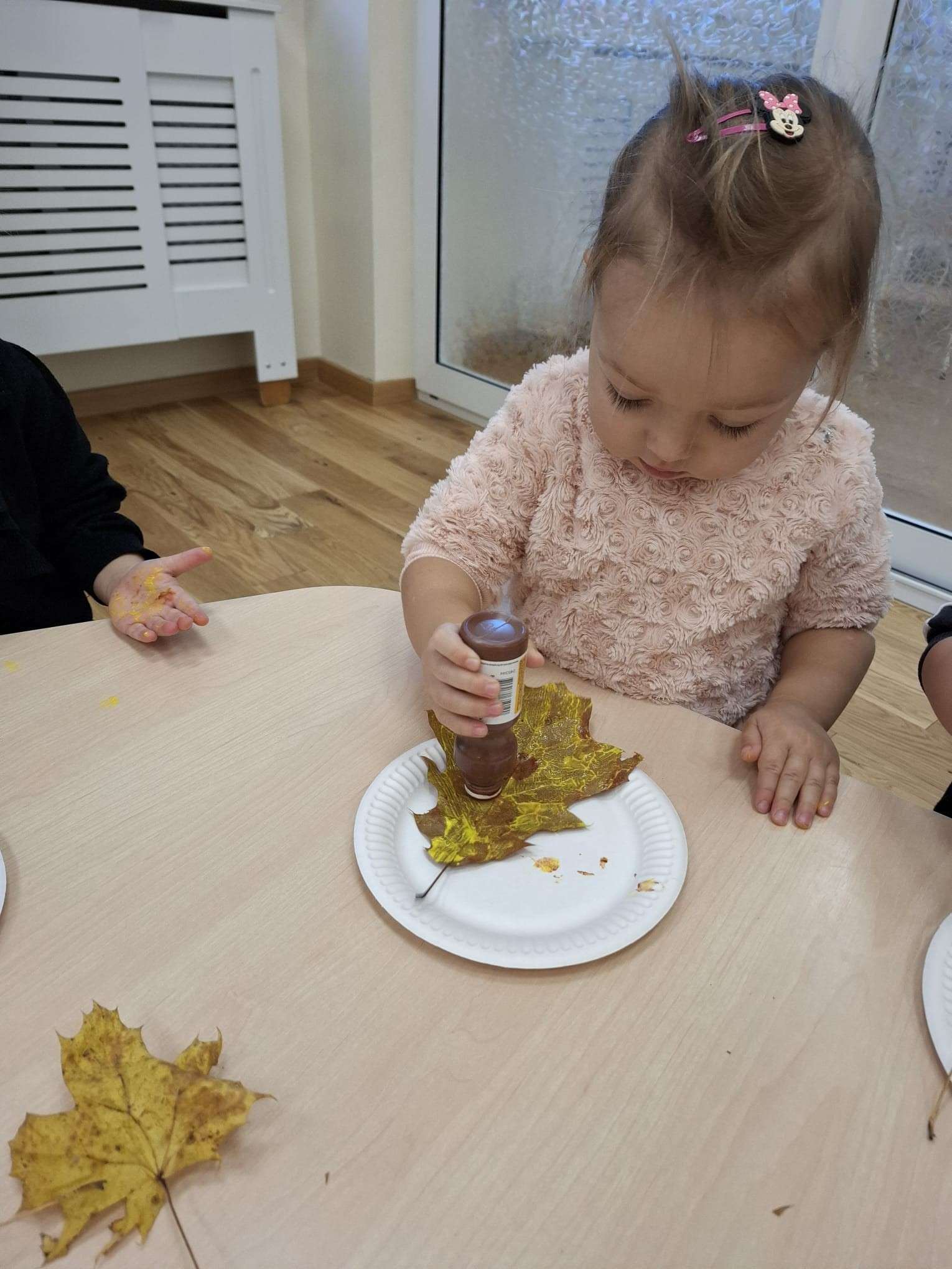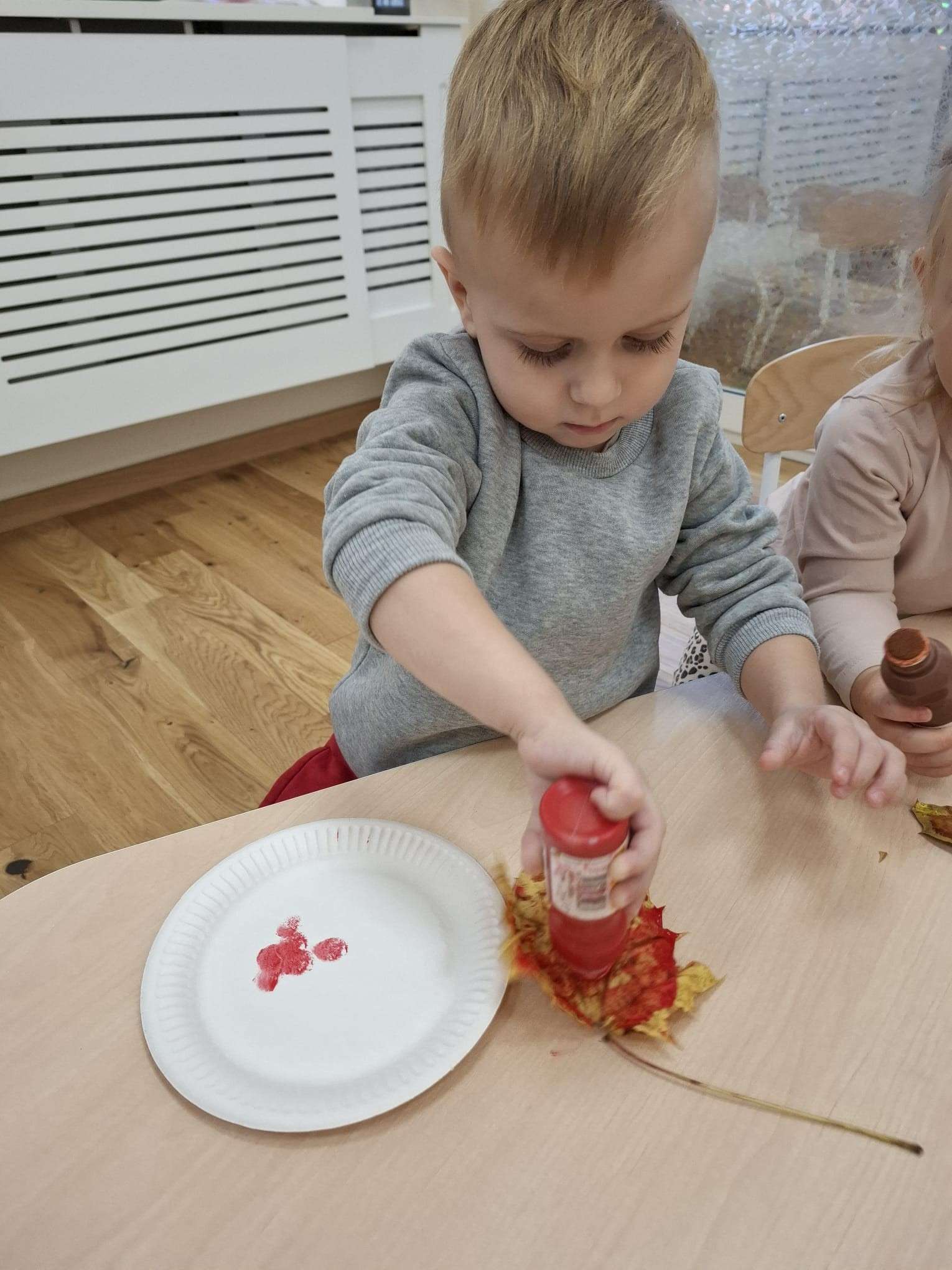 Dzieci malowały jesienne liście kolorowymi farbami, a następnie odbijały je na papierowych talerzykach, tworząc niepowtarzalne, barwne kompozycje