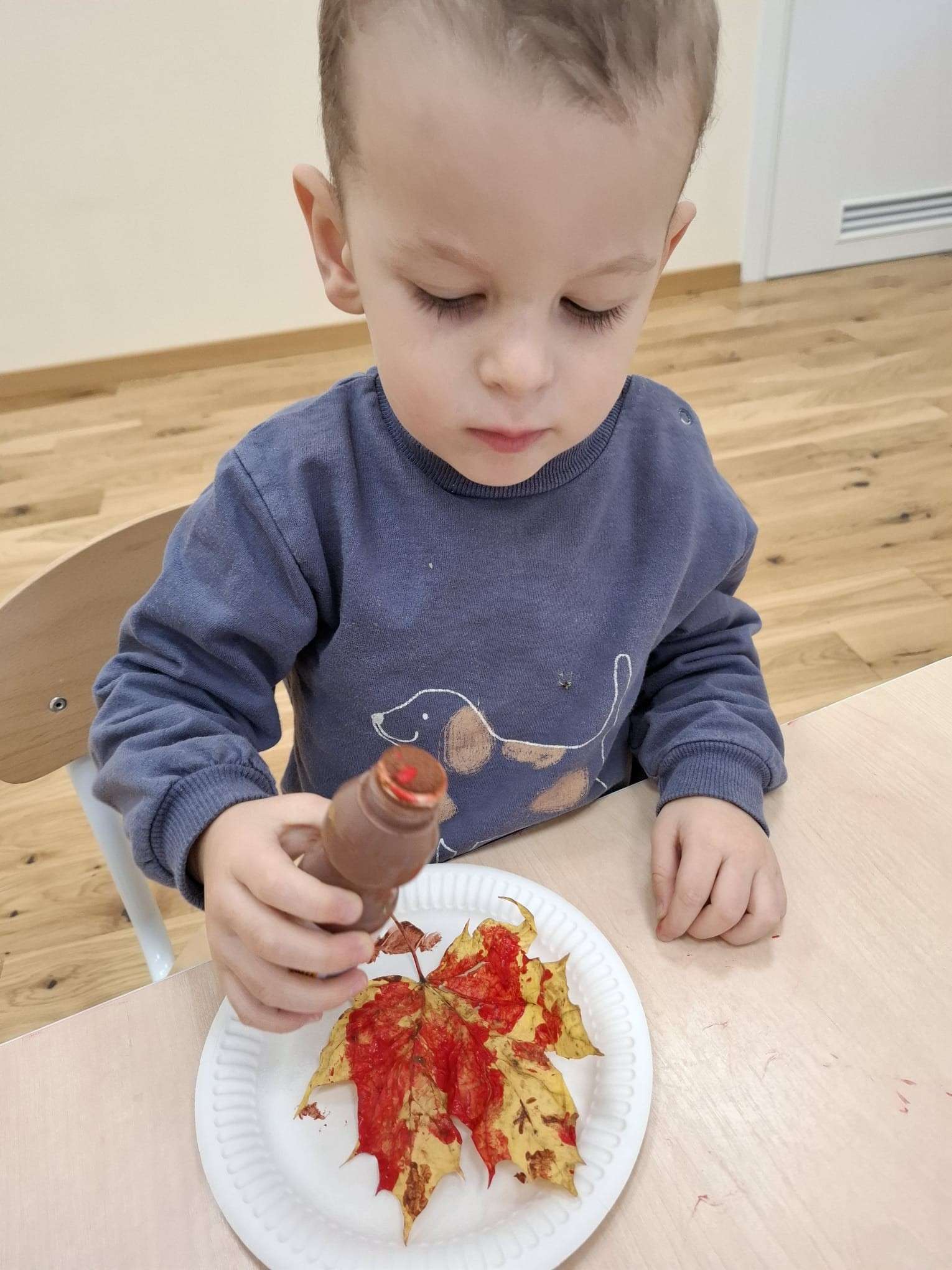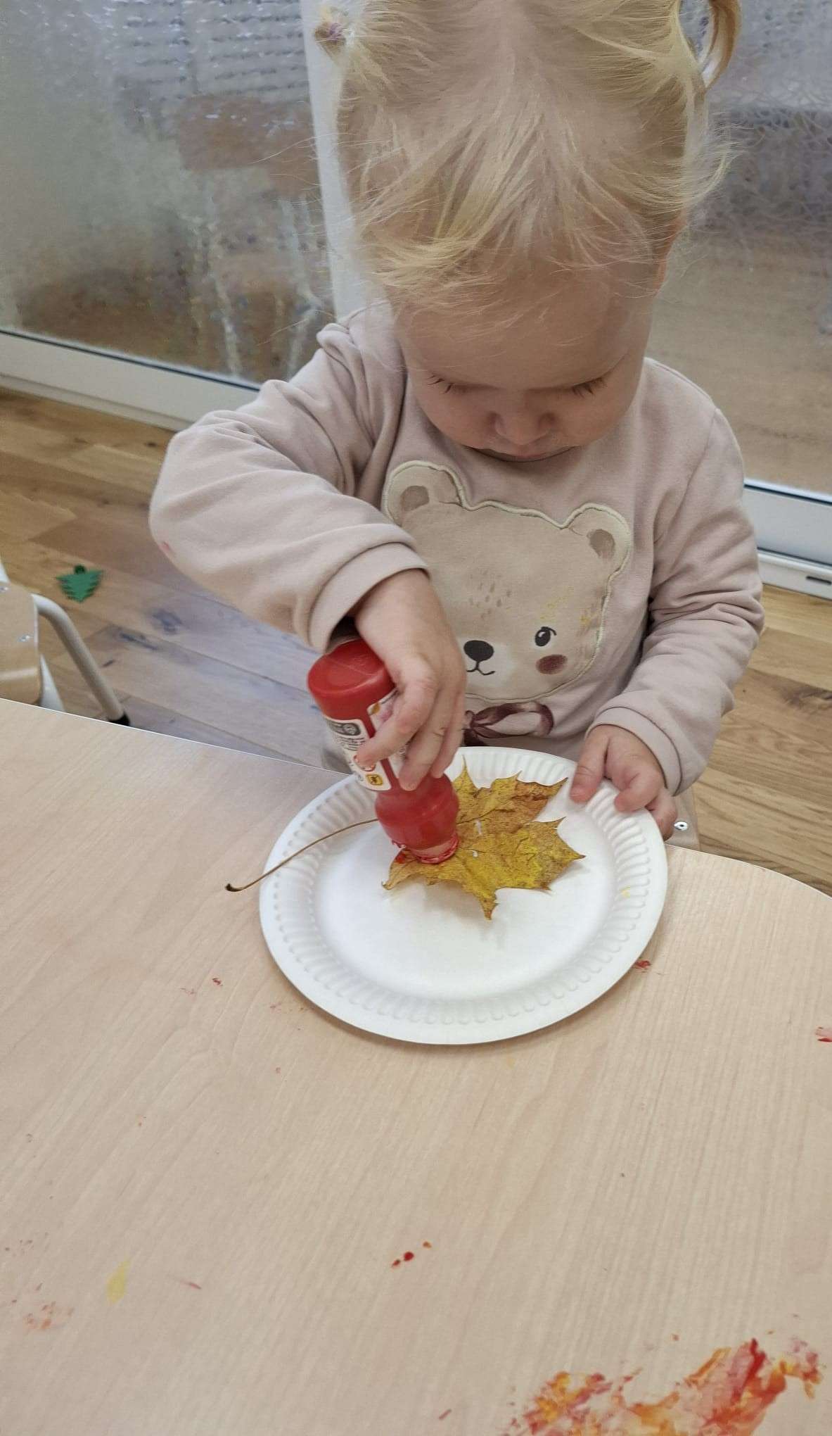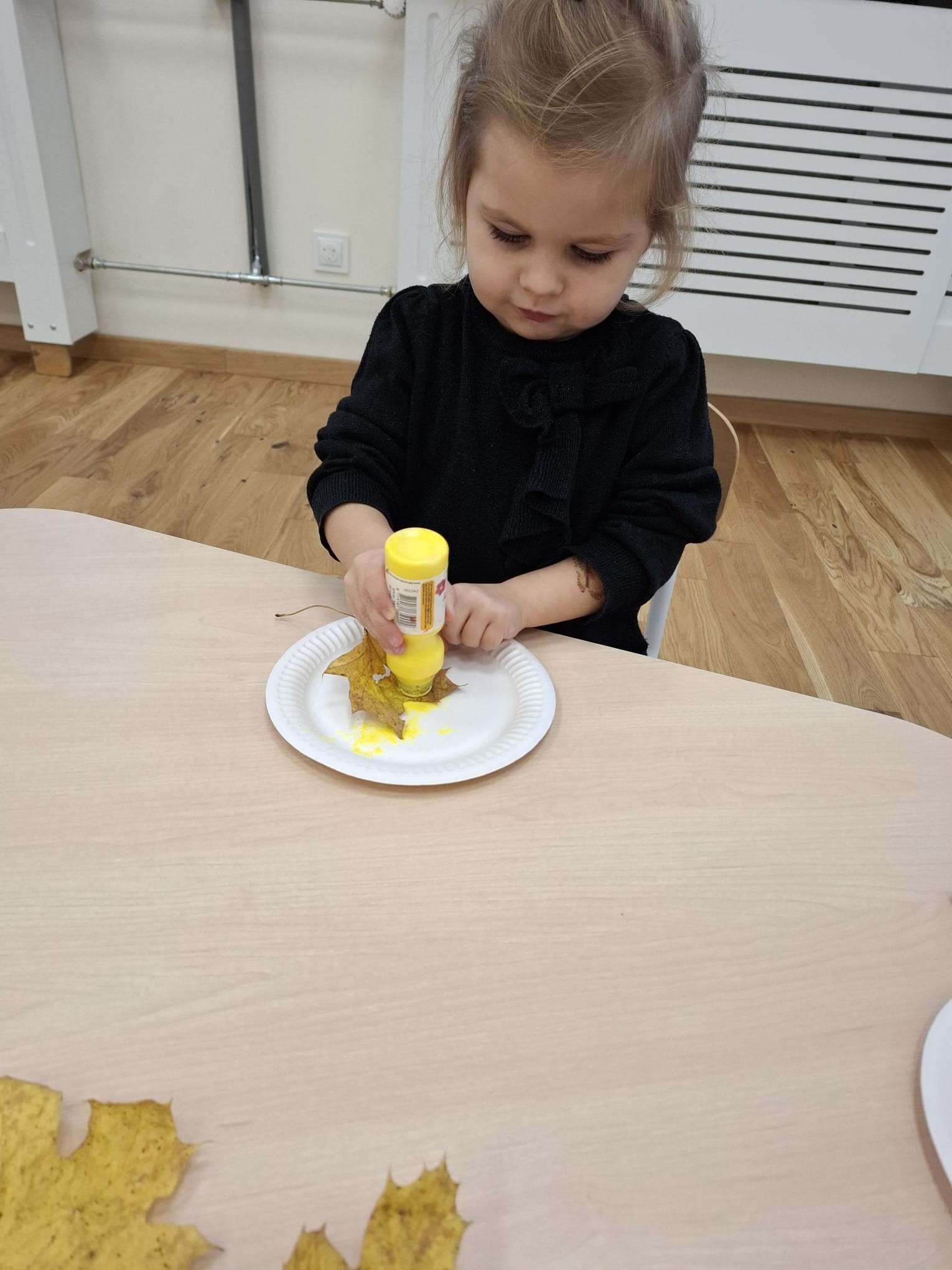 Dzieci malowały jesienne liście kolorowymi farbami, a następnie odbijały je na papierowych talerzykach, tworząc niepowtarzalne, barwne kompozycje