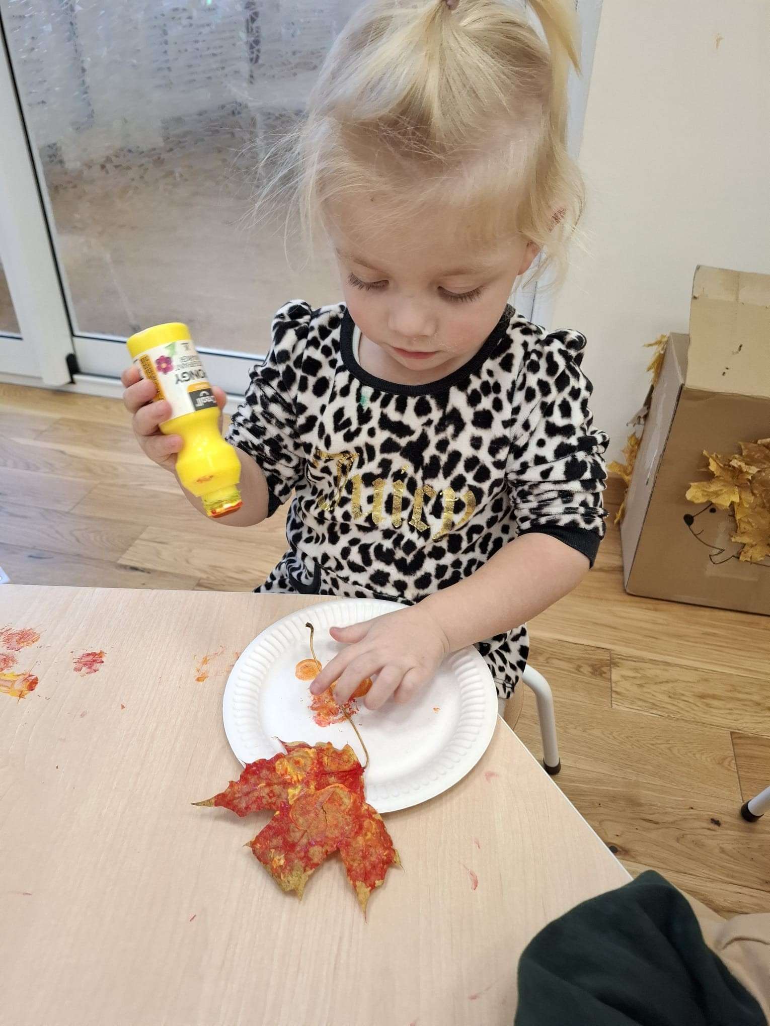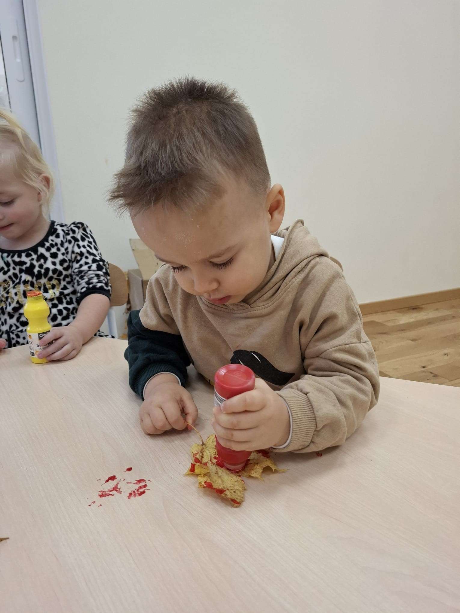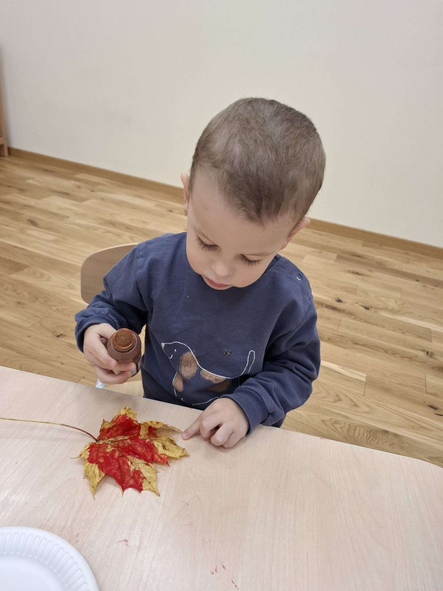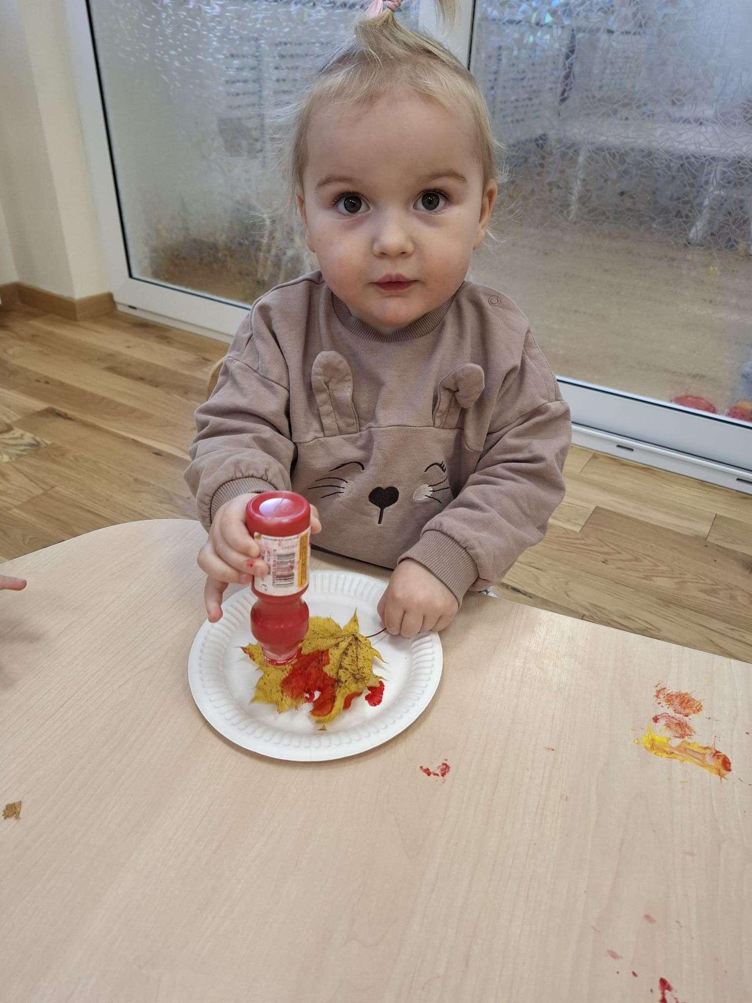 Dzieci malowały jesienne liście kolorowymi farbami, a następnie odbijały je na papierowych talerzykach, tworząc niepowtarzalne, barwne kompozycje