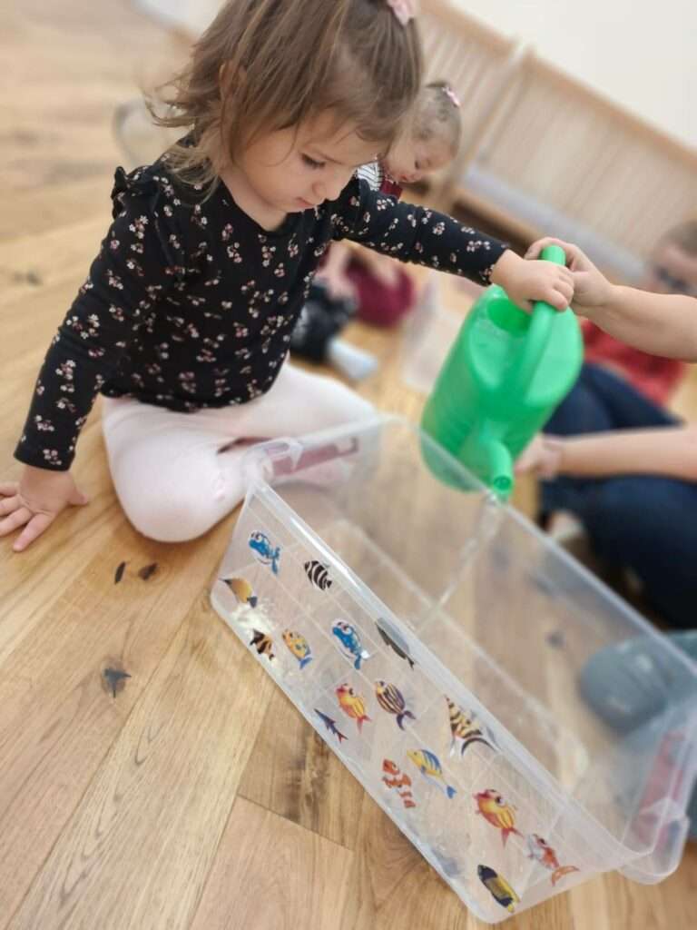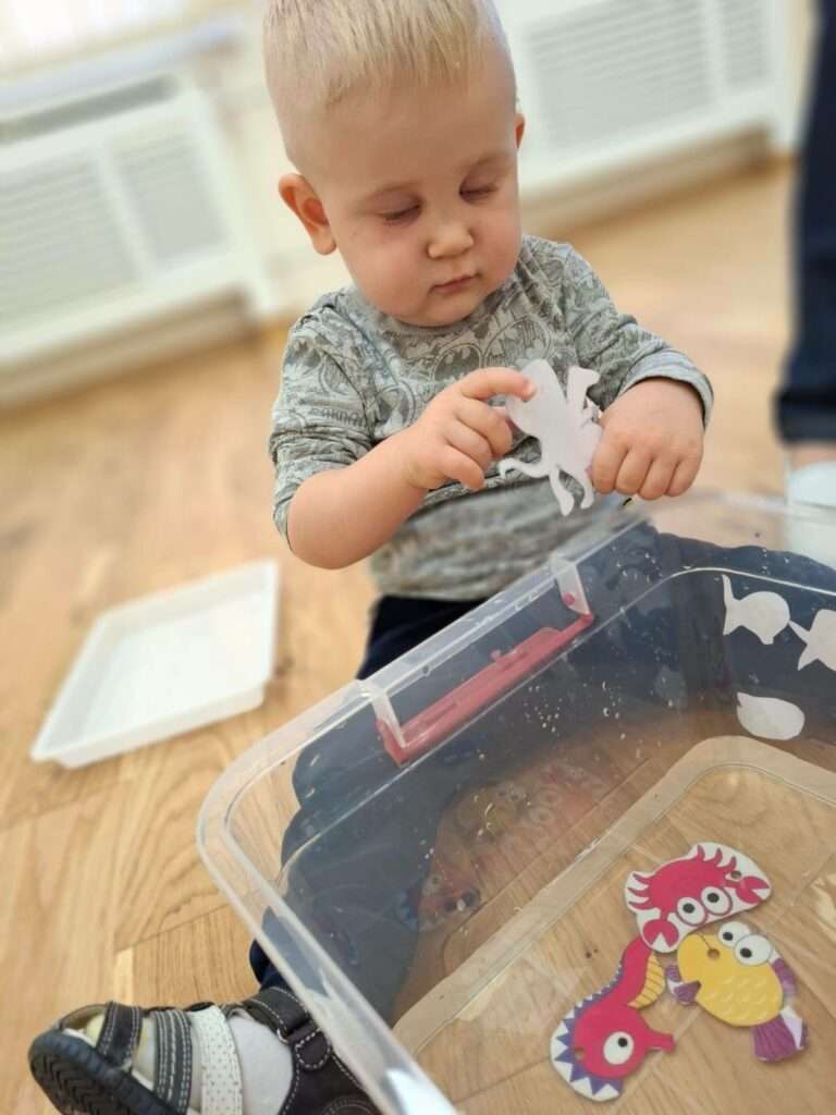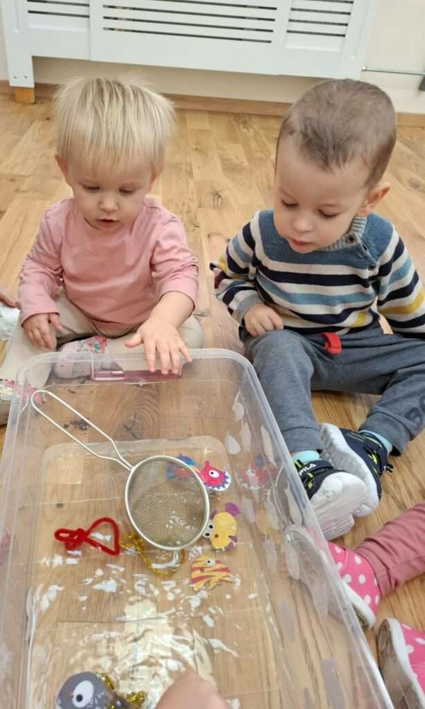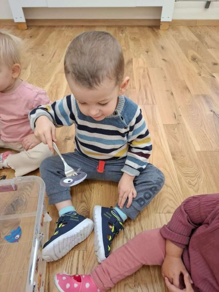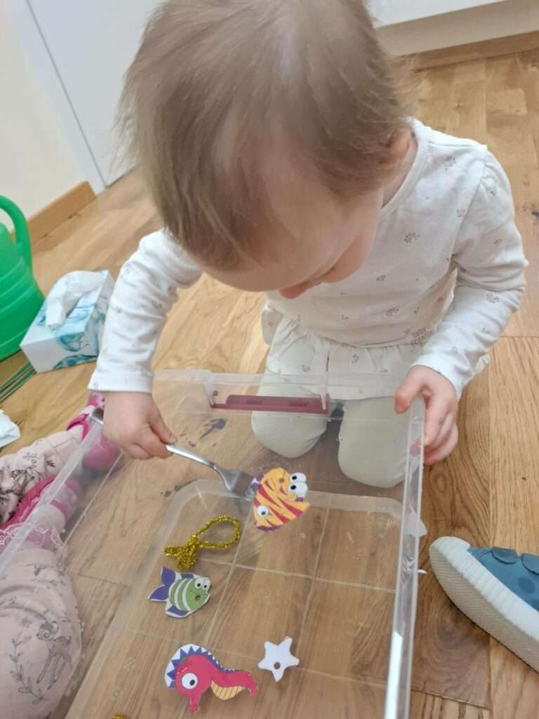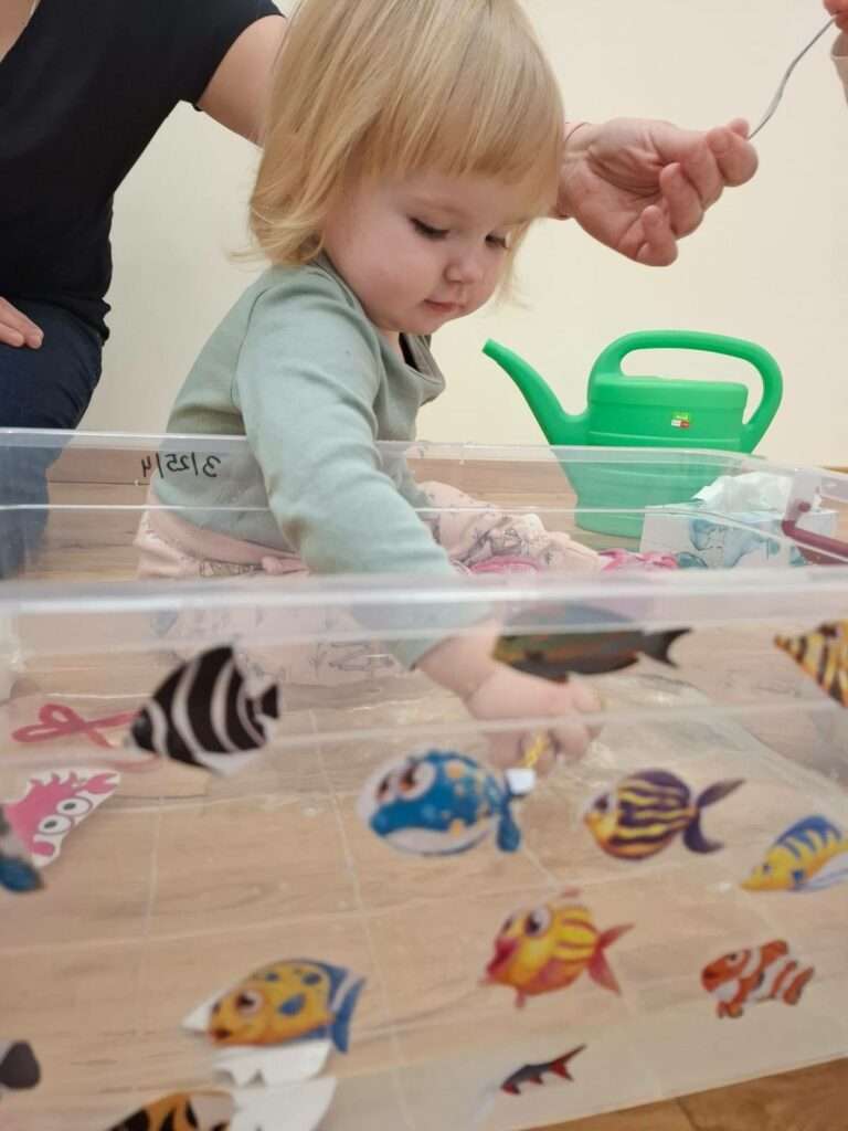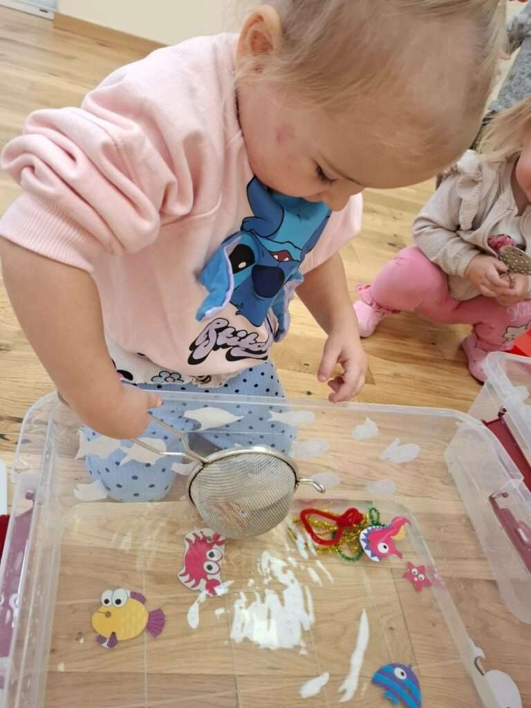 W naszym żłobku przenieśliśmy się nad wodę, a dzieci zamieniły się w małych rybaków. Na początku maluchy próbowały odgadnąć, które rybki pływają na wodzie, a które w wodzie – to była doskonała okazja do ćwiczenia spostrzegawczości i logicznego myślenia. ![]()