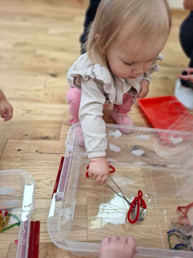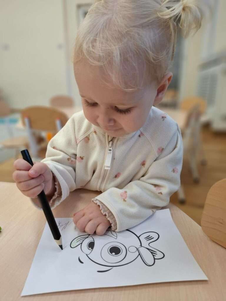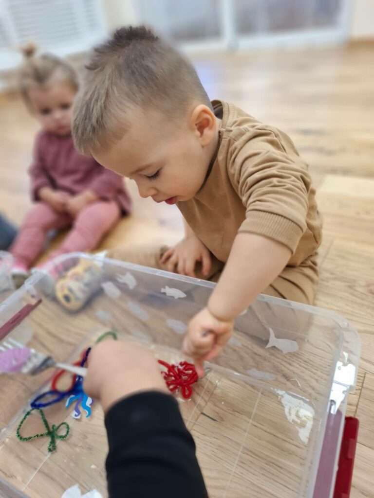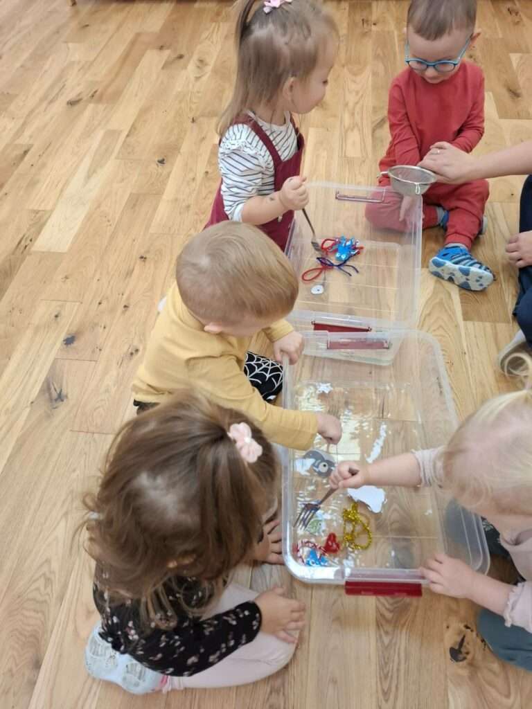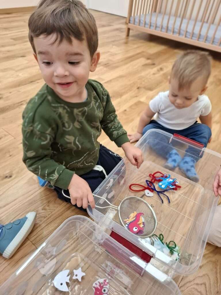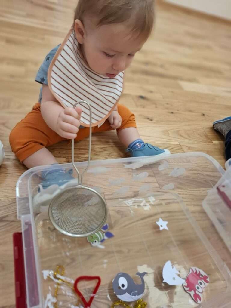 W naszym żłobku przenieśliśmy się nad wodę, a dzieci zamieniły się w małych rybaków. Na początku maluchy próbowały odgadnąć, które rybki pływają na wodzie, a które w wodzie – to była doskonała okazja do ćwiczenia spostrzegawczości i logicznego myślenia. ![]()