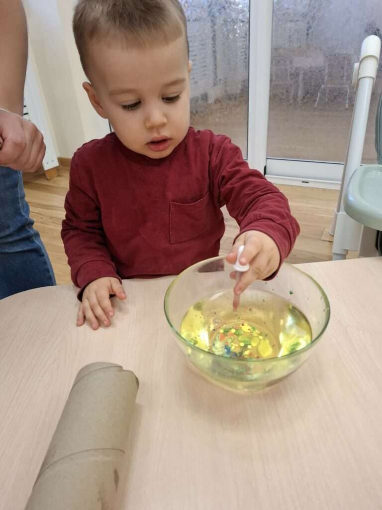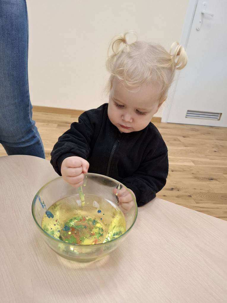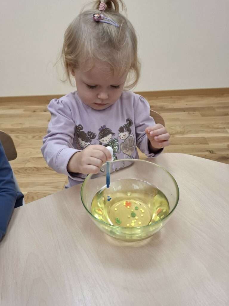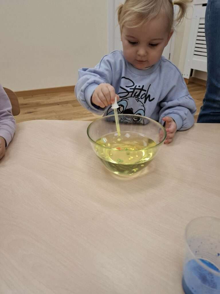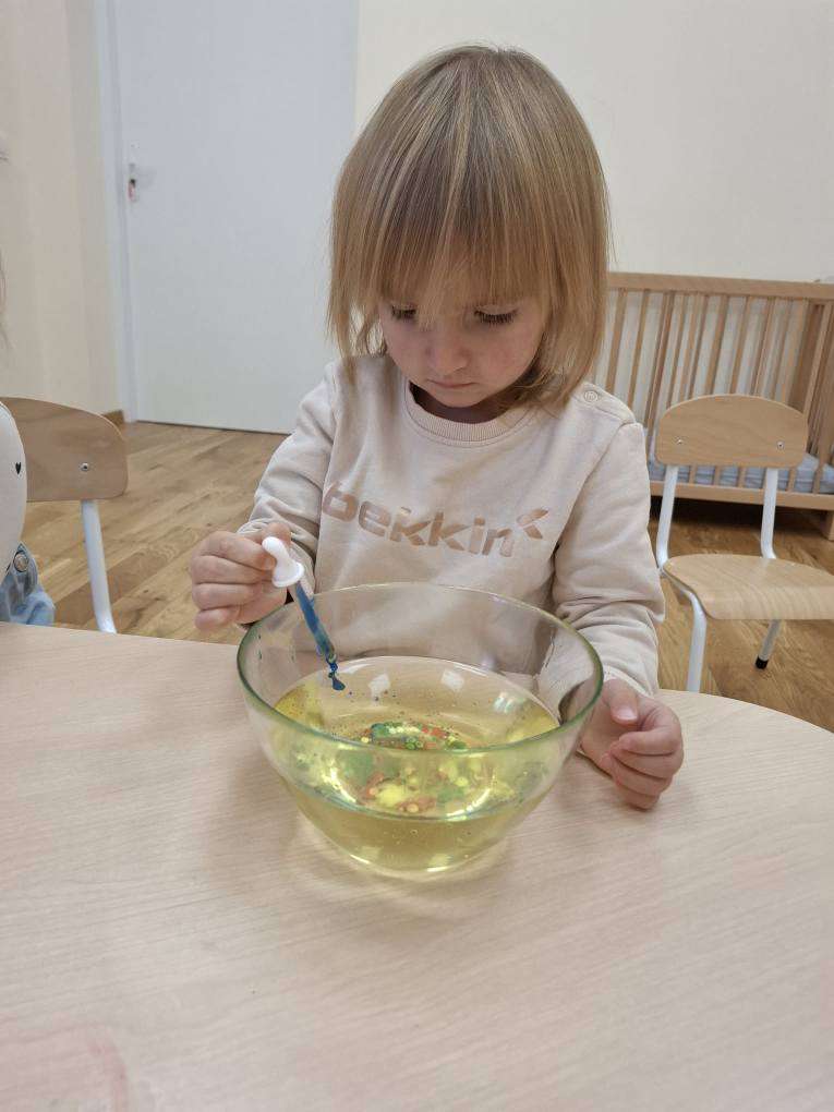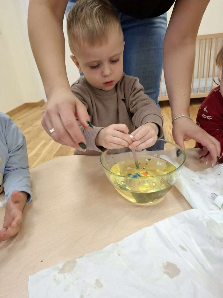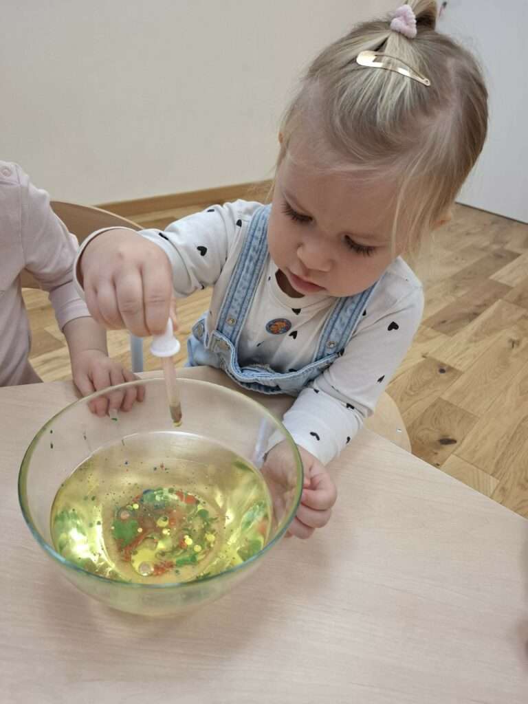 Dzieci badały, co się stanie, gdy połączymy olej, mleko i barwniki. Z pomocą pipet tworzyły kolorowe wzory i obserwowały, jak barwy tańczą na powierzchni. ![]()