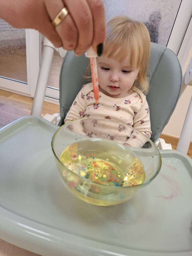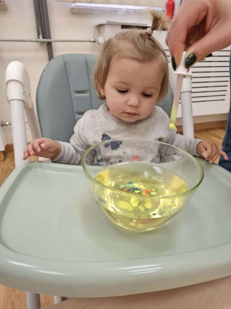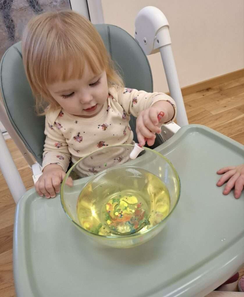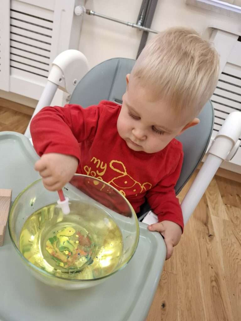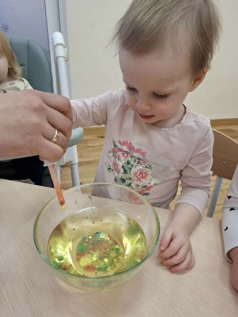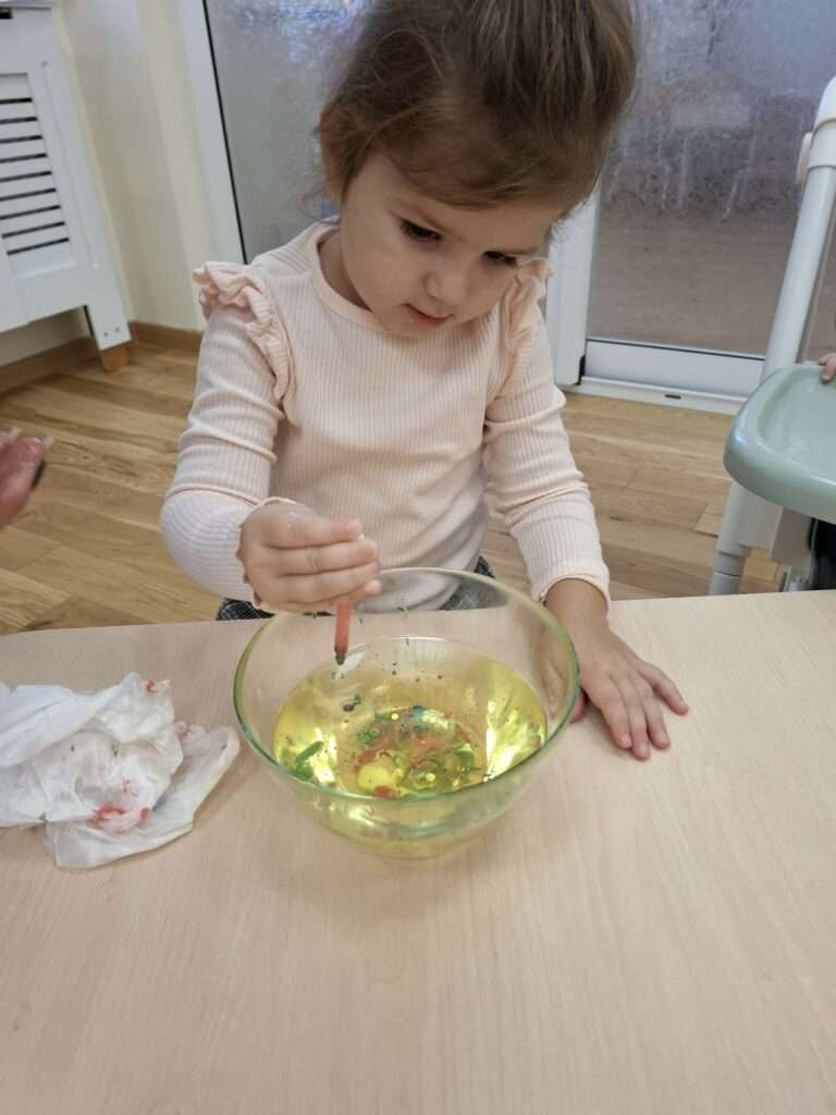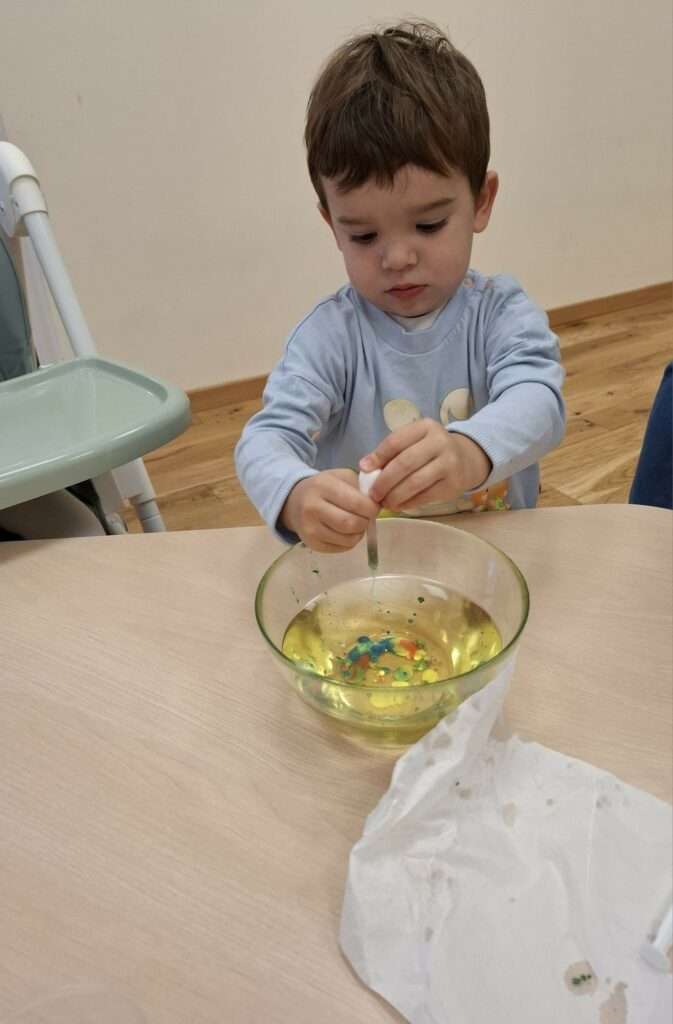 Dzieci badały, co się stanie, gdy połączymy olej, mleko i barwniki. Z pomocą pipet tworzyły kolorowe wzory i obserwowały, jak barwy tańczą na powierzchni. ![]()