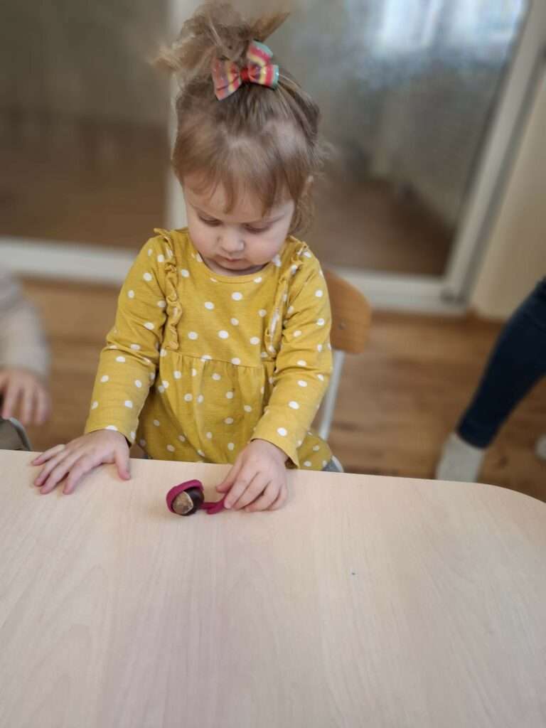 W naszej sali zrobiło się bardzo kreatywnie. Z kasztanów i plasteliny powstały urocze ślimaki – kasztany stały się ich skorupkami, a plastelina posłużyła do ulepienia kolorowych korpusów.![]()