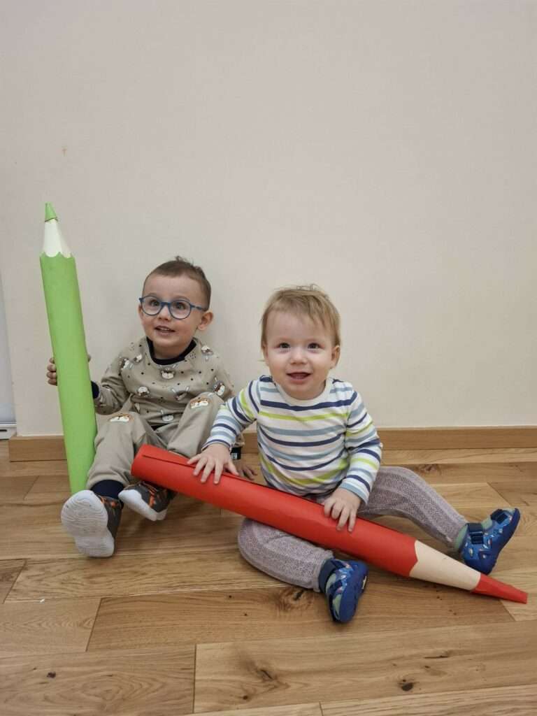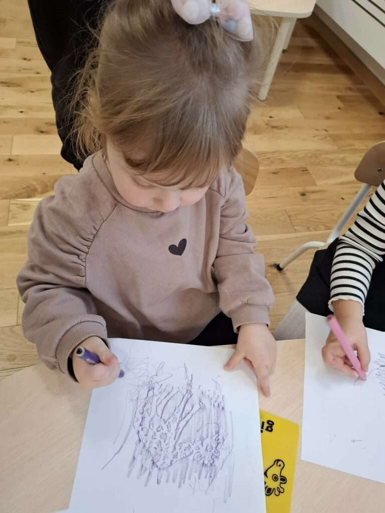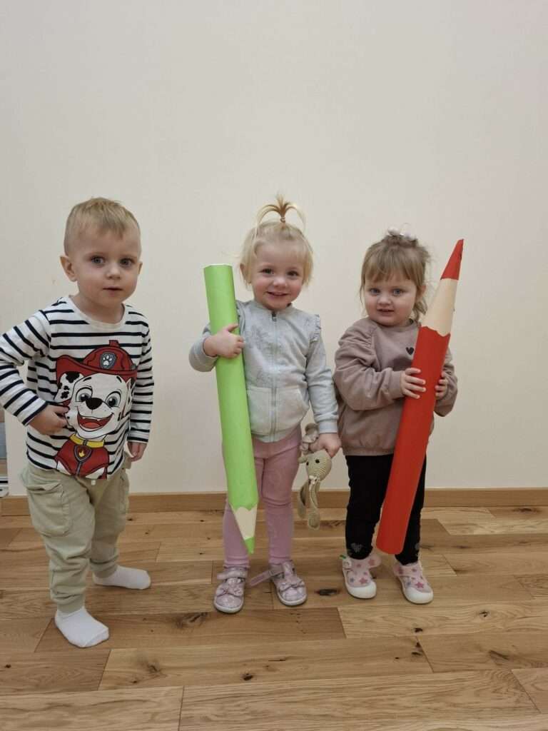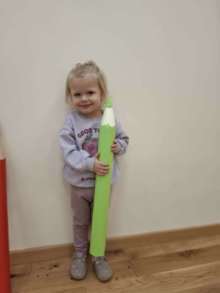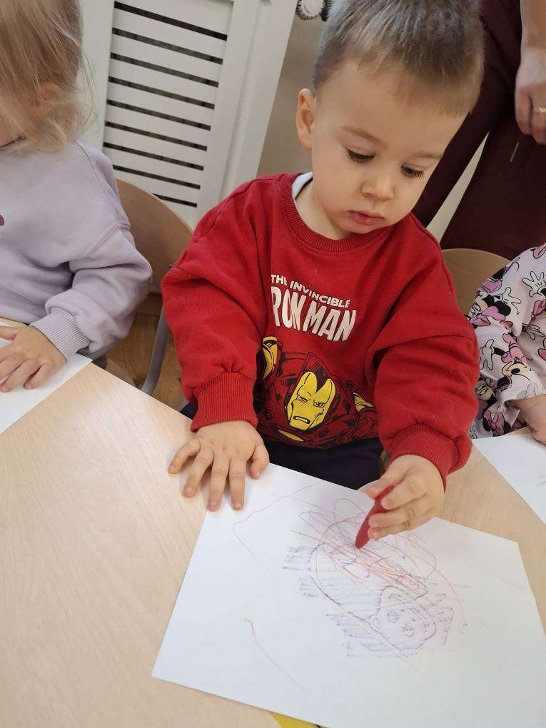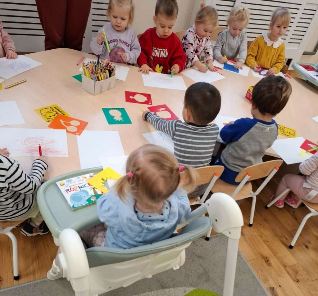 Świętowaliśmy kolorowy Dzień Kredki. Przy dźwiękach piosenki „Kolorowe kredki” nasze maluszki z radością zasiadły do stolików, gotowe do twórczej zabawy.
