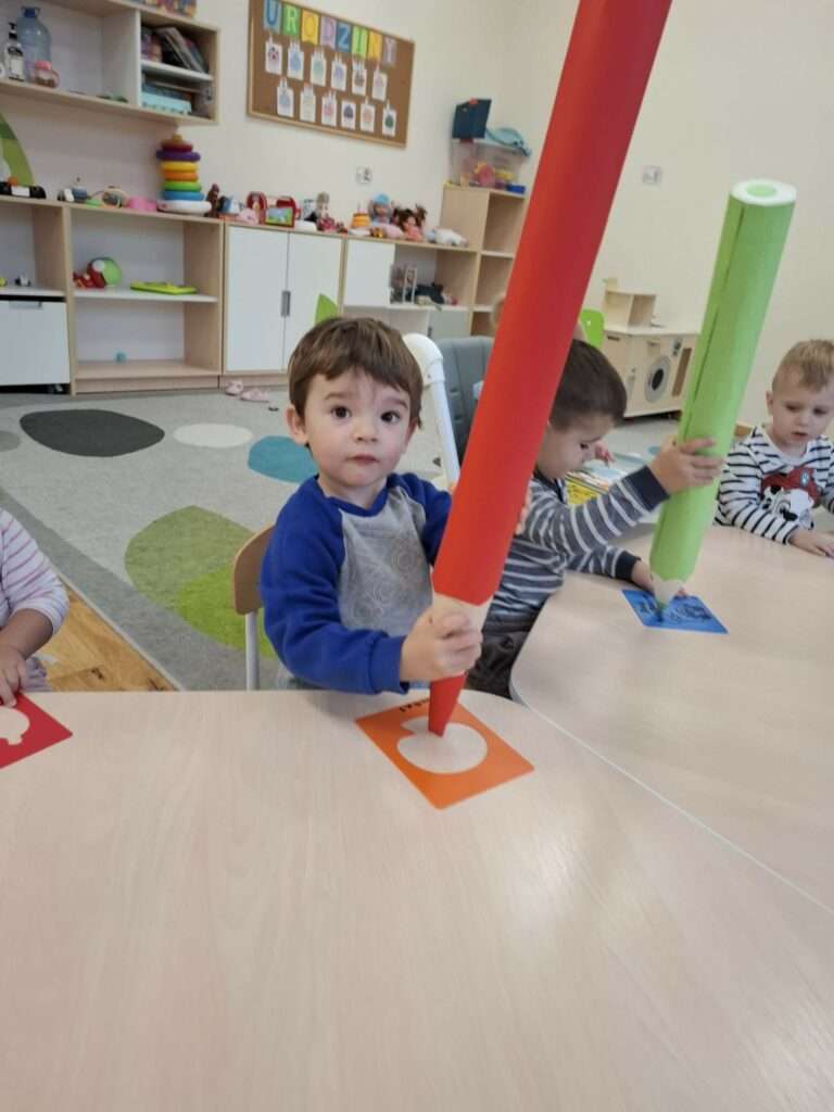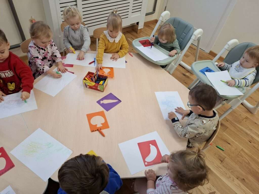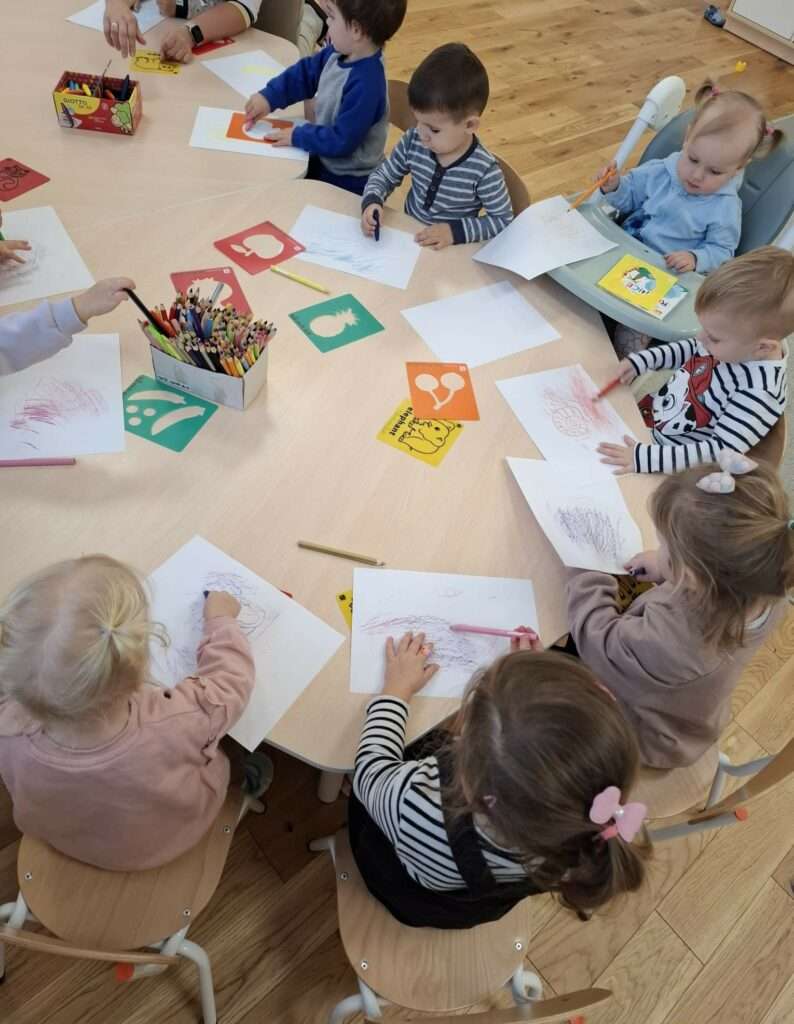 Dzieci korzystały z różnych rodzajów kredek – grubych, cienkich, świecowych i ołówkowych – aby odrysowywać kształty przedmiotów i zwierzątek na białych kartkach papieru. Pomagały im w tym specjalne szablony do odwzorowywania, które wywołały mnóstwo uśmiechów i zachęciły do cierpliwej pracy rączkami. Powstały przepiękne, kolorowe prace pełne dziecięcej wyobraźni.![]()