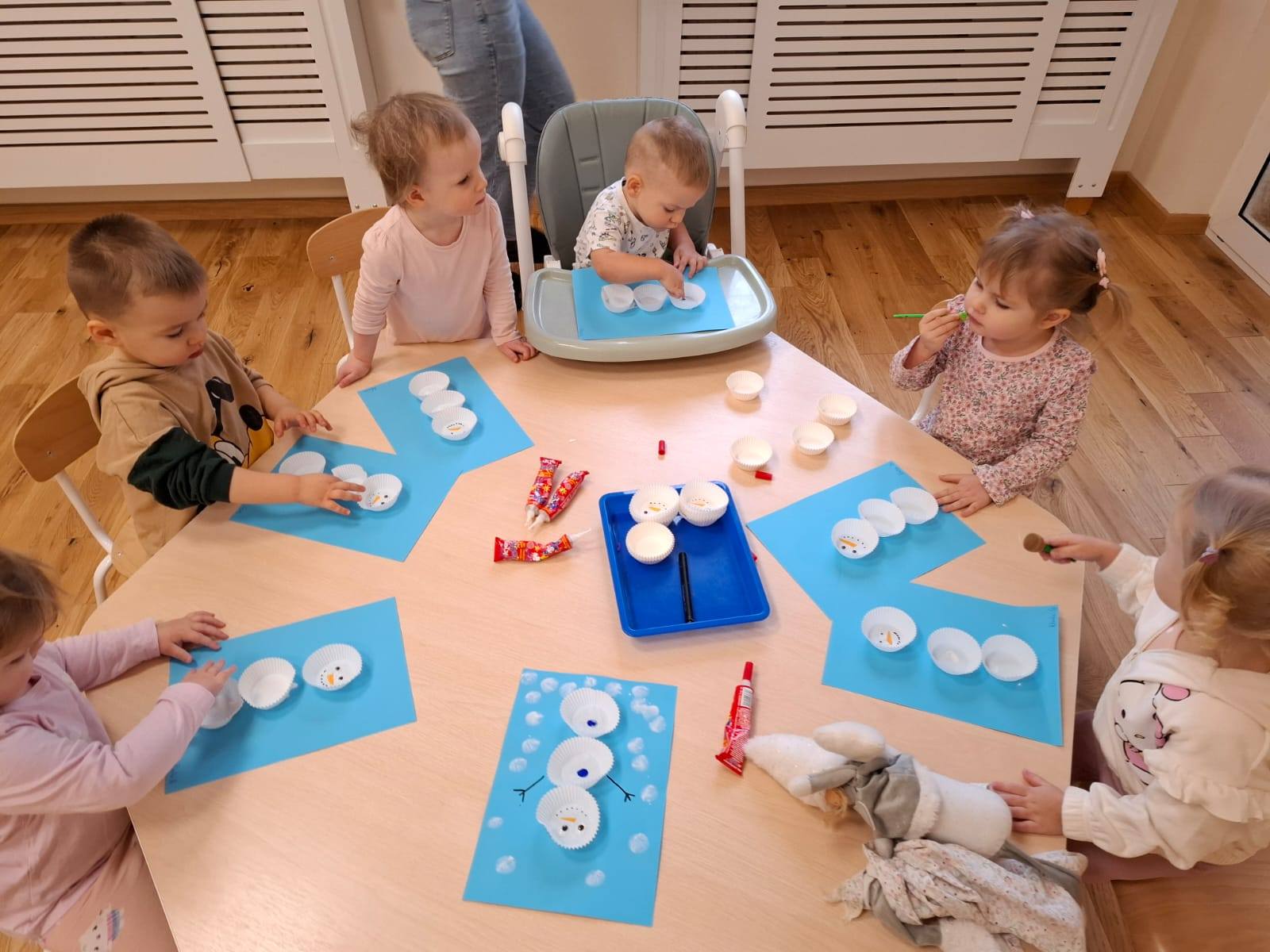 W ten zimowy dzień nasze maluszki zamieniły się w małych artystów. Na stolikach przygotowana została przestrzeń do twórczych działań w zimowych barwach, a dzieci z radością rozprowadzały i