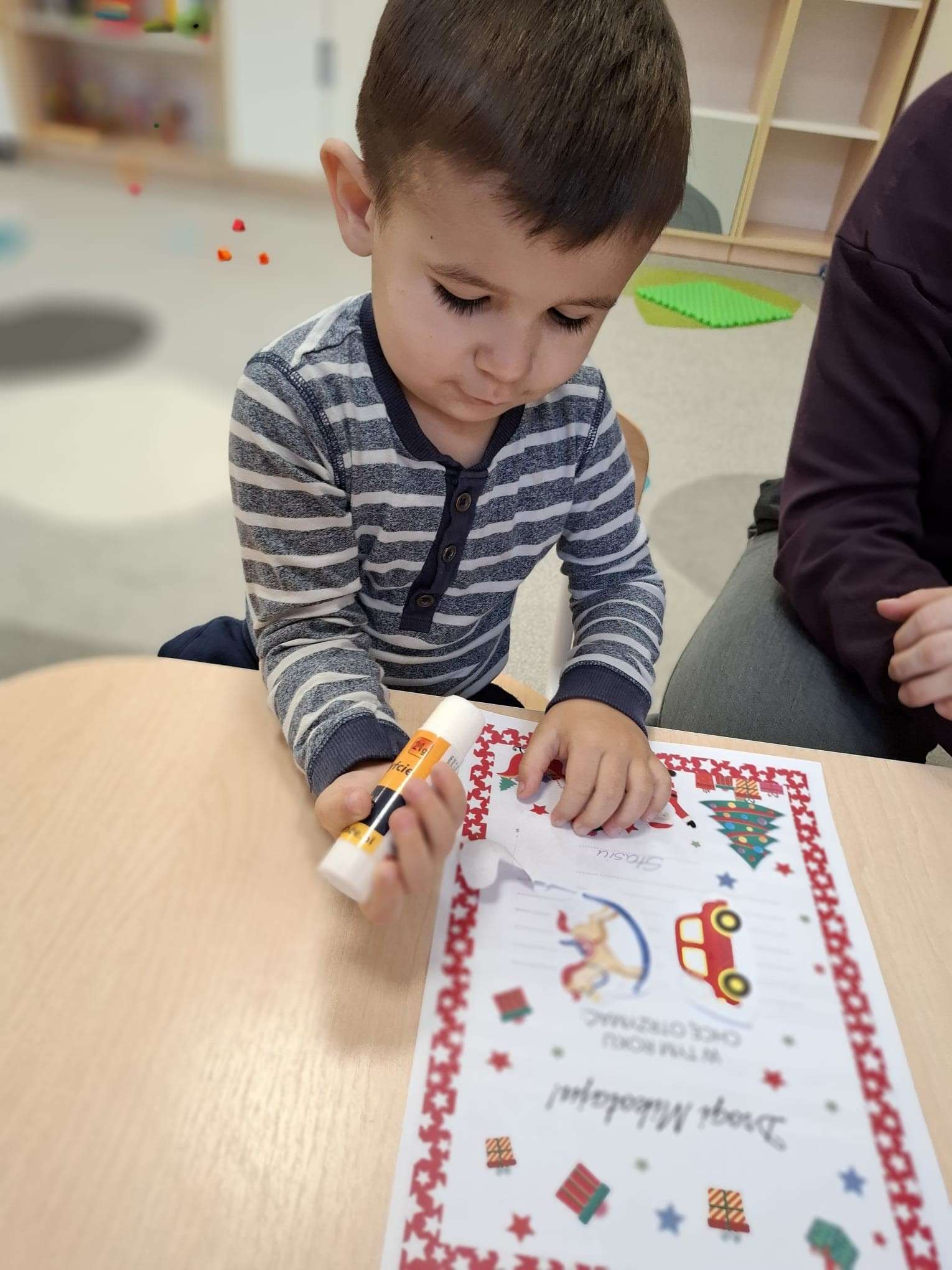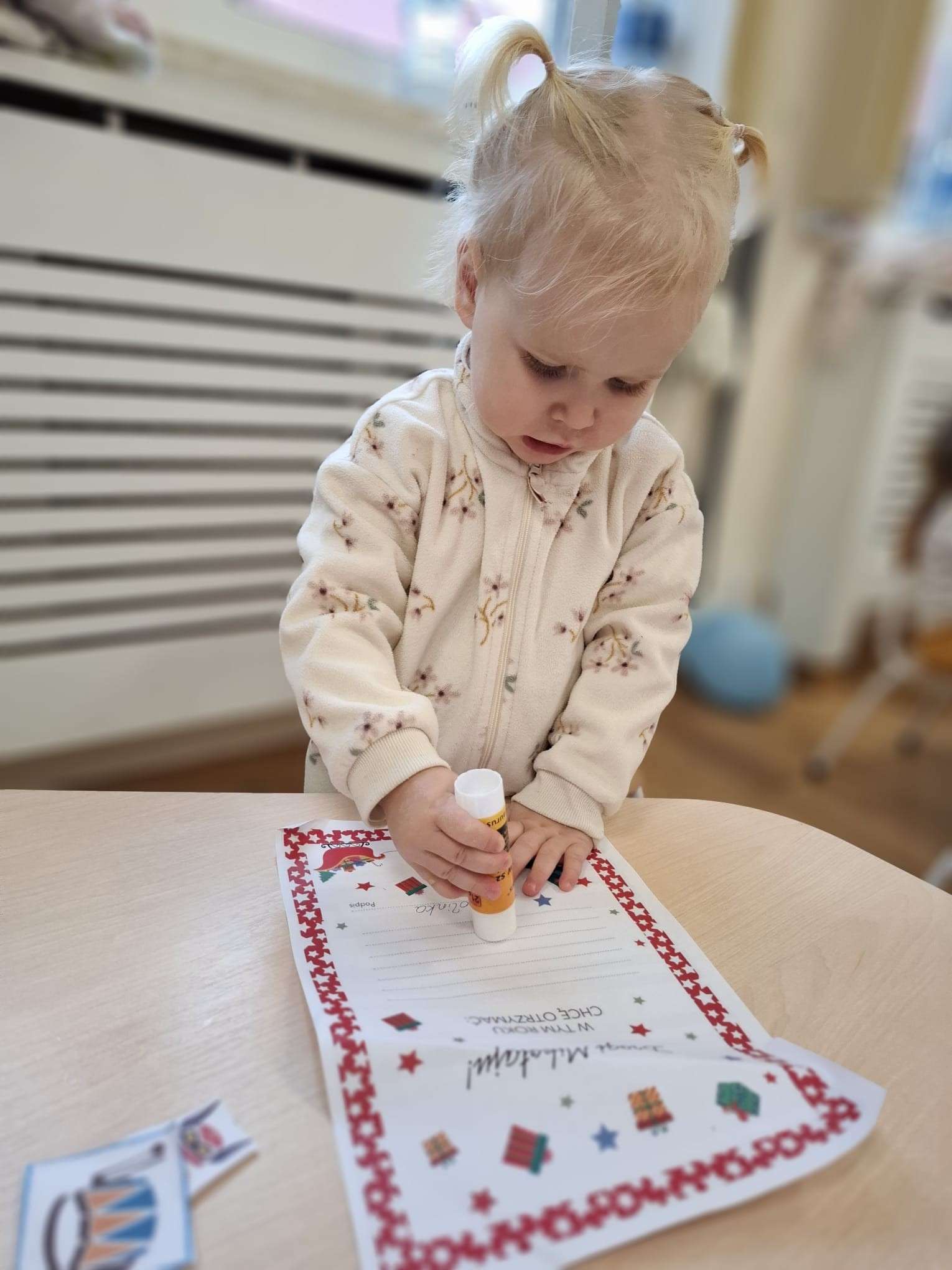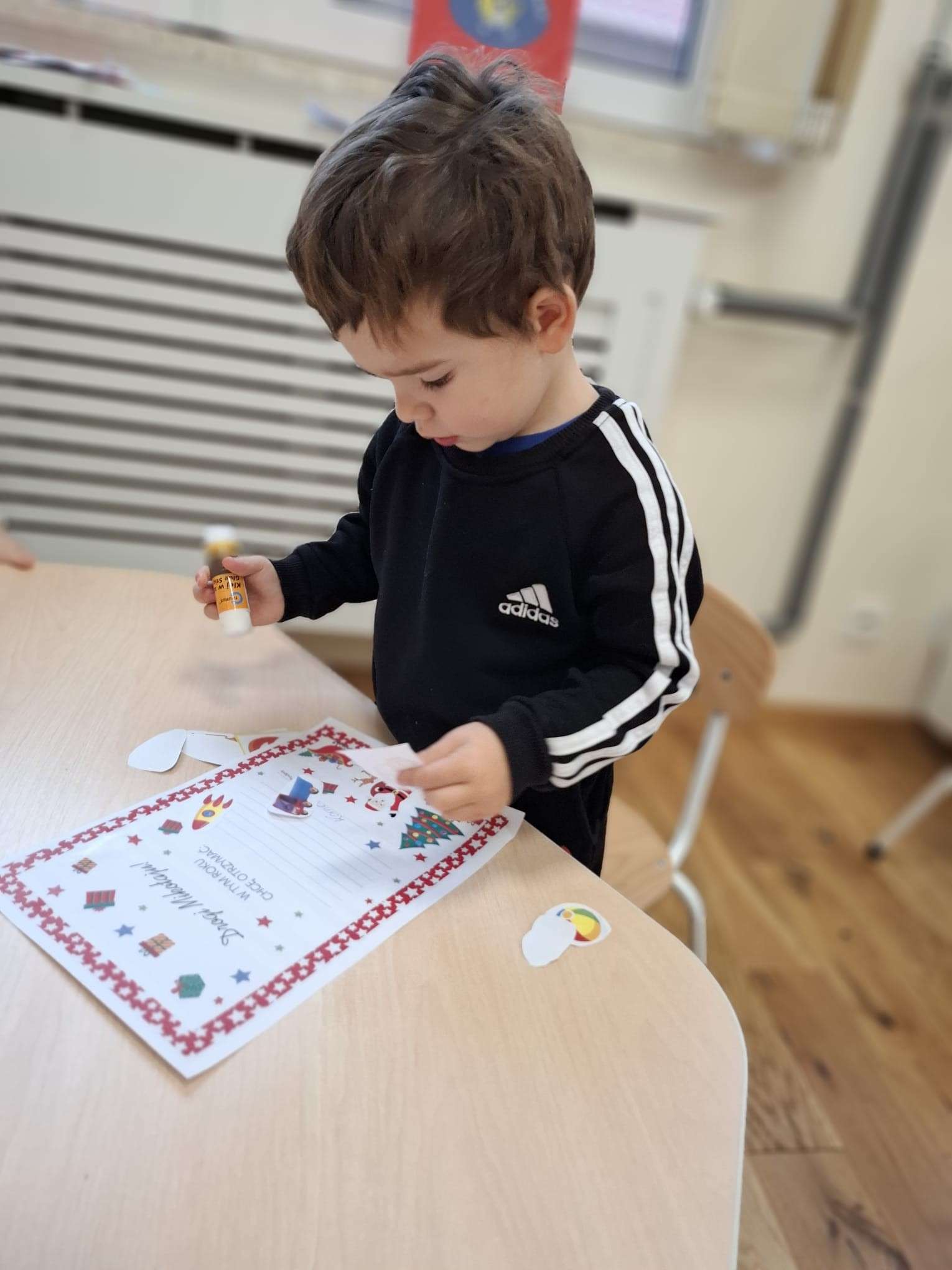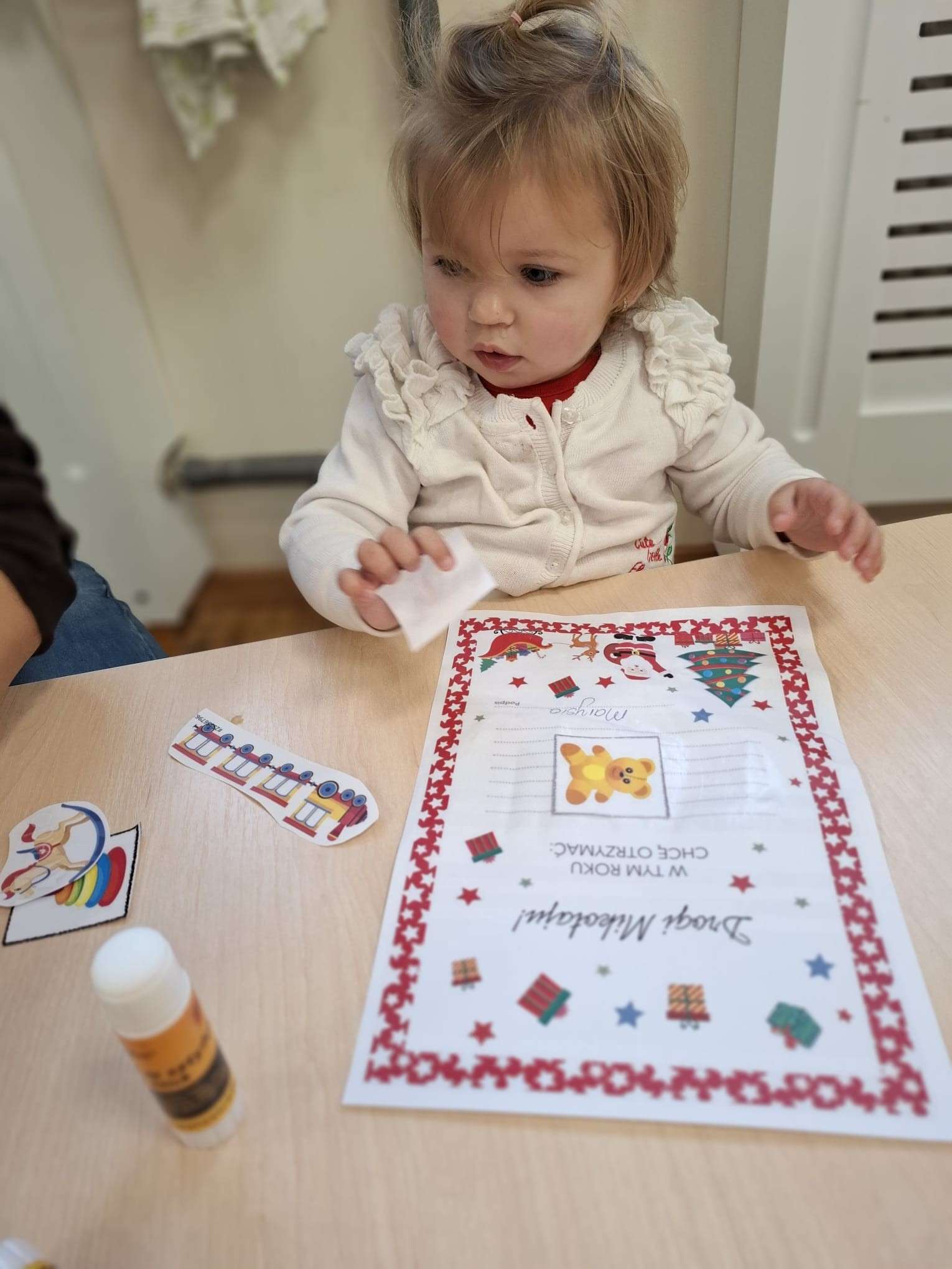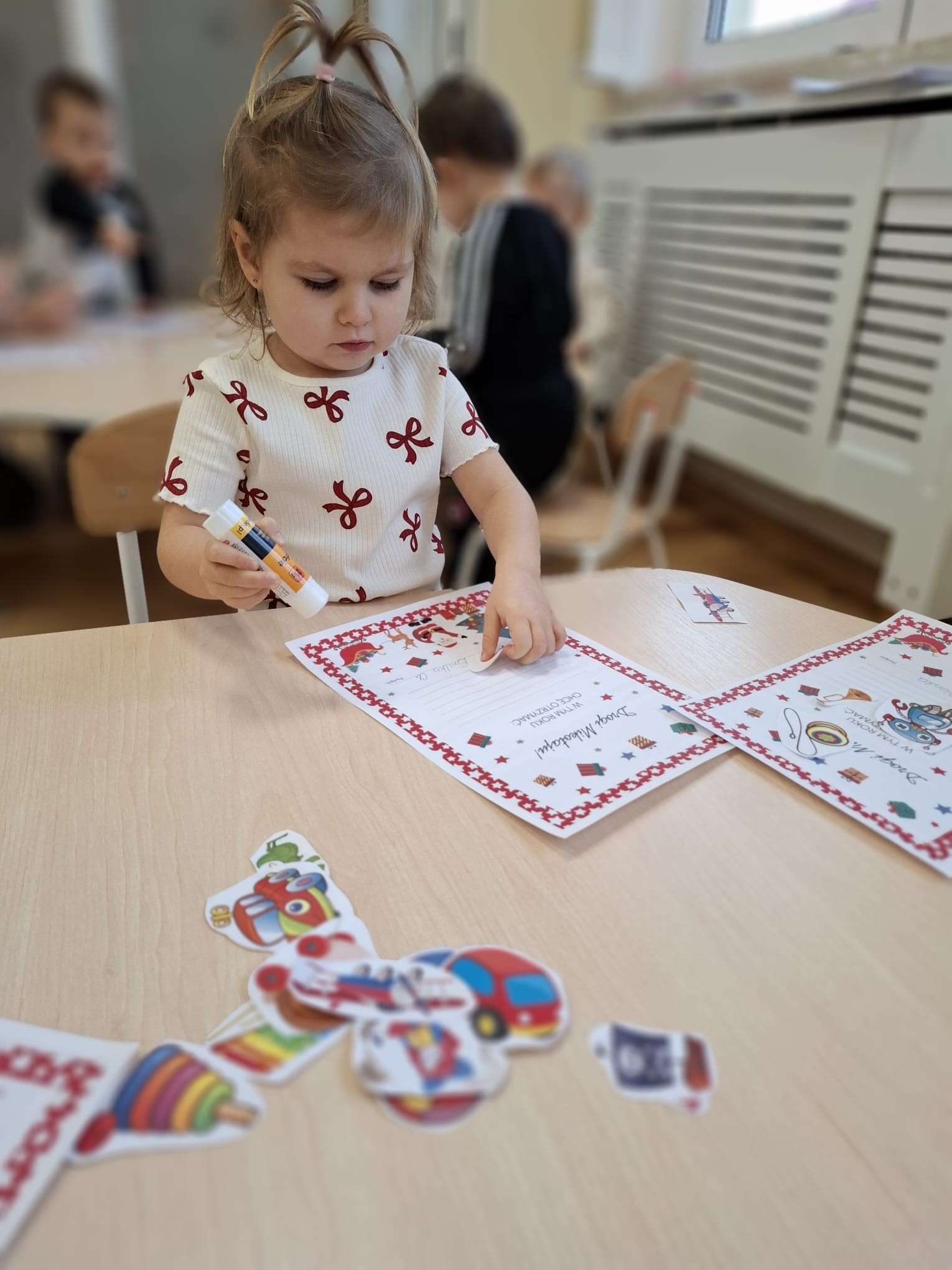 Każdy maluch z dumą naklejał wybrane obrazki na swój list, tworząc wyjątkową i jedyną w swoim rodzaju świąteczną prośbę. Gdy wszystkie listy były już gotowe, przyszedł czas na najważniejszy moment – wrzucenie ich do naszej mikołajowej skrzynki pocztowej.