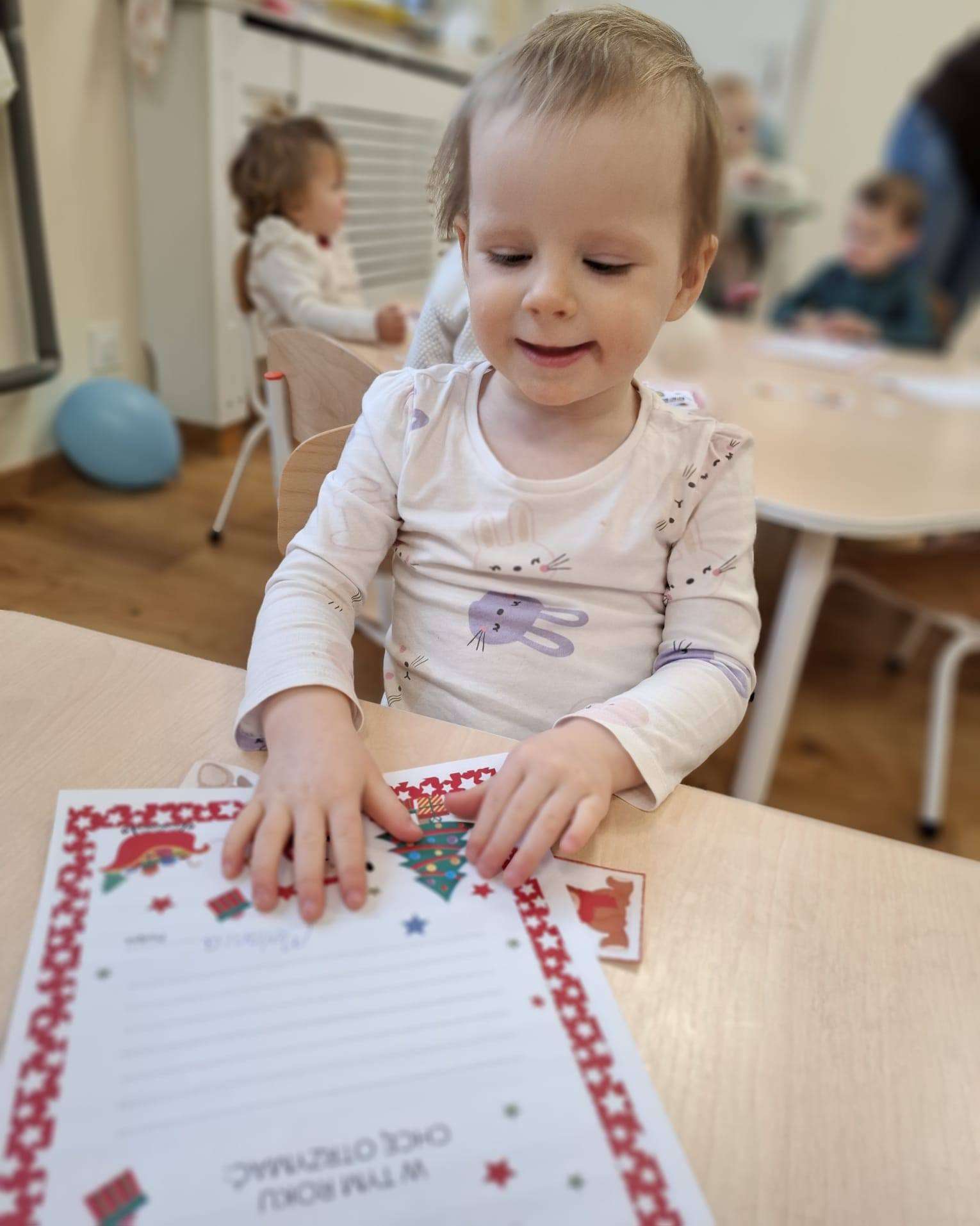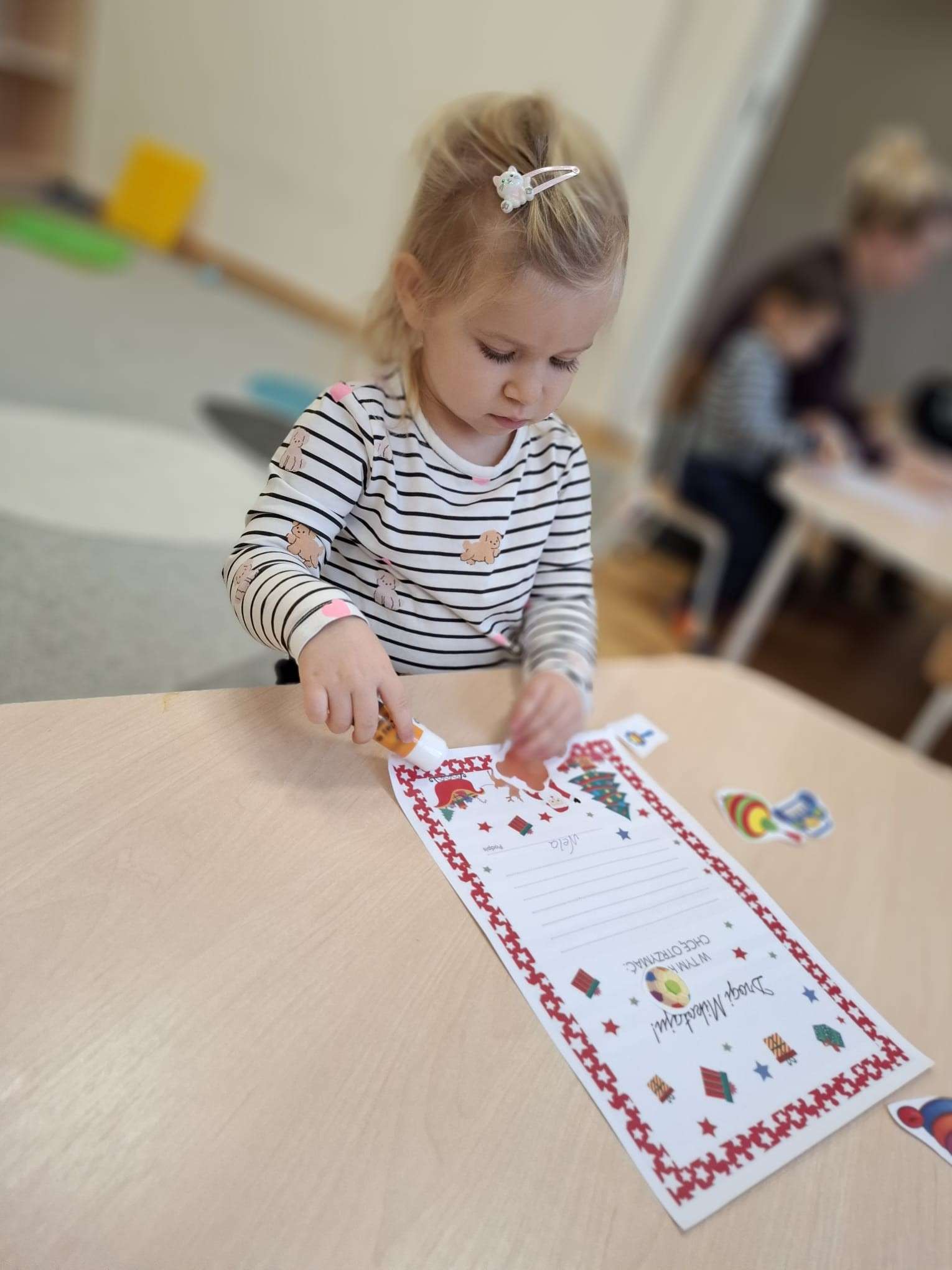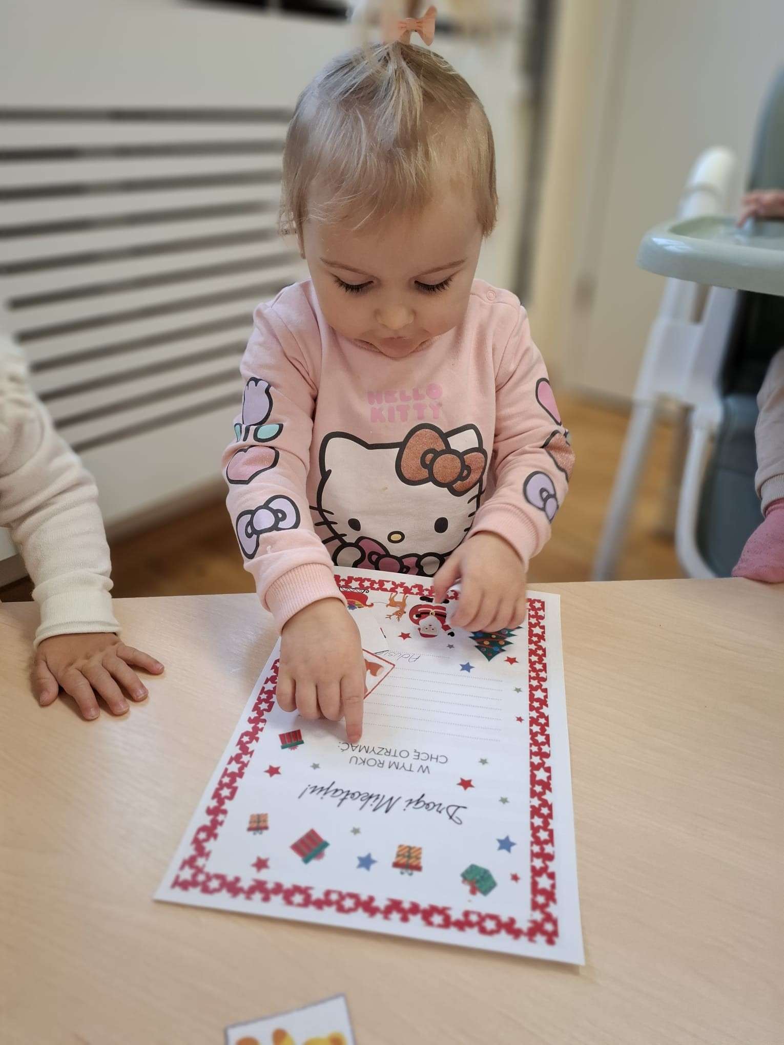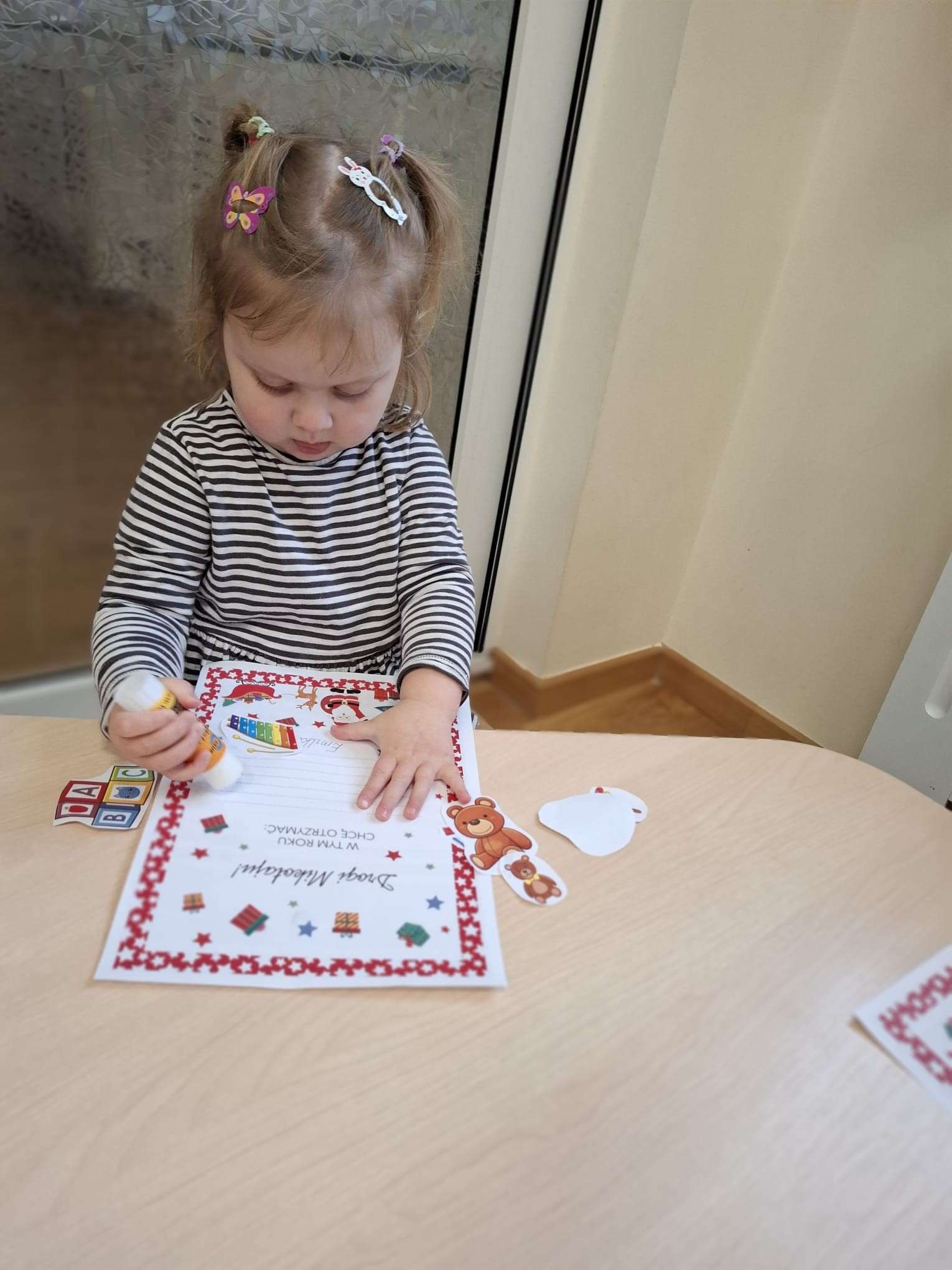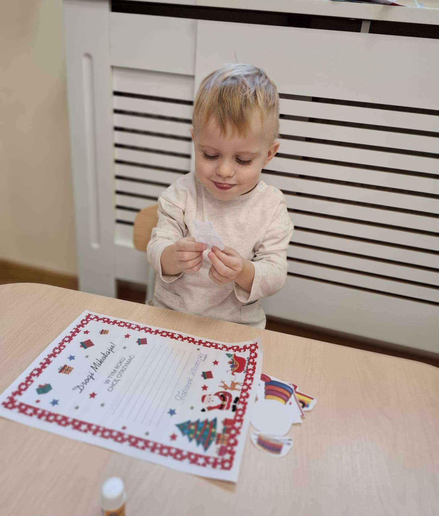Każdy maluch z dumą naklejał wybrane obrazki na swój list, tworząc wyjątkową i jedyną w swoim rodzaju świąteczną prośbę. Gdy wszystkie listy były już gotowe, przyszedł czas na najważniejszy moment – wrzucenie ich do naszej mikołajowej skrzynki pocztowej.