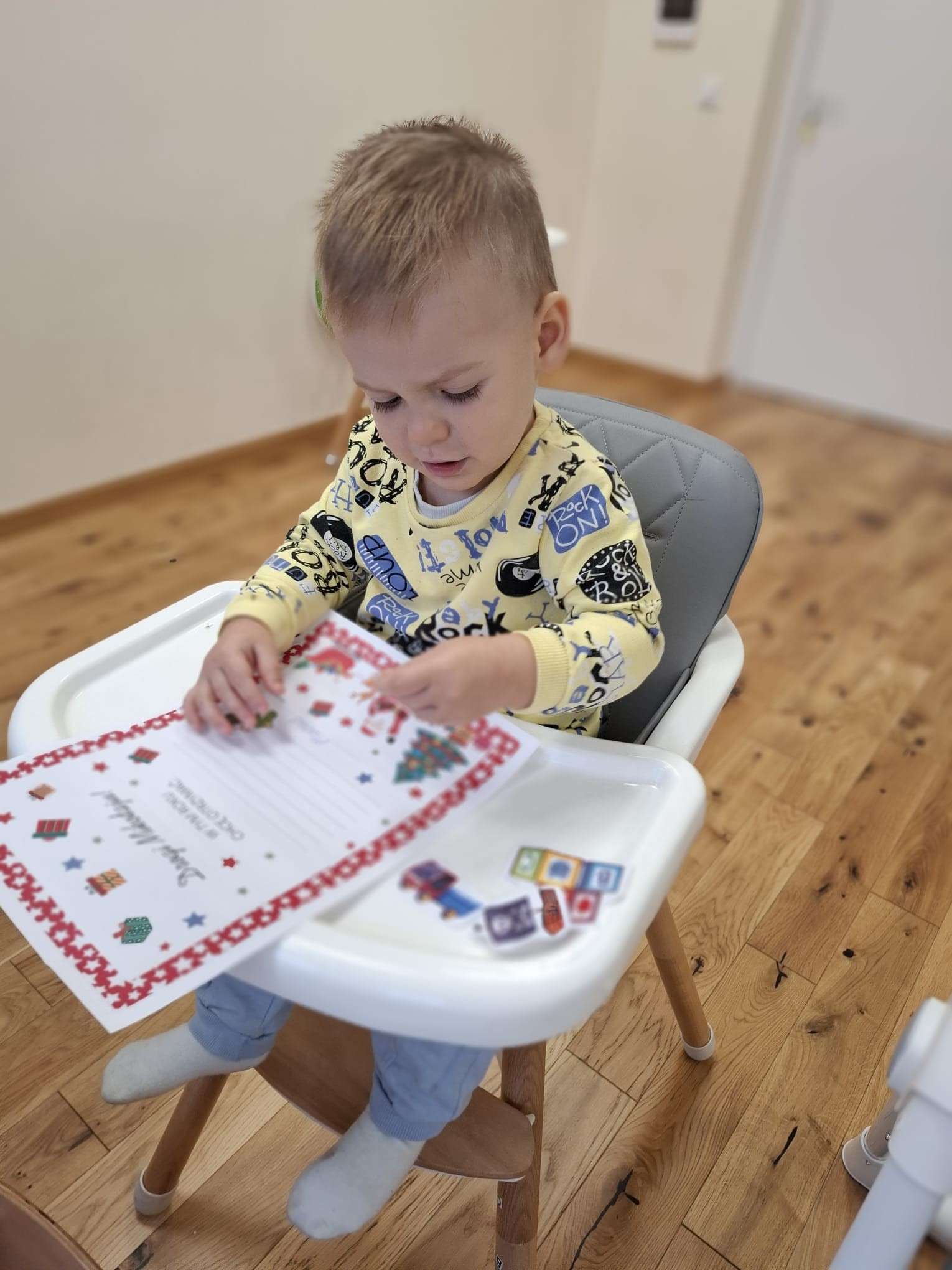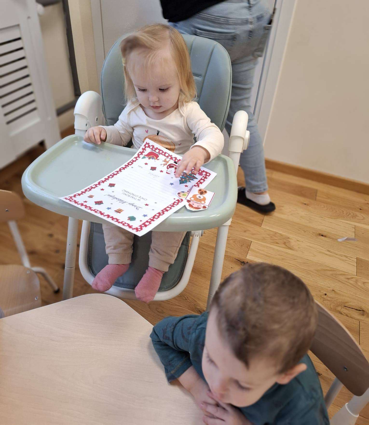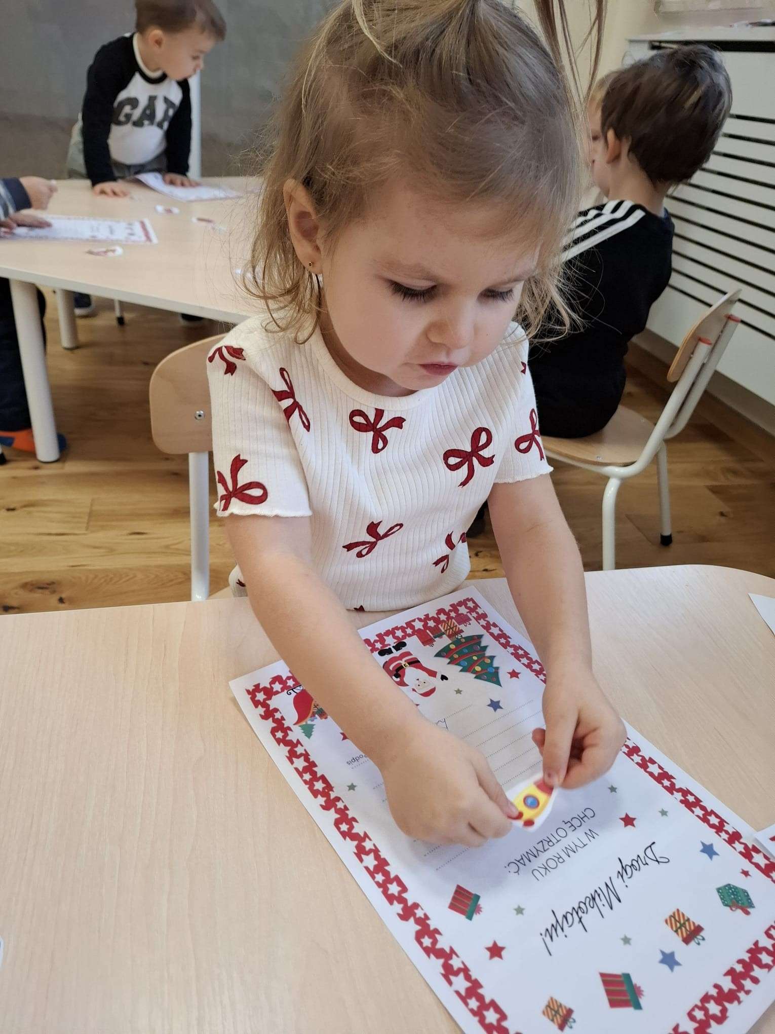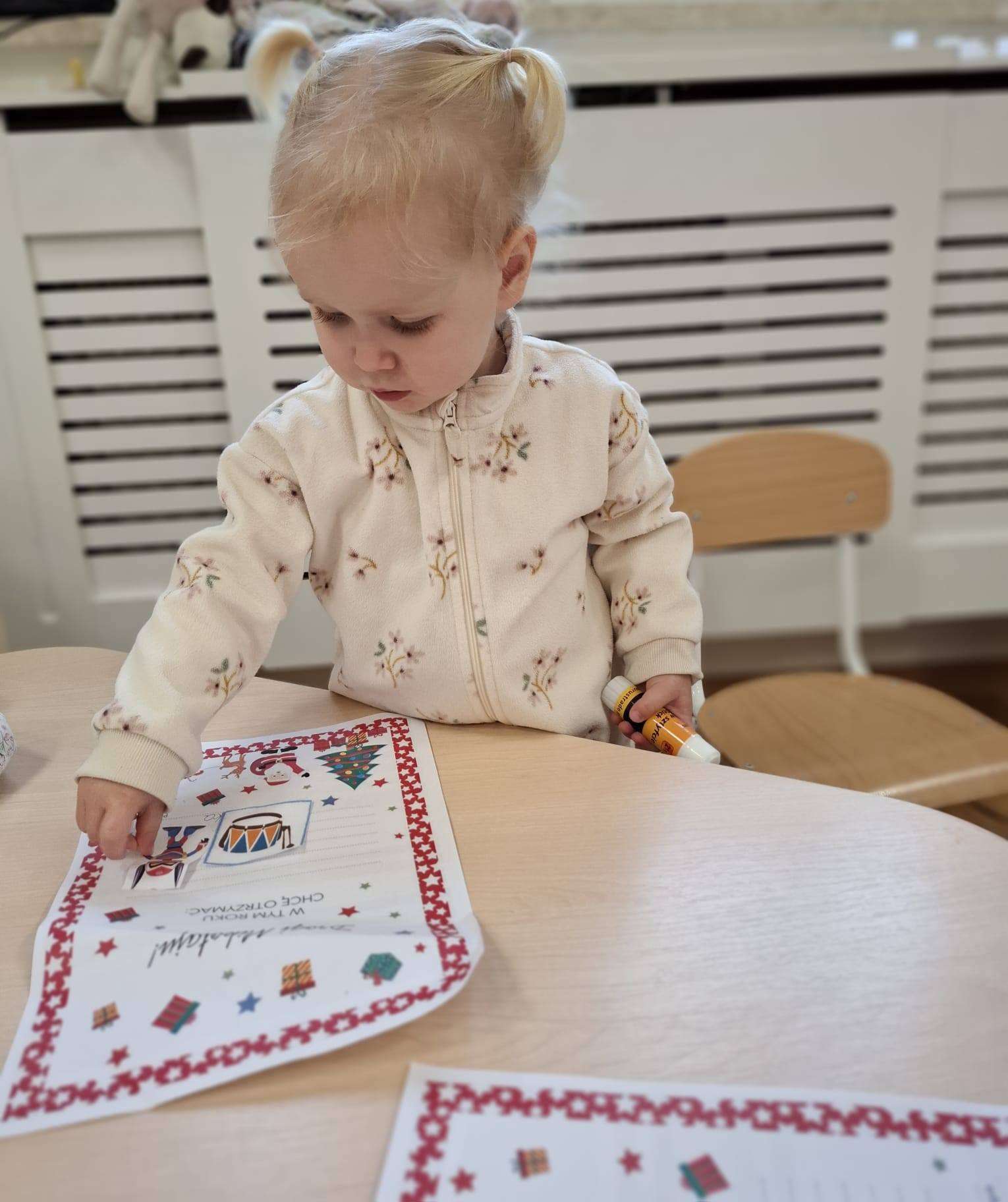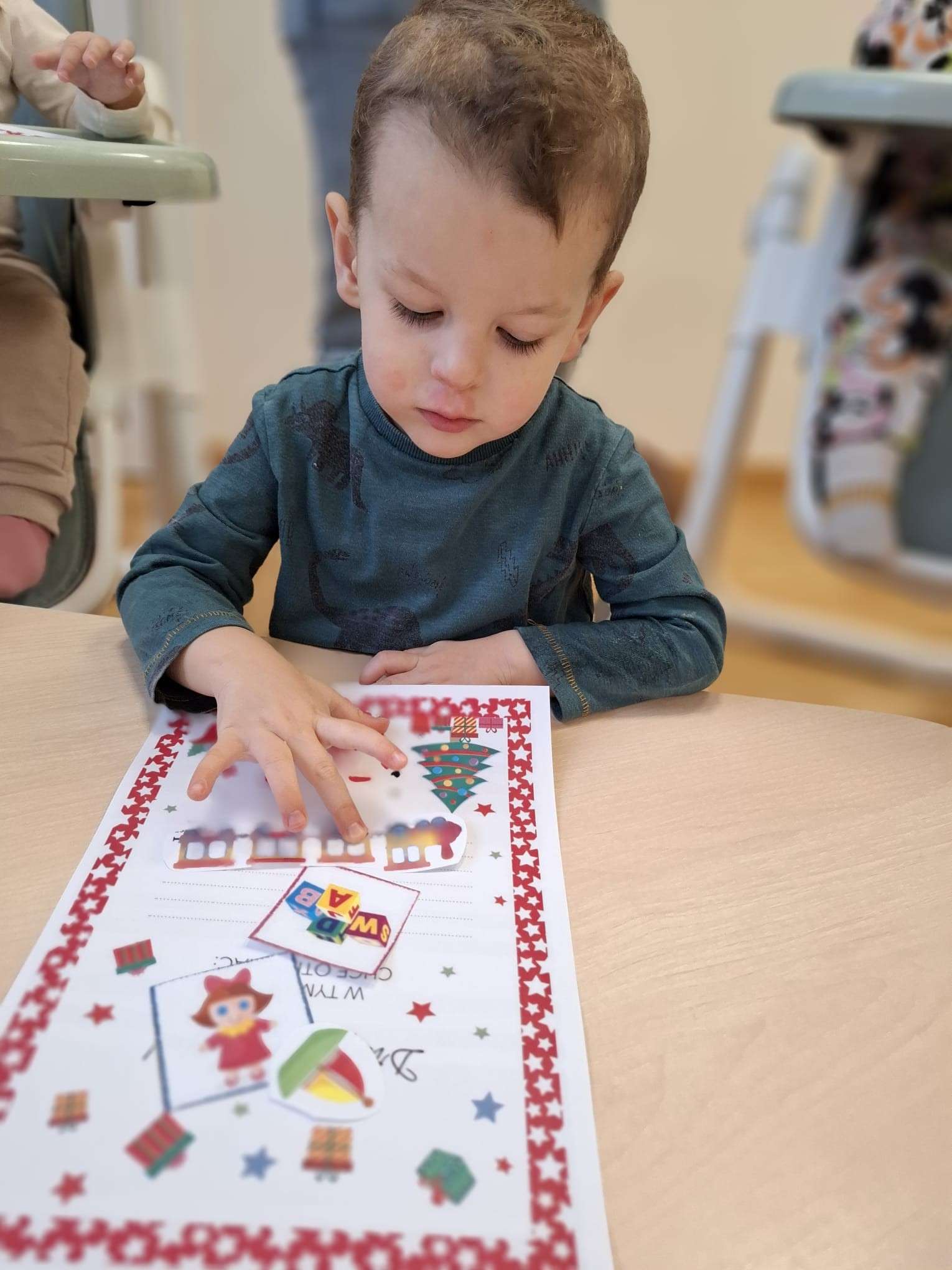 Każdy maluch z dumą naklejał wybrane obrazki na swój list, tworząc wyjątkową i jedyną w swoim rodzaju świąteczną prośbę. Gdy wszystkie listy były już gotowe, przyszedł czas na najważniejszy moment – wrzucenie ich do naszej mikołajowej skrzynki pocztowej.