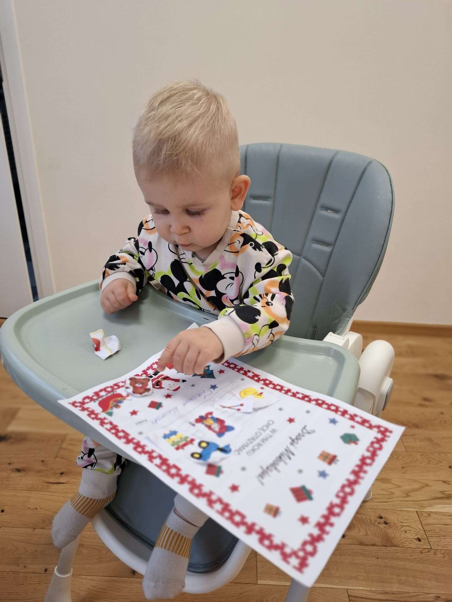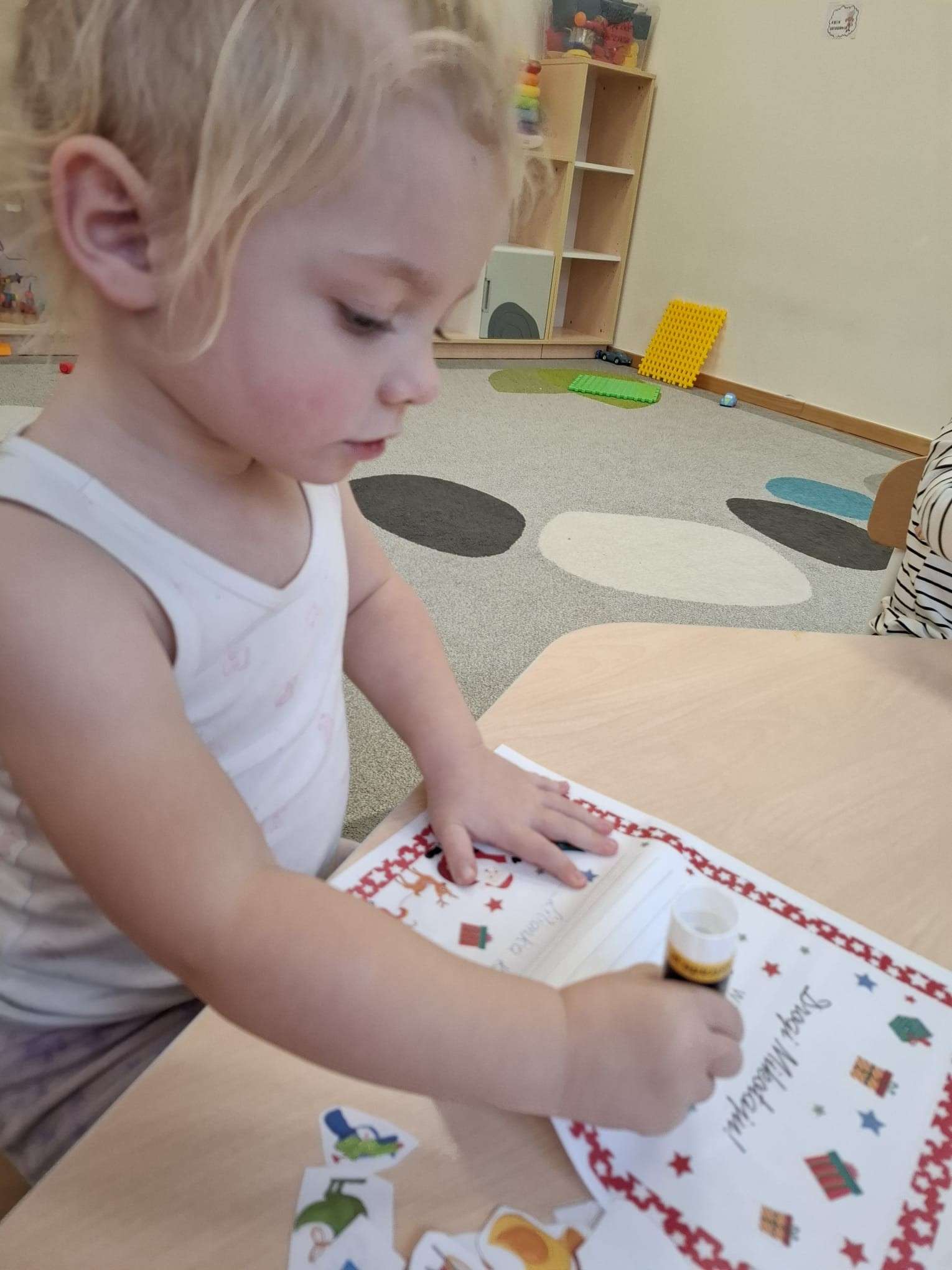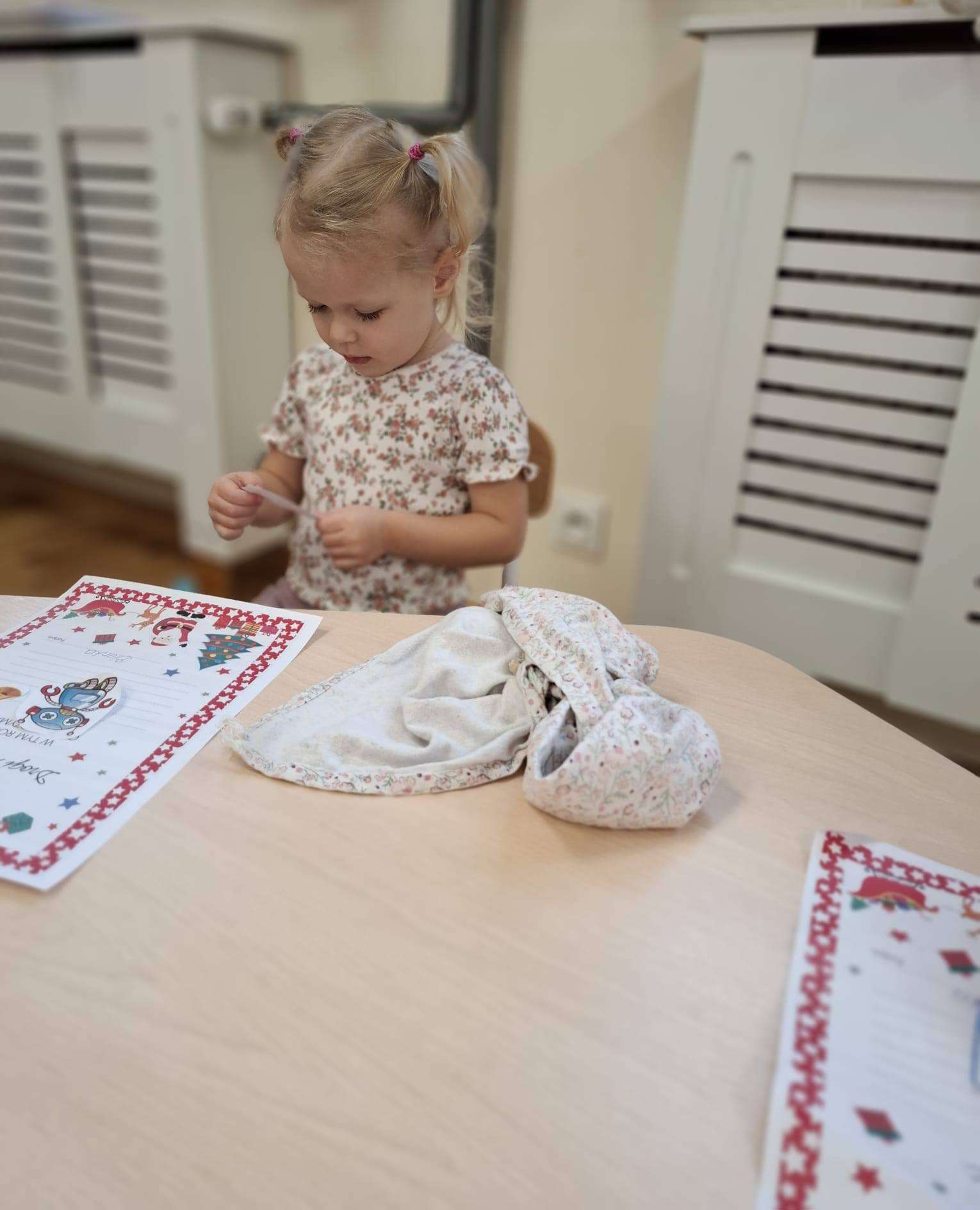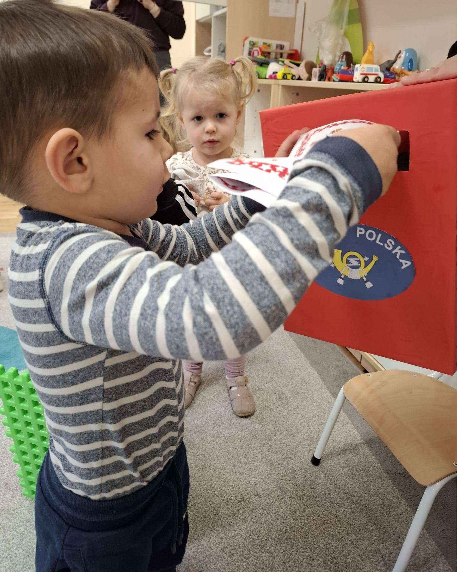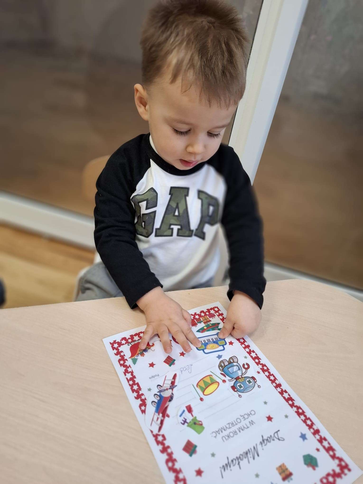 Każdy maluch z dumą naklejał wybrane obrazki na swój list, tworząc wyjątkową i jedyną w swoim rodzaju świąteczną prośbę. Gdy wszystkie listy były już gotowe, przyszedł czas na najważniejszy moment – wrzucenie ich do naszej mikołajowej skrzynki pocztowej.