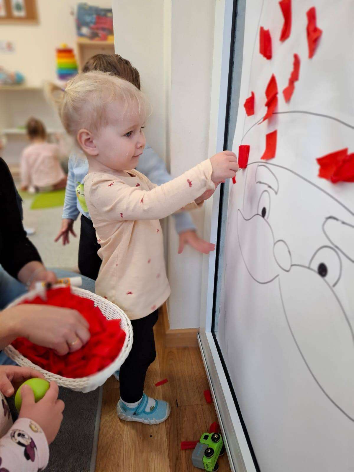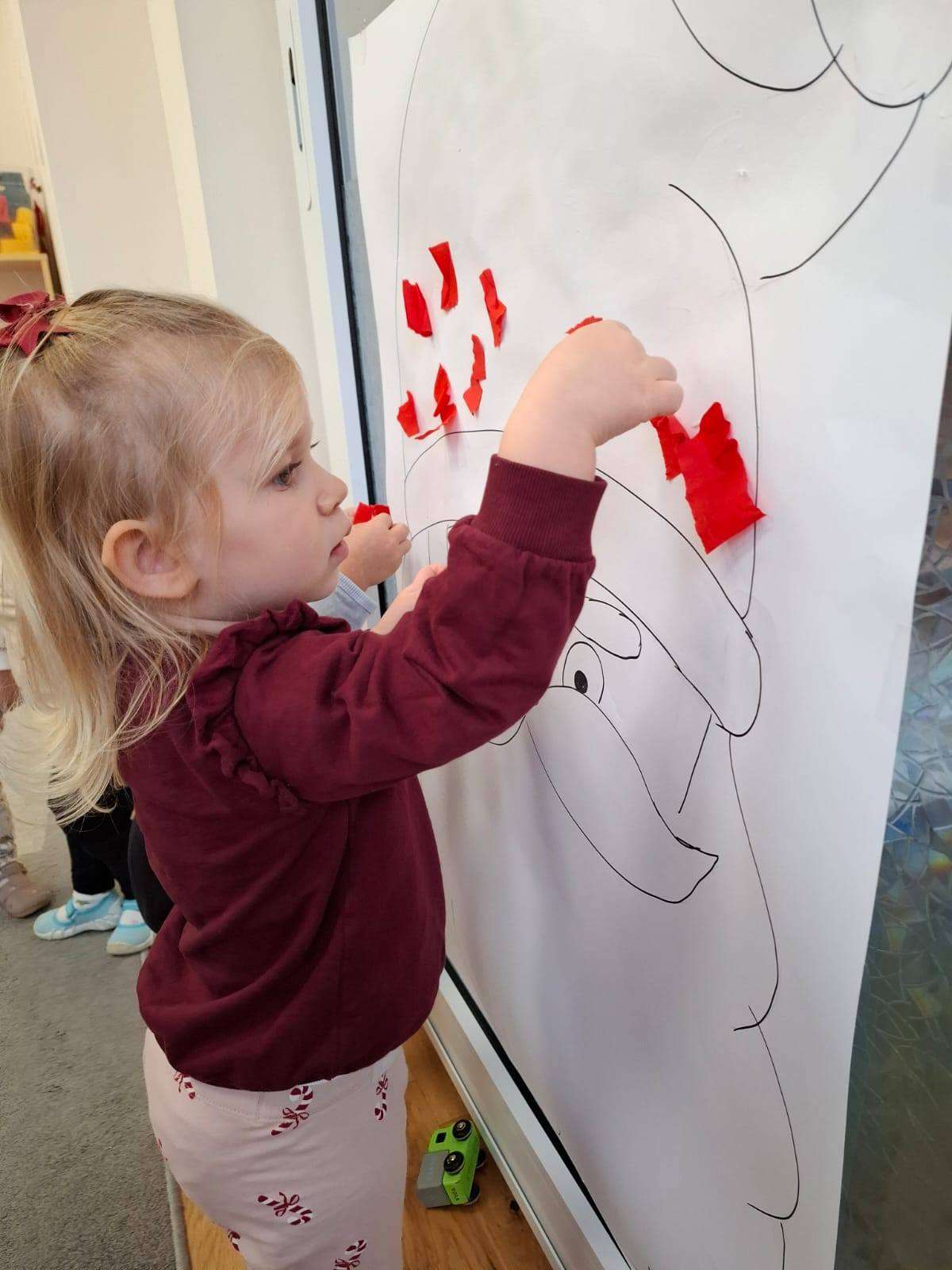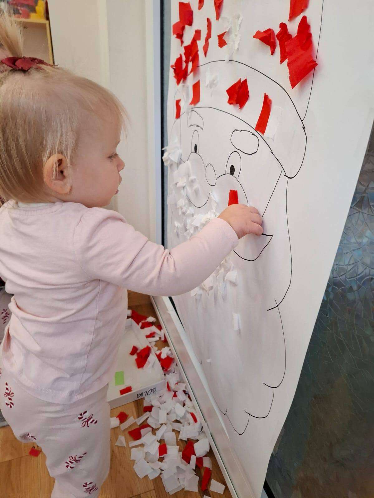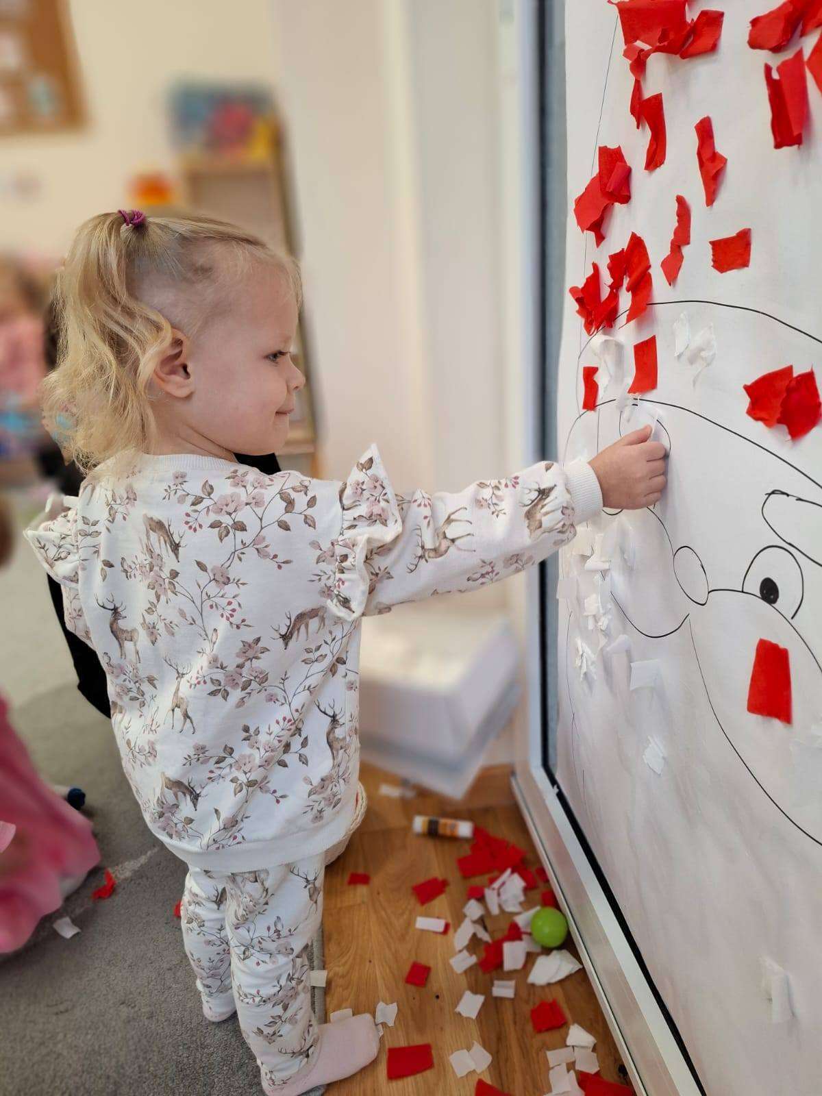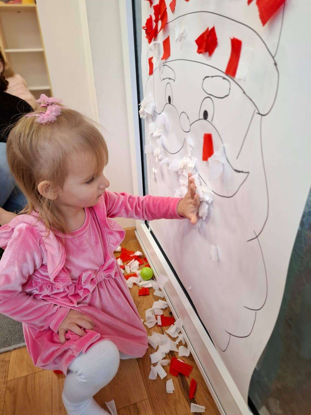 Aby jeszcze bardziej poczuć magię zbliżającego się spotkania, wykonaliśmy portret Mikołaja. Dzieci wyklejały jego białą, puszystą brodę z bibuły oraz czerwoną czapkę – było dużo radości i kreatywnej zabawy.![]()