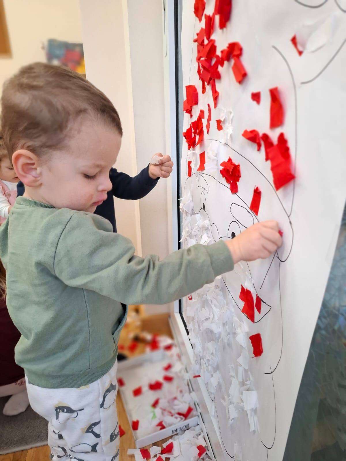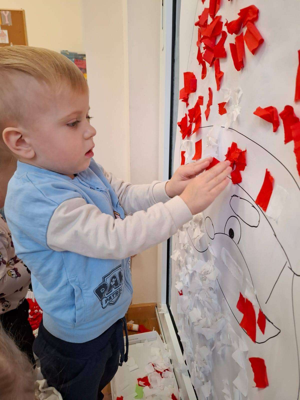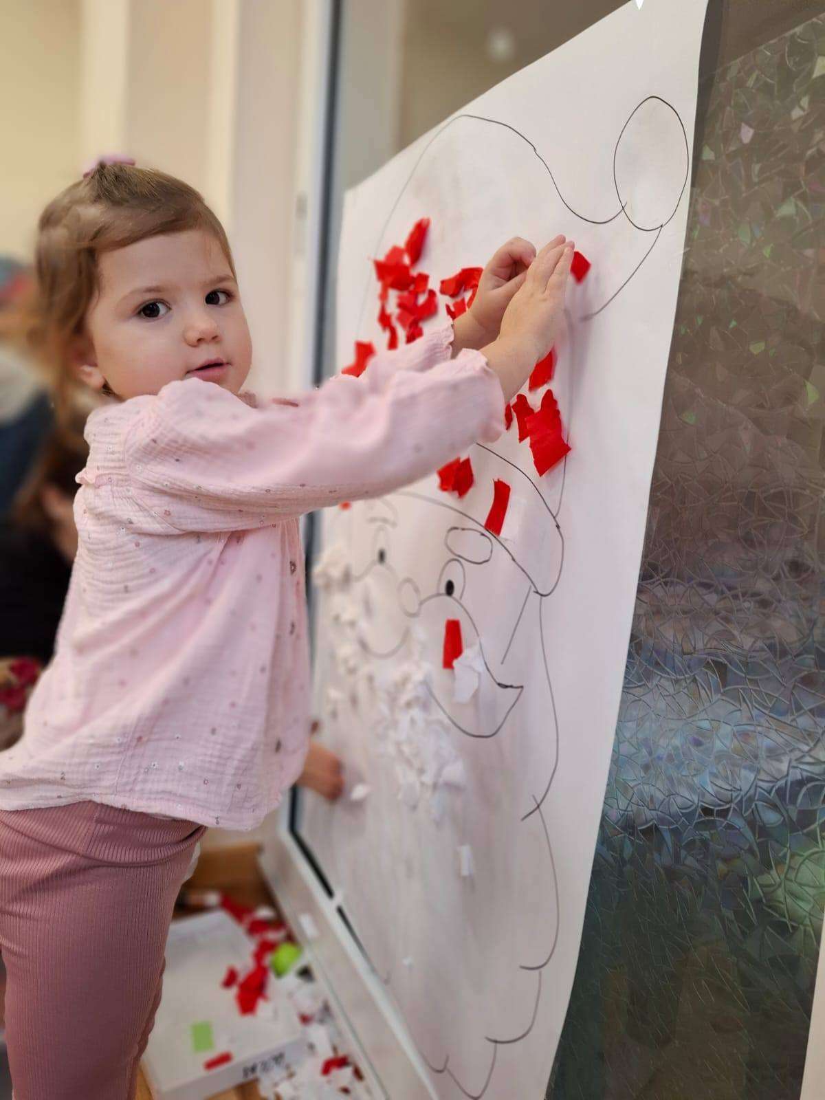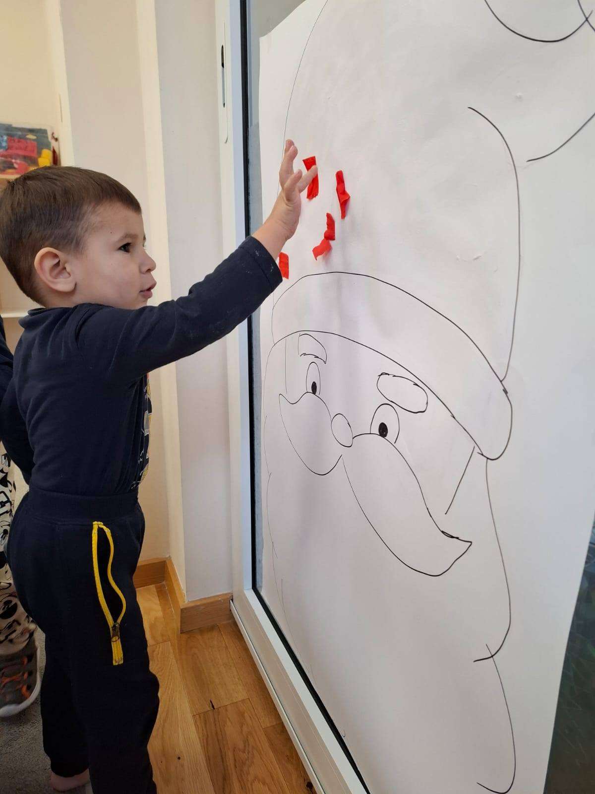 Aby jeszcze bardziej poczuć magię zbliżającego się spotkania, wykonaliśmy portret Mikołaja. Dzieci wyklejały jego białą, puszystą brodę z bibuły oraz czerwoną czapkę – było dużo radości i kreatywnej zabawy.![]()