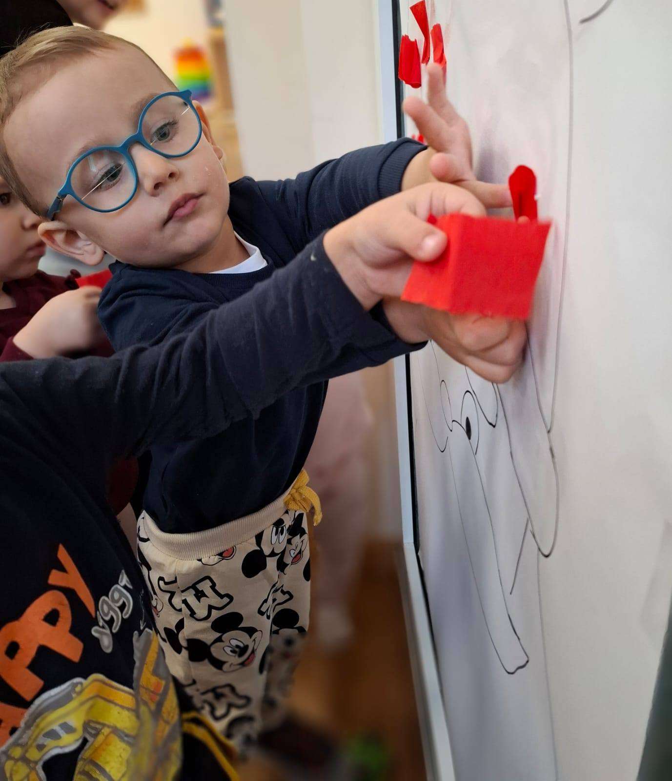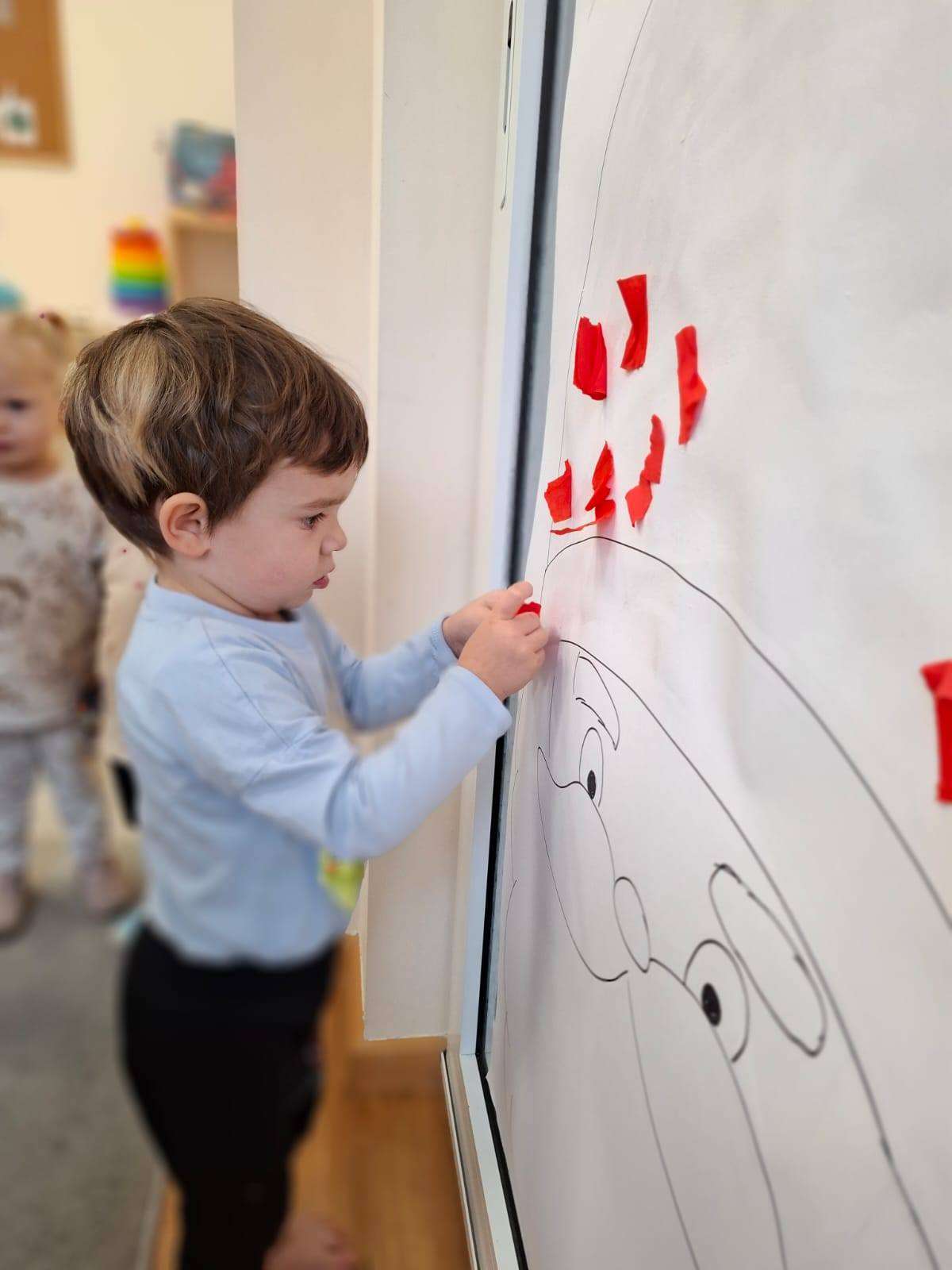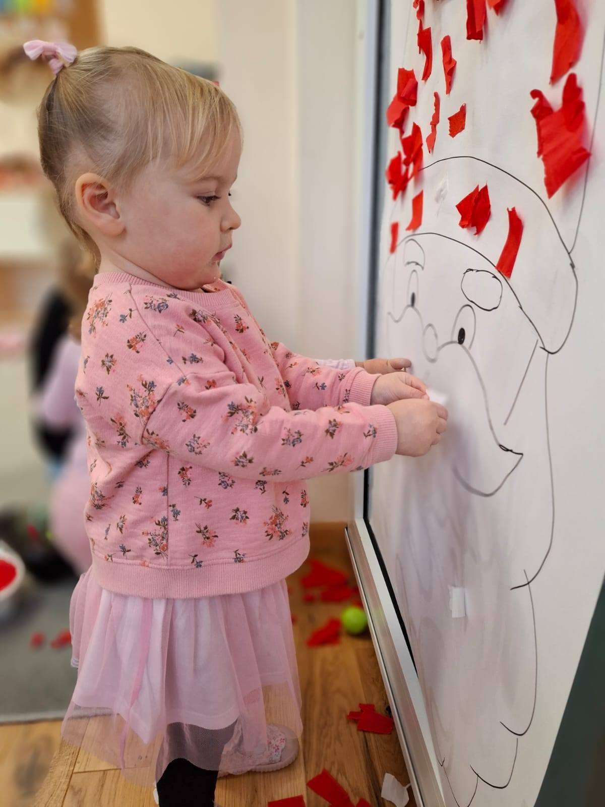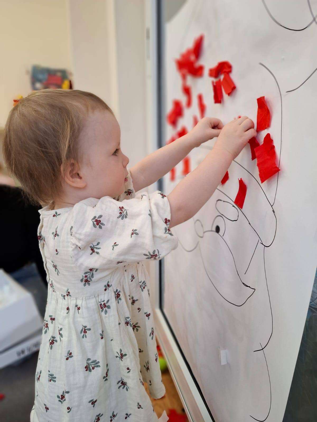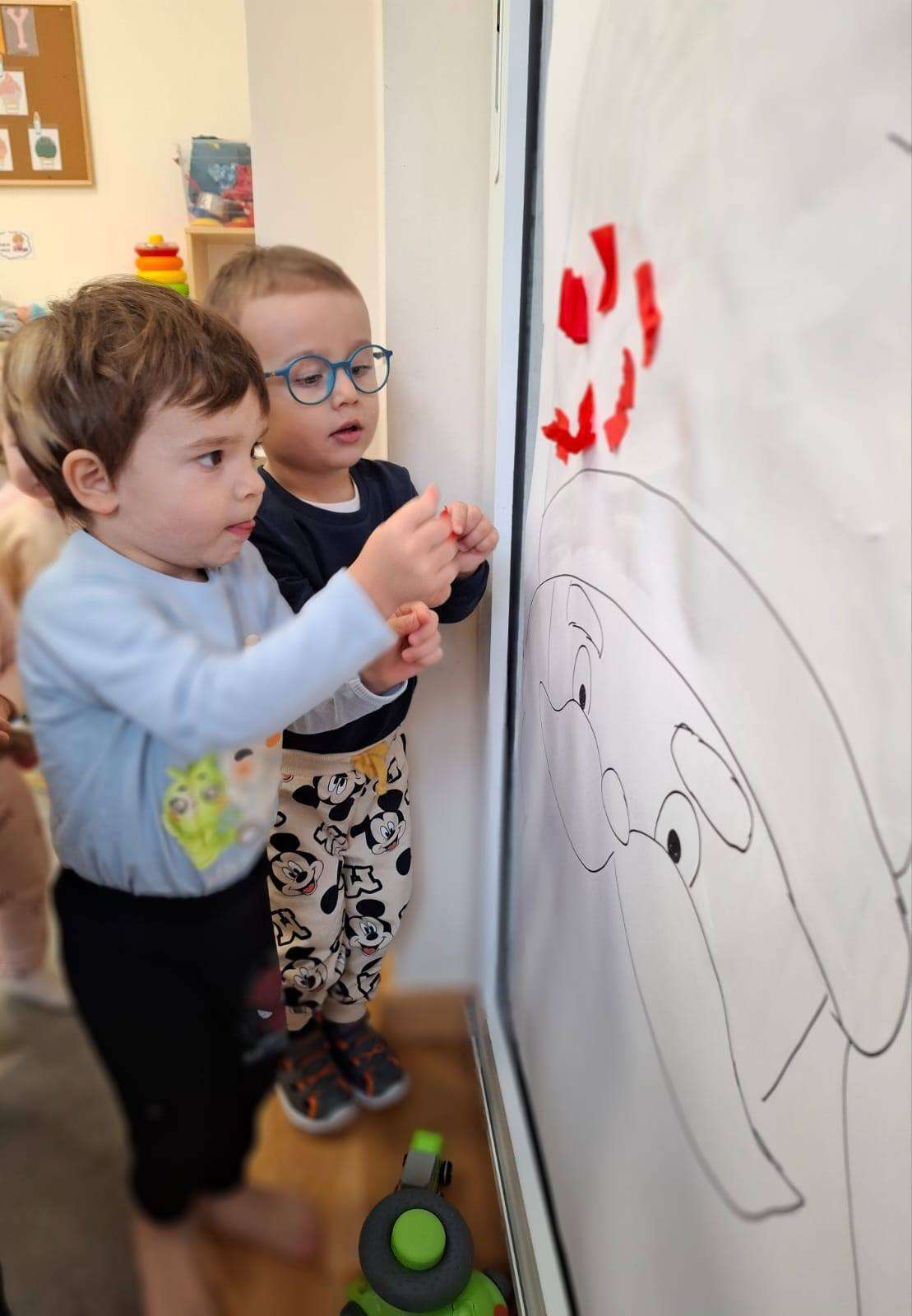 Aby jeszcze bardziej poczuć magię zbliżającego się spotkania, wykonaliśmy portret Mikołaja. Dzieci wyklejały jego białą, puszystą brodę z bibuły oraz czerwoną czapkę – było dużo radości i kreatywnej zabawy.![]()