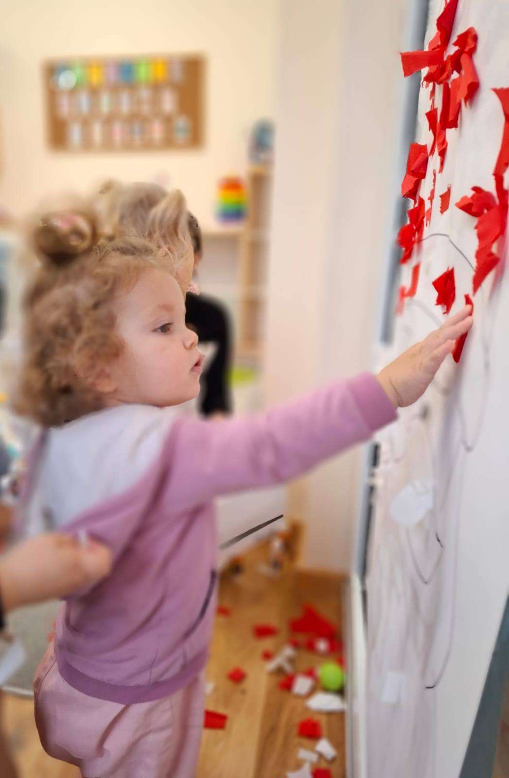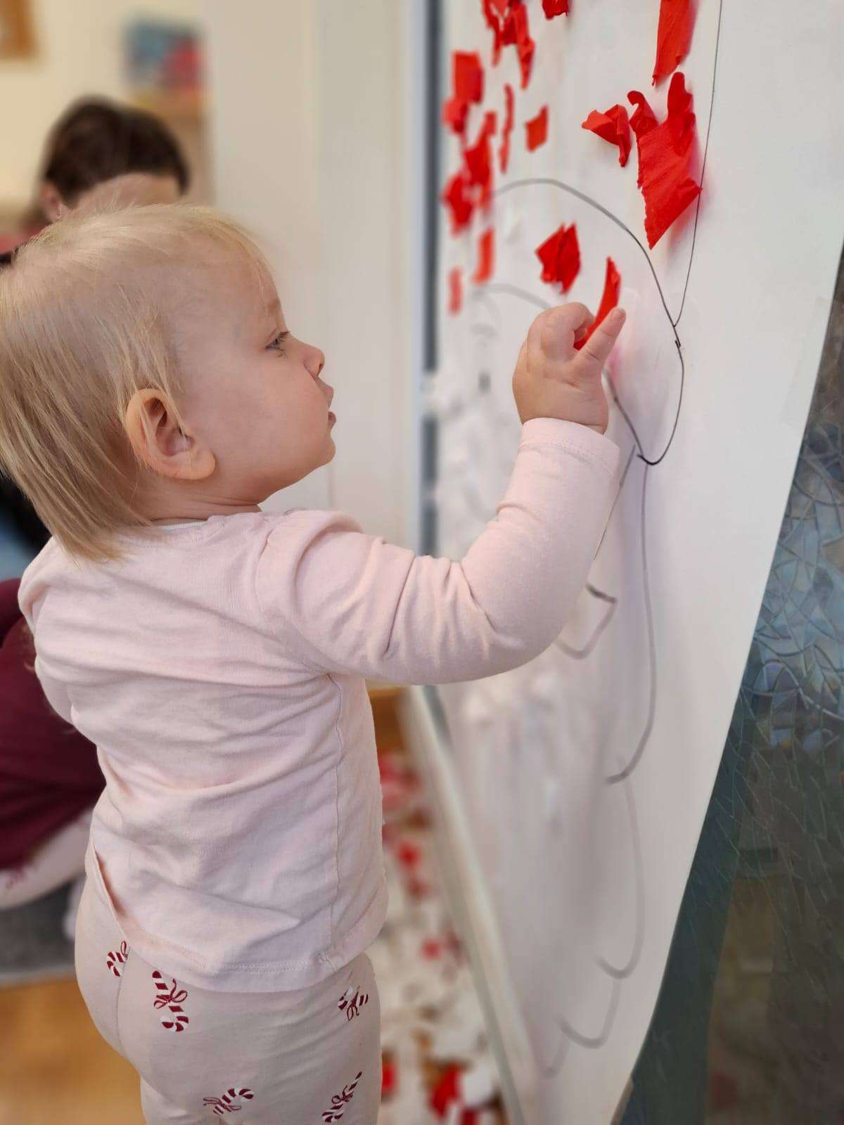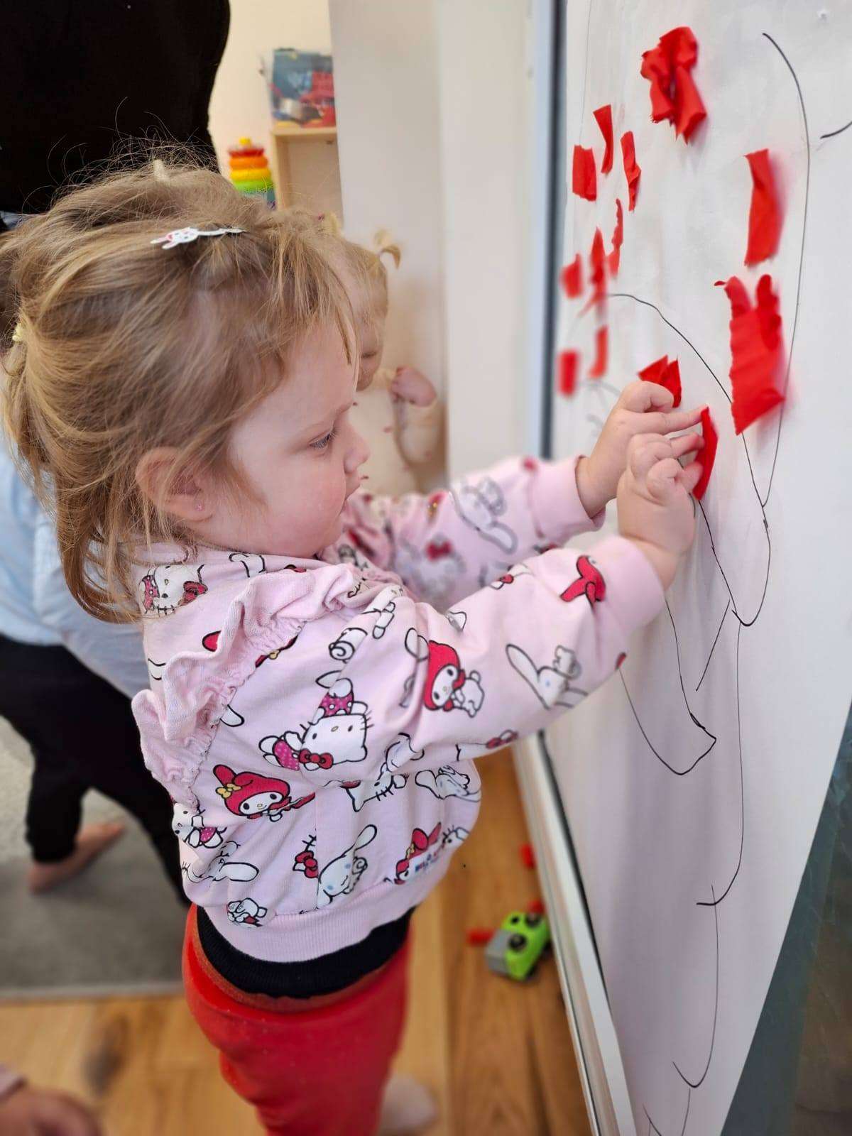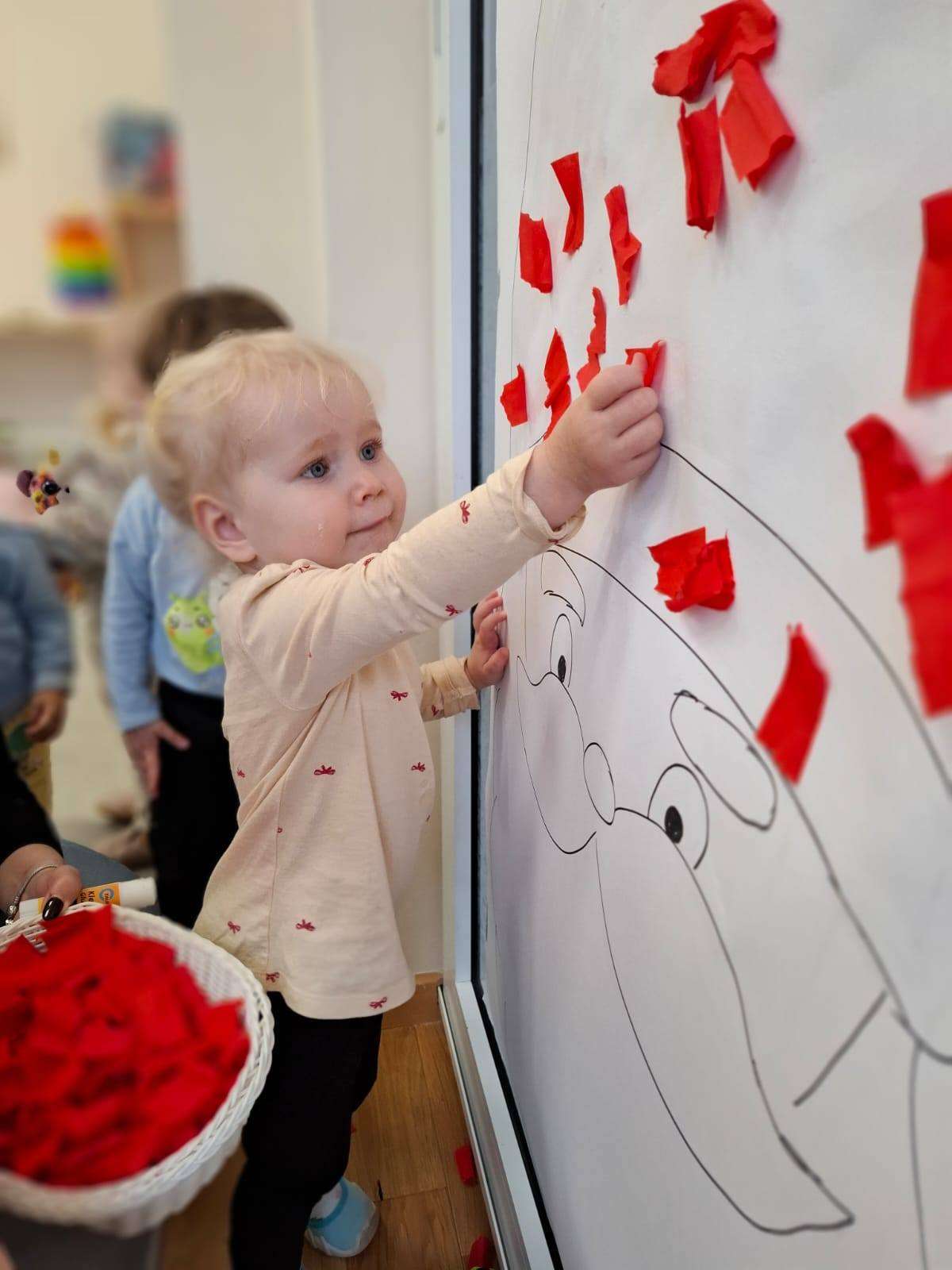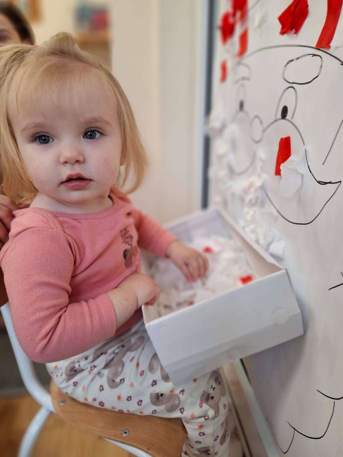 Aby jeszcze bardziej poczuć magię zbliżającego się spotkania, wykonaliśmy portret Mikołaja. Dzieci wyklejały jego białą, puszystą brodę z bibuły oraz czerwoną czapkę – było dużo radości i kreatywnej zabawy.![]()