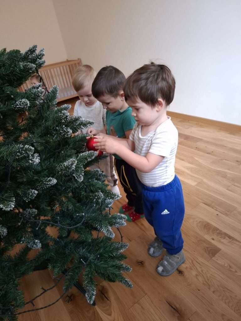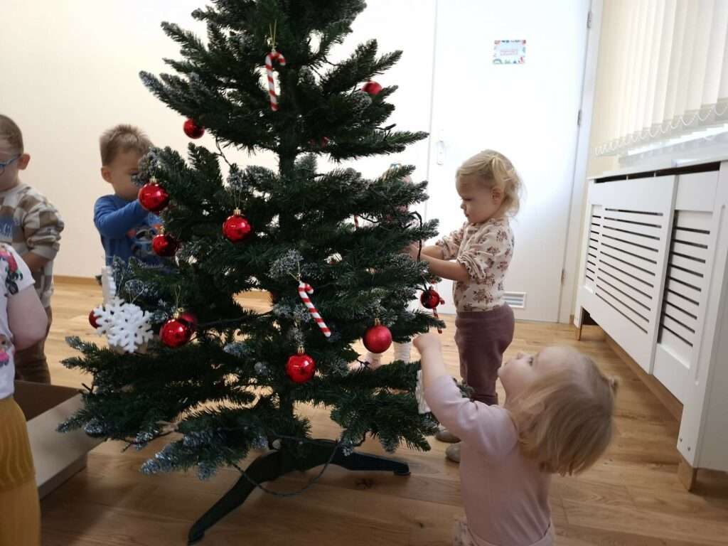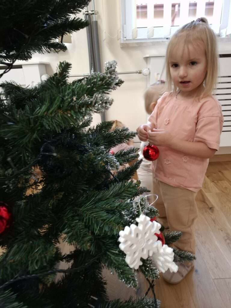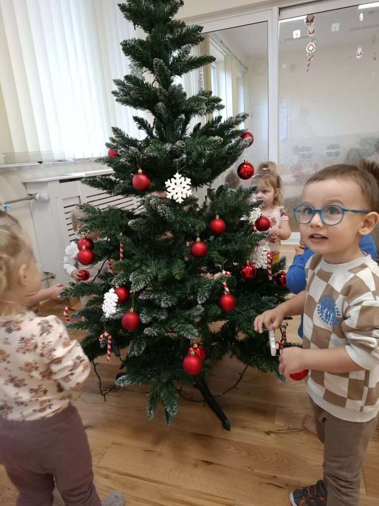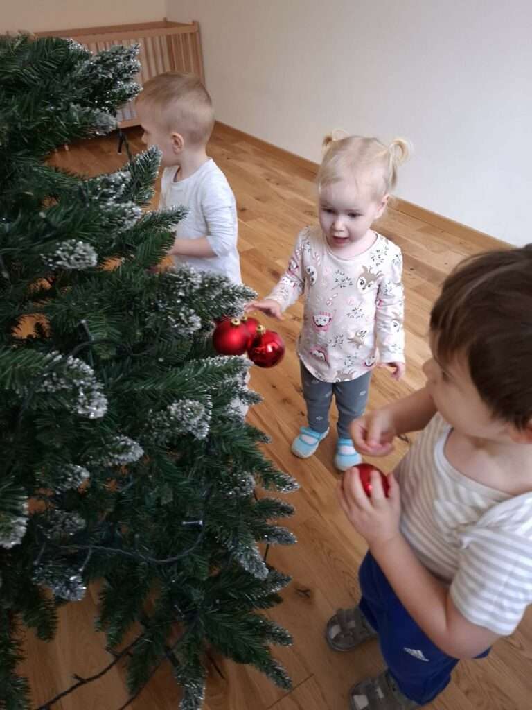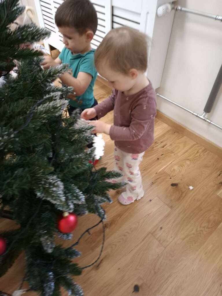 Maluszki zawieszały kolorowe bombki, miękkie łańcuchy i błyszczące lampki, a każda ozdoba trafiała na gałązkę z wielką starannością.