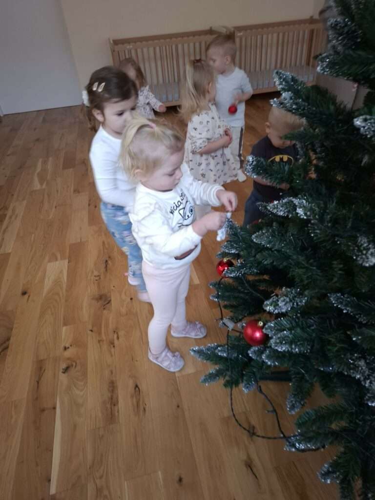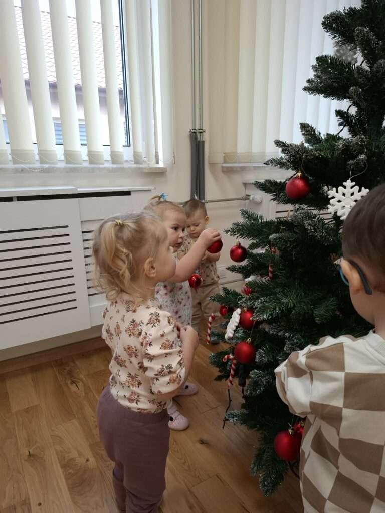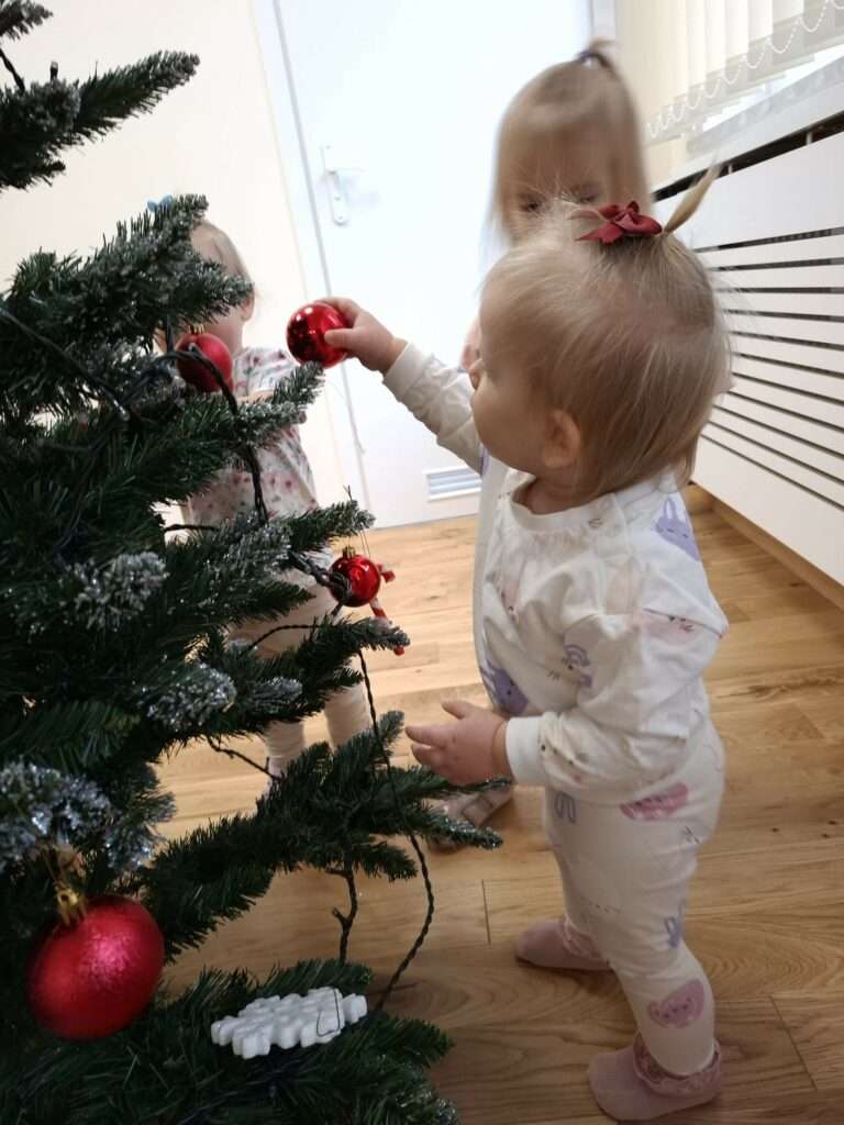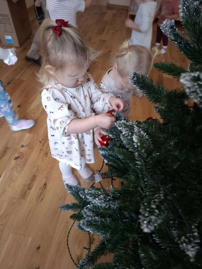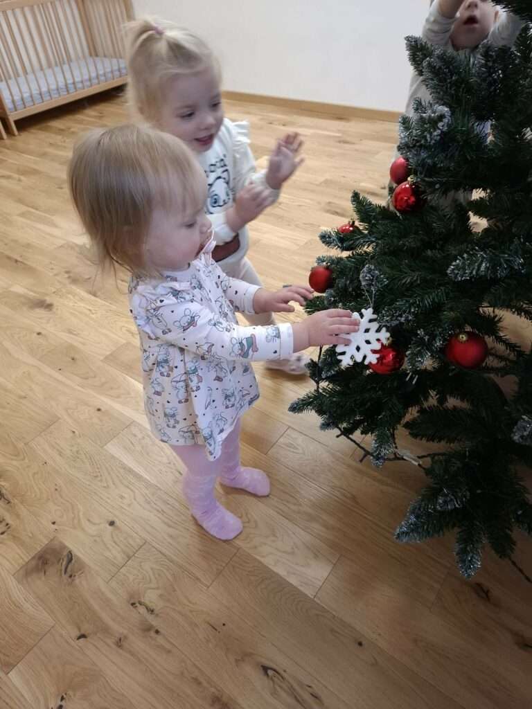 Maluszki zawieszały kolorowe bombki, miękkie łańcuchy i błyszczące lampki, a każda ozdoba trafiała na gałązkę z wielką starannością.