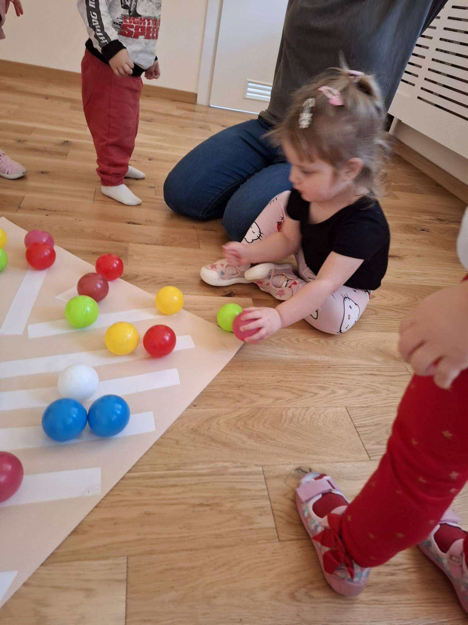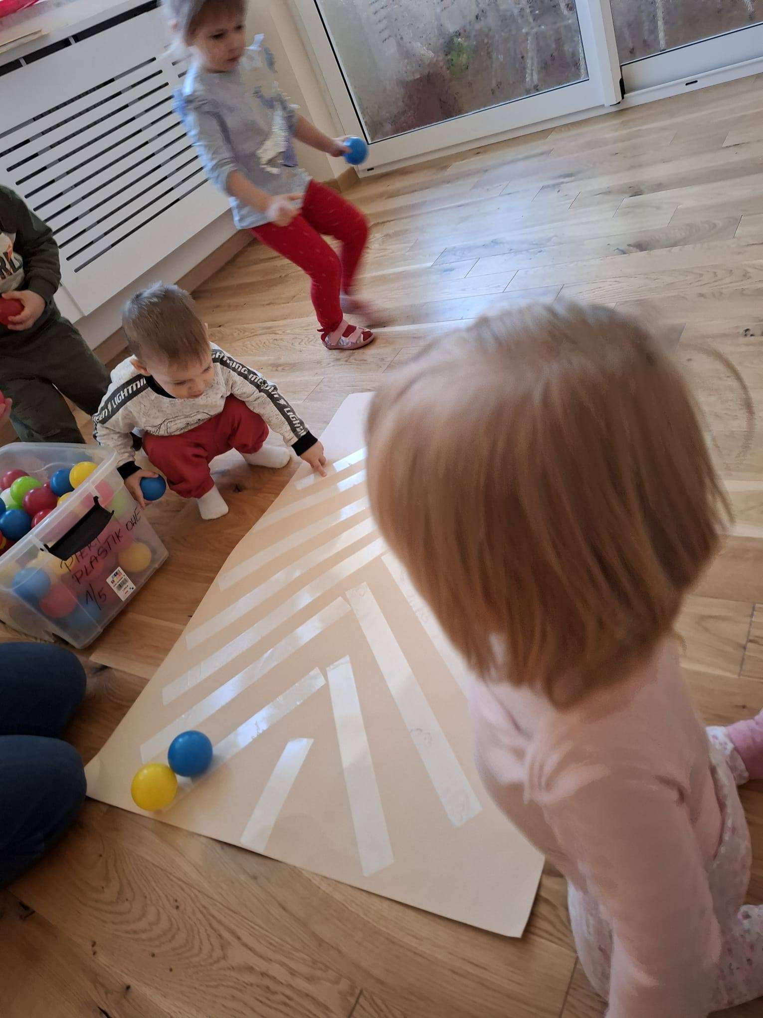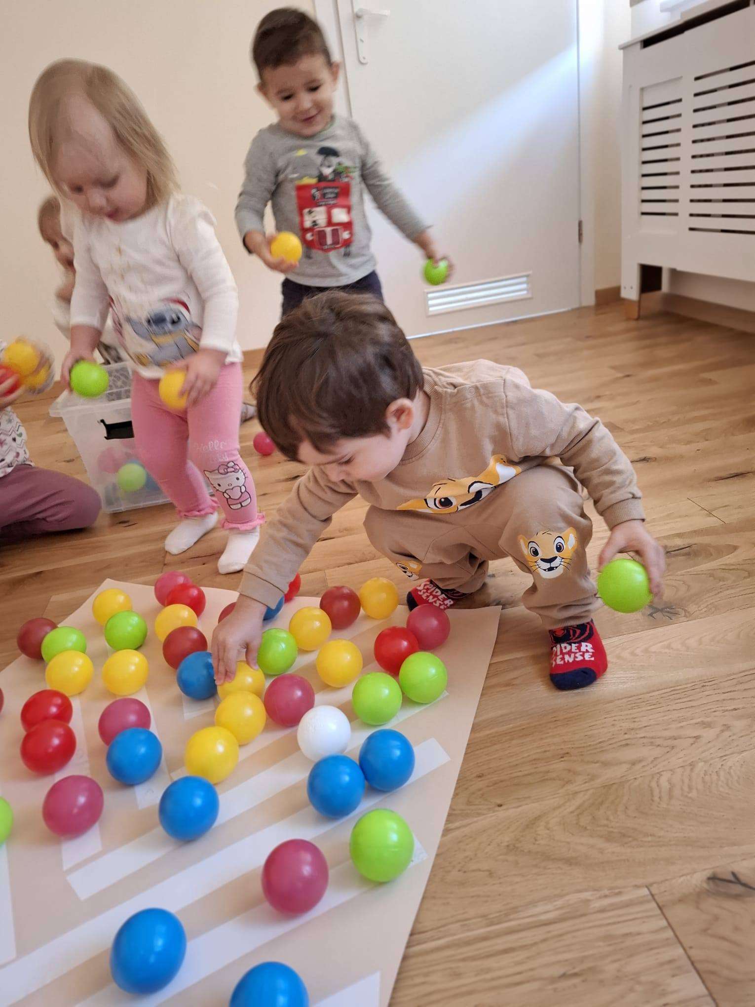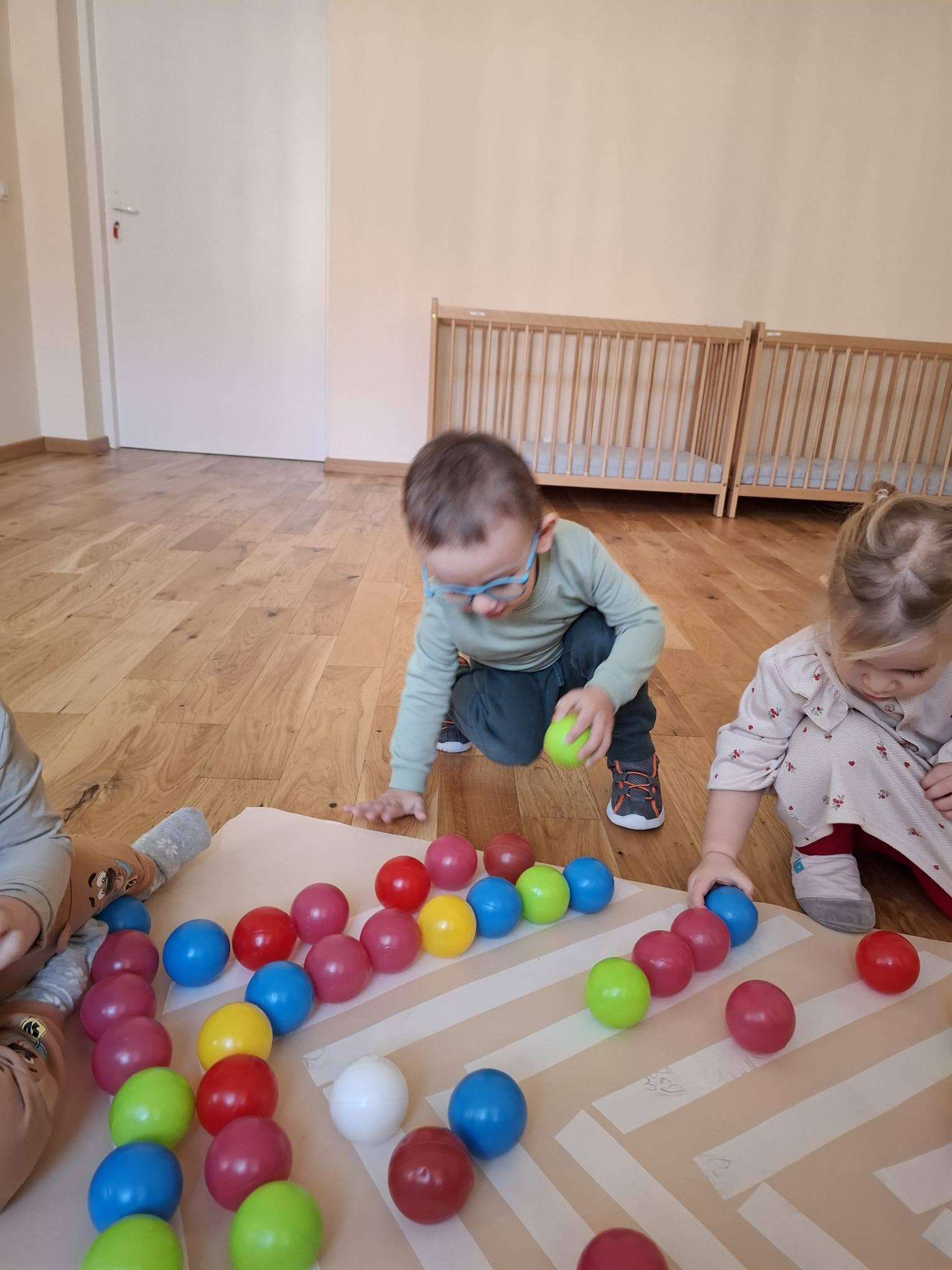 Zadaniem dzieci było dokładanie piłeczek w odpowiednie miejsca na przygotowanym wzorze – tak, aby wspólnie powstała piękna, kolorowa choinka.