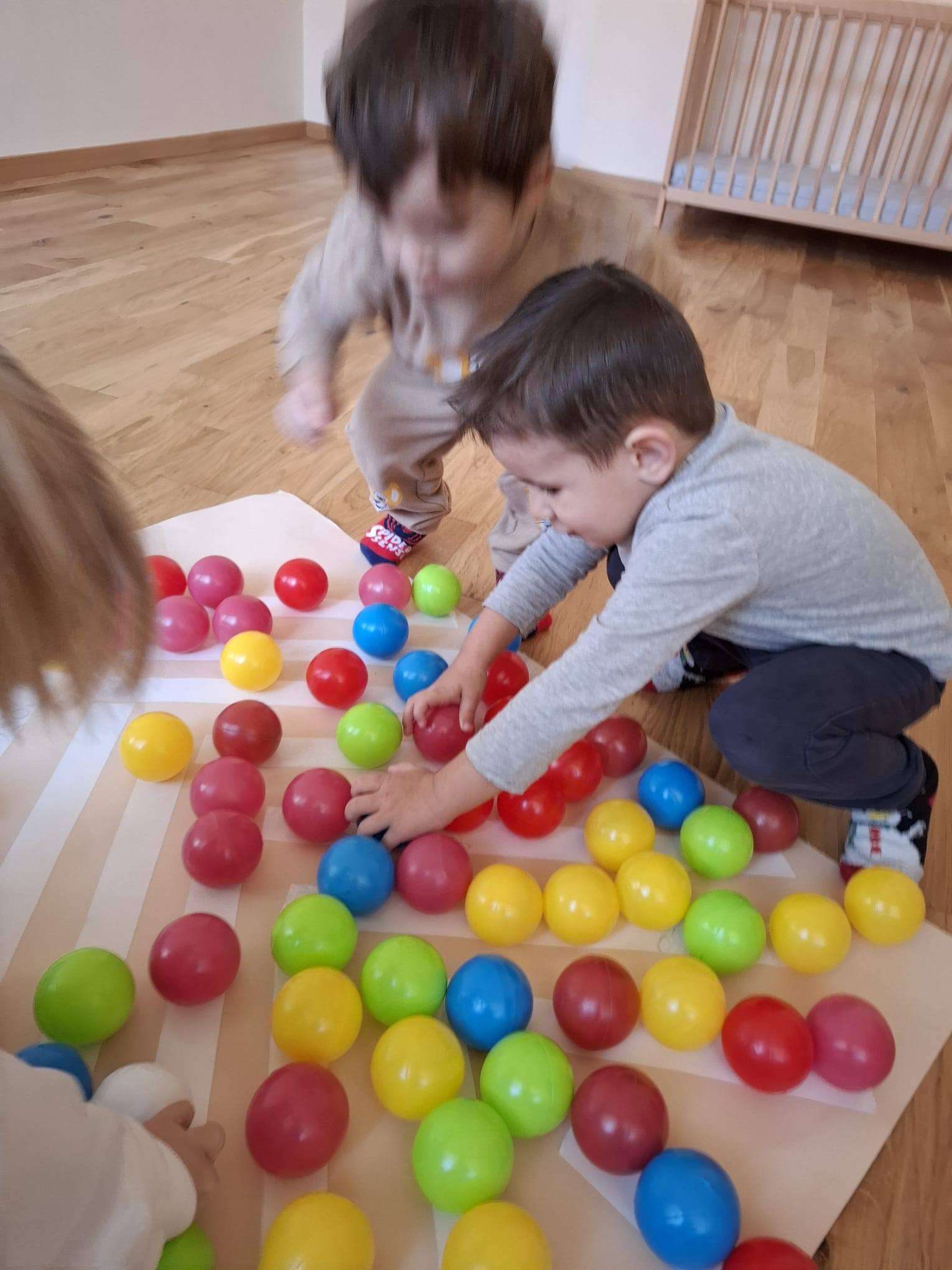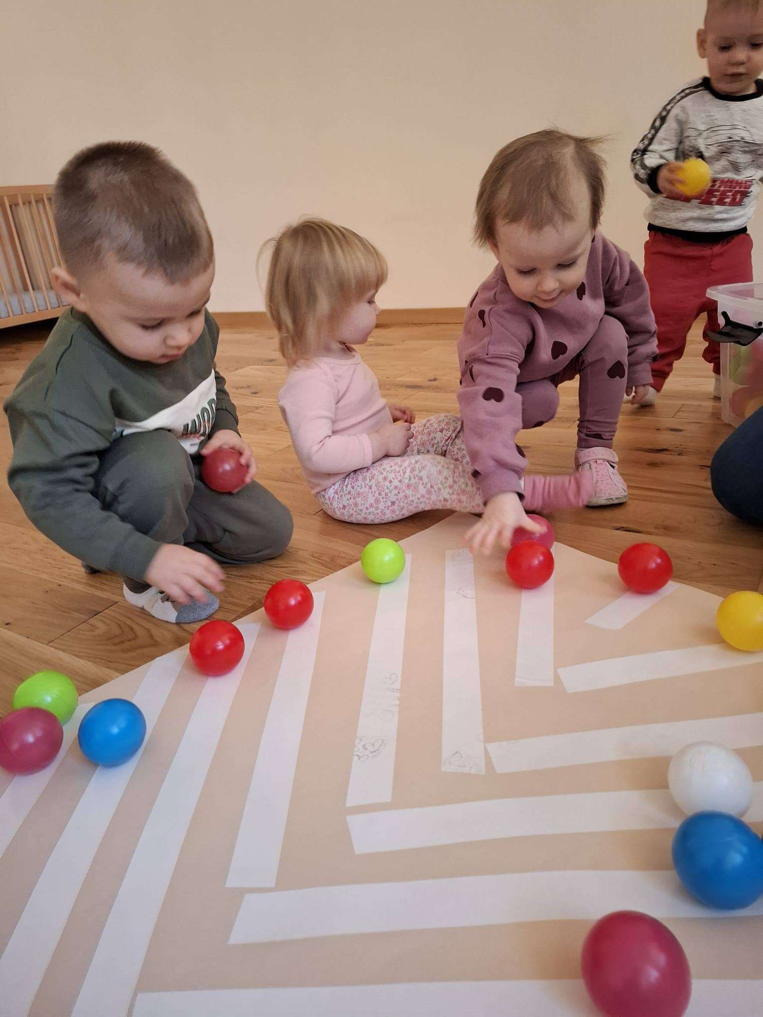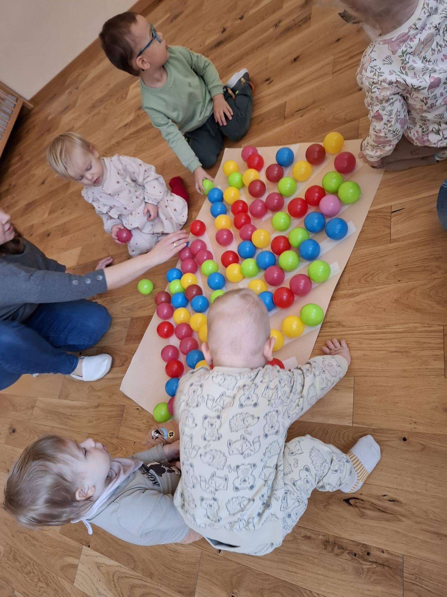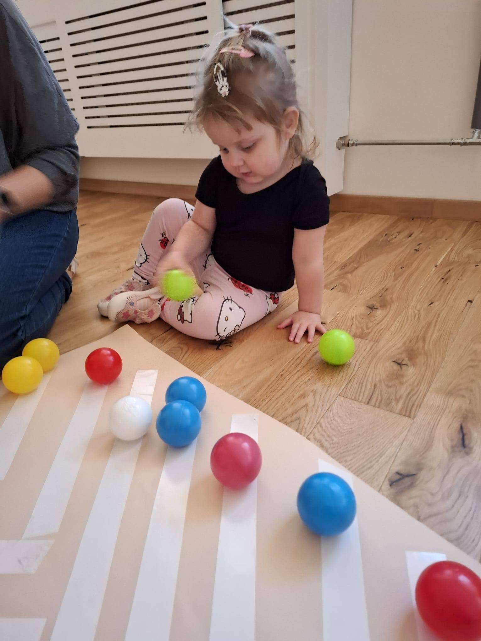 Zadaniem dzieci było dokładanie piłeczek w odpowiednie miejsca na przygotowanym wzorze – tak, aby wspólnie powstała piękna, kolorowa choinka.
