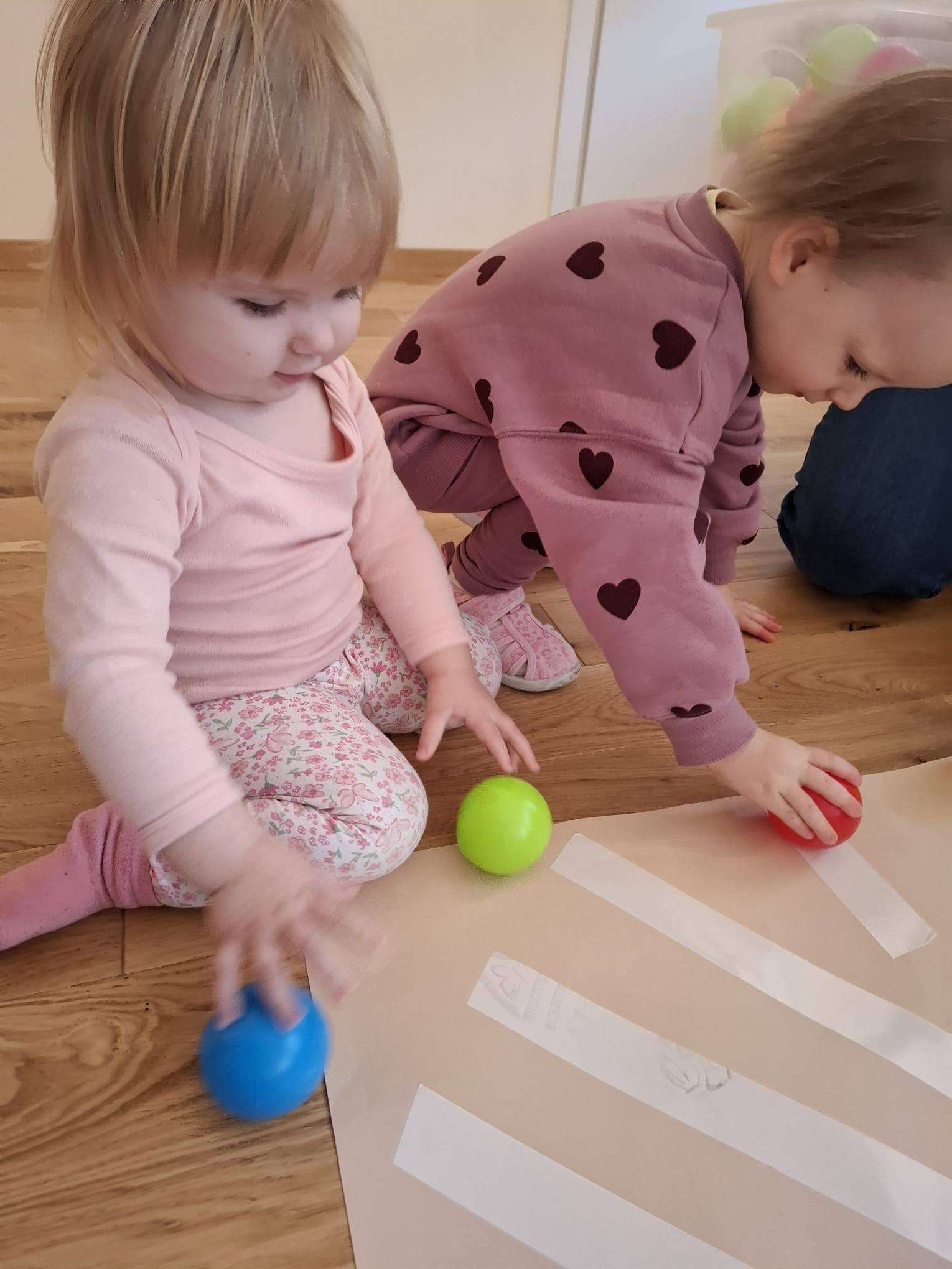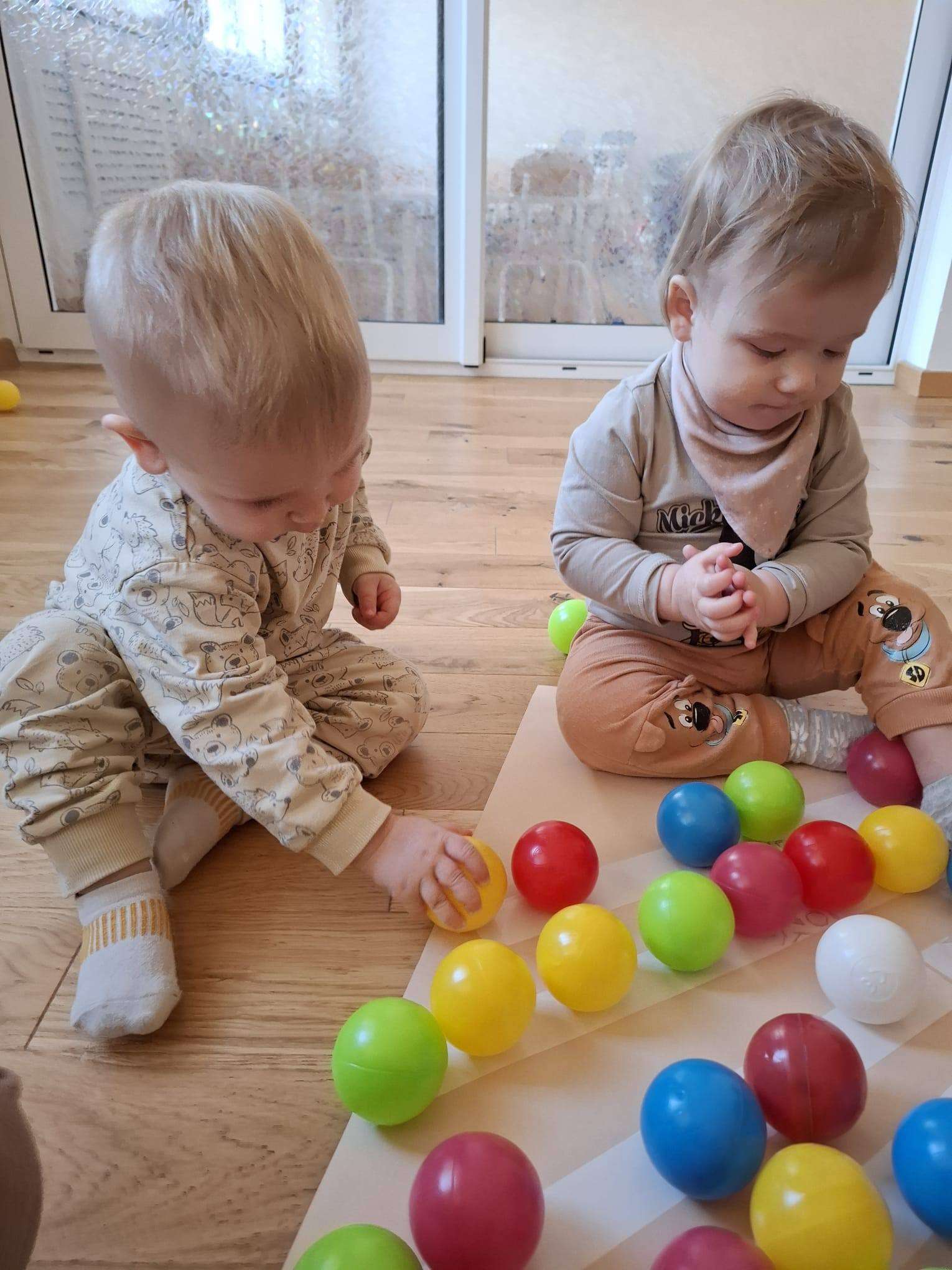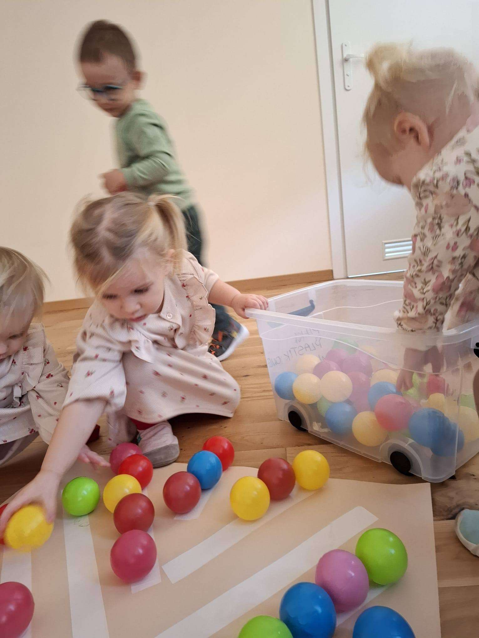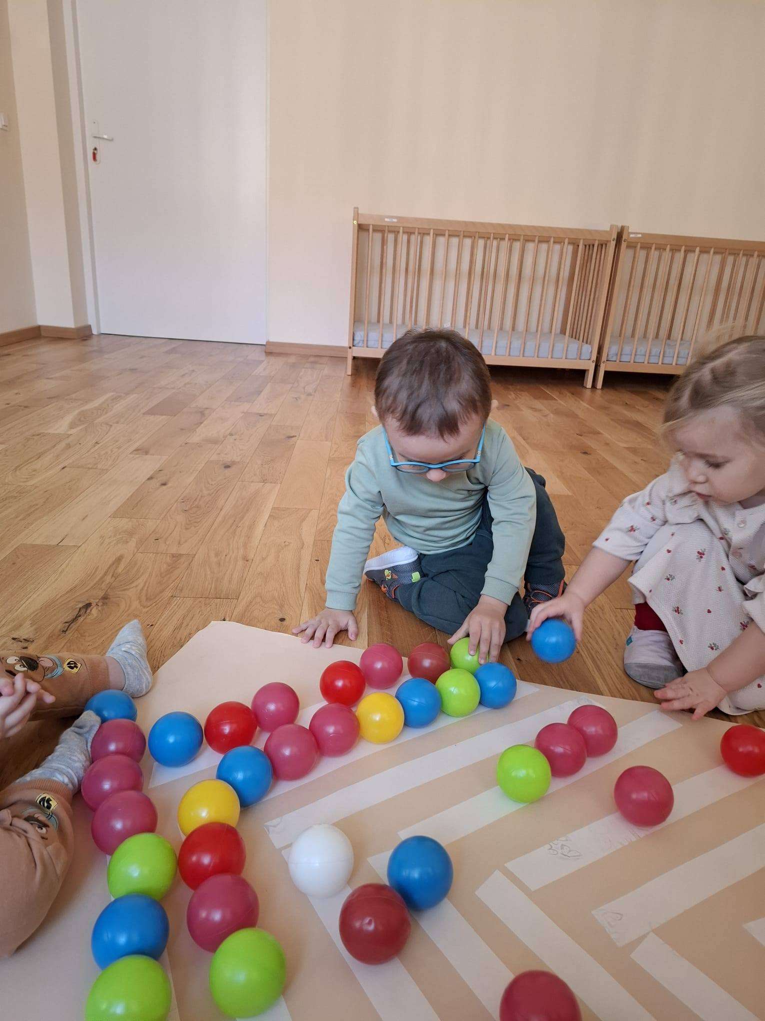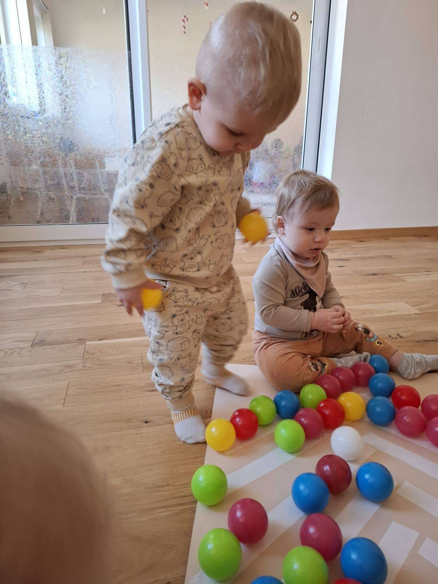 Zadaniem dzieci było dokładanie piłeczek w odpowiednie miejsca na przygotowanym wzorze – tak, aby wspólnie powstała piękna, kolorowa choinka.