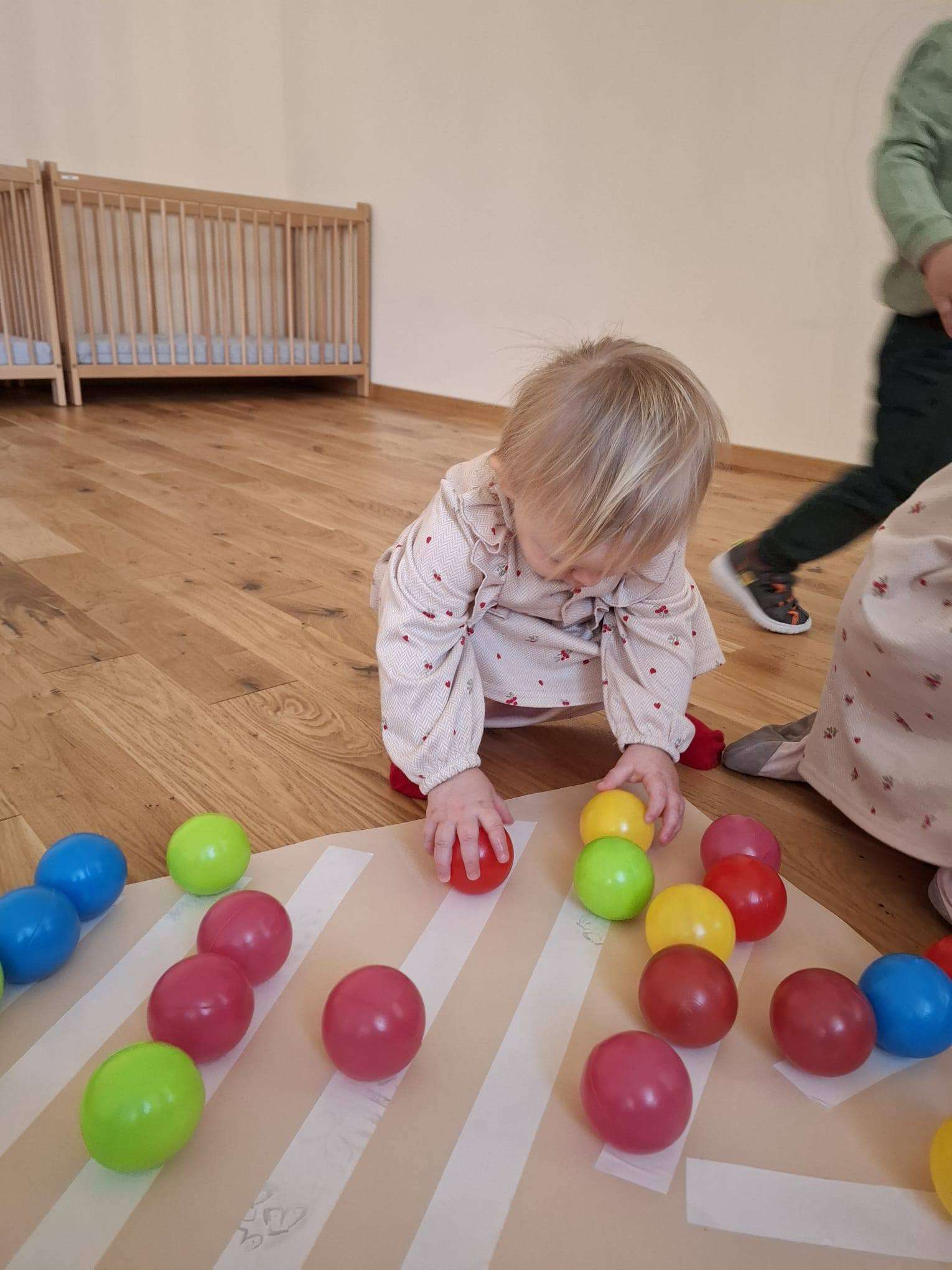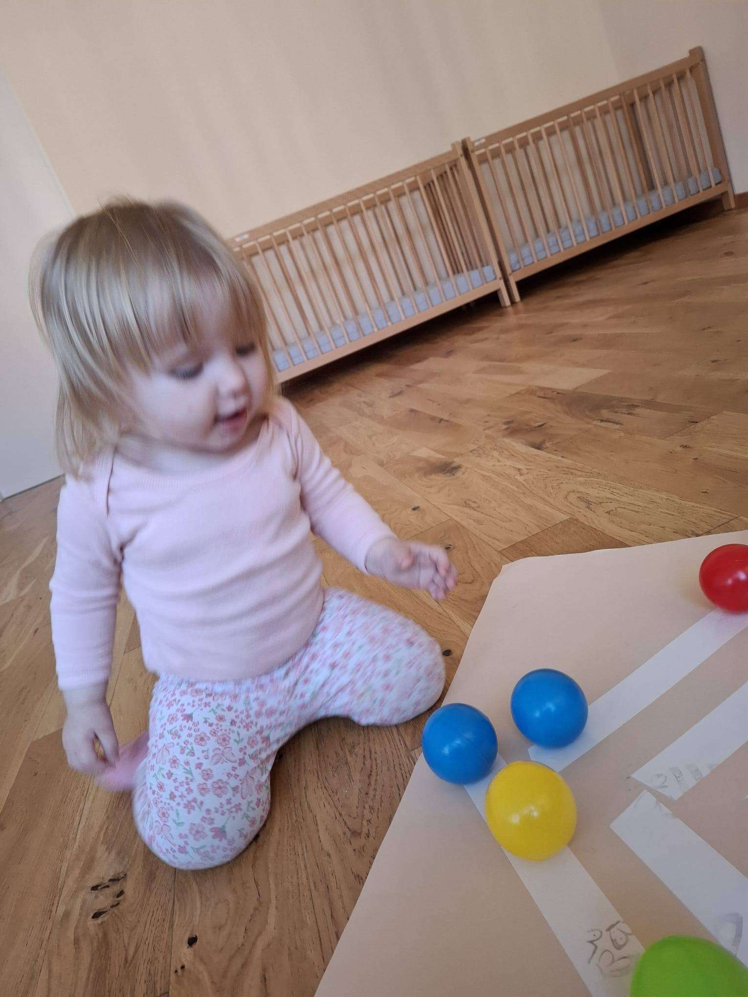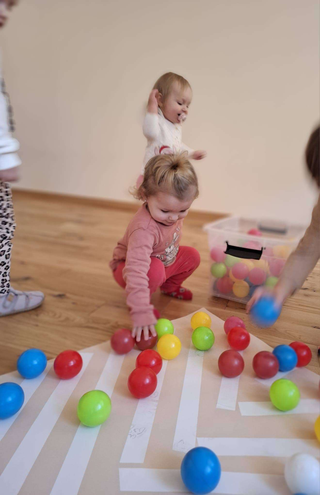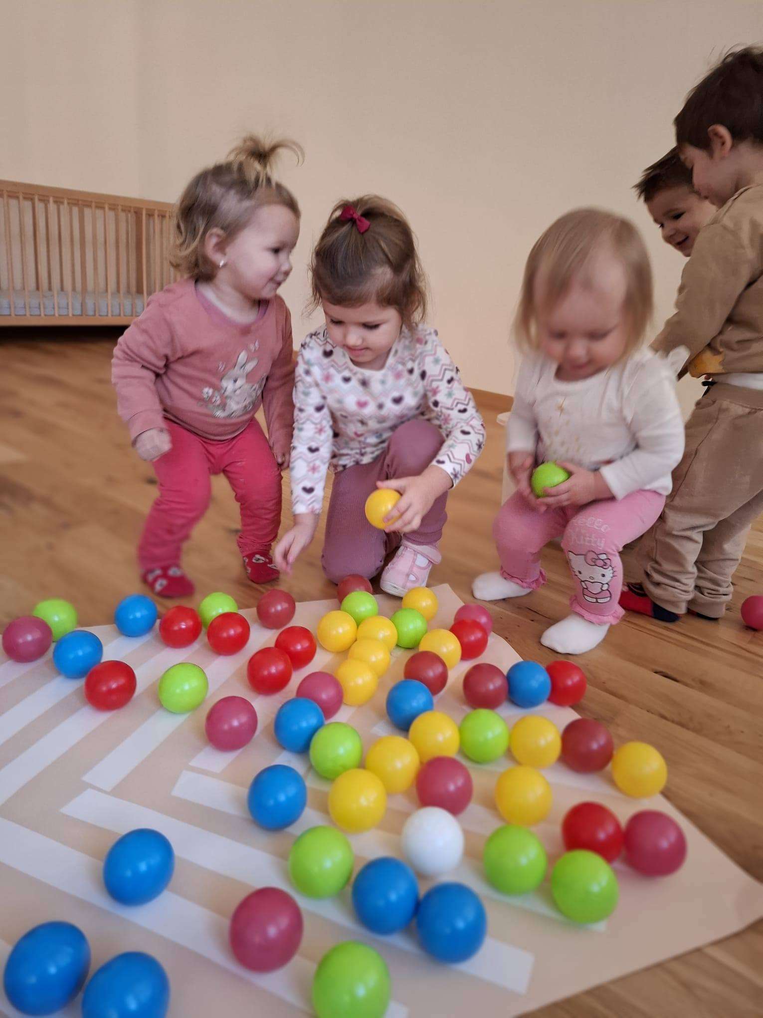 Zadaniem dzieci było dokładanie piłeczek w odpowiednie miejsca na przygotowanym wzorze – tak, aby wspólnie powstała piękna, kolorowa choinka.