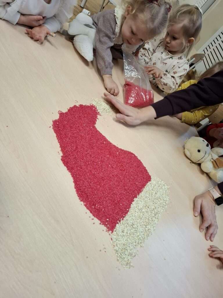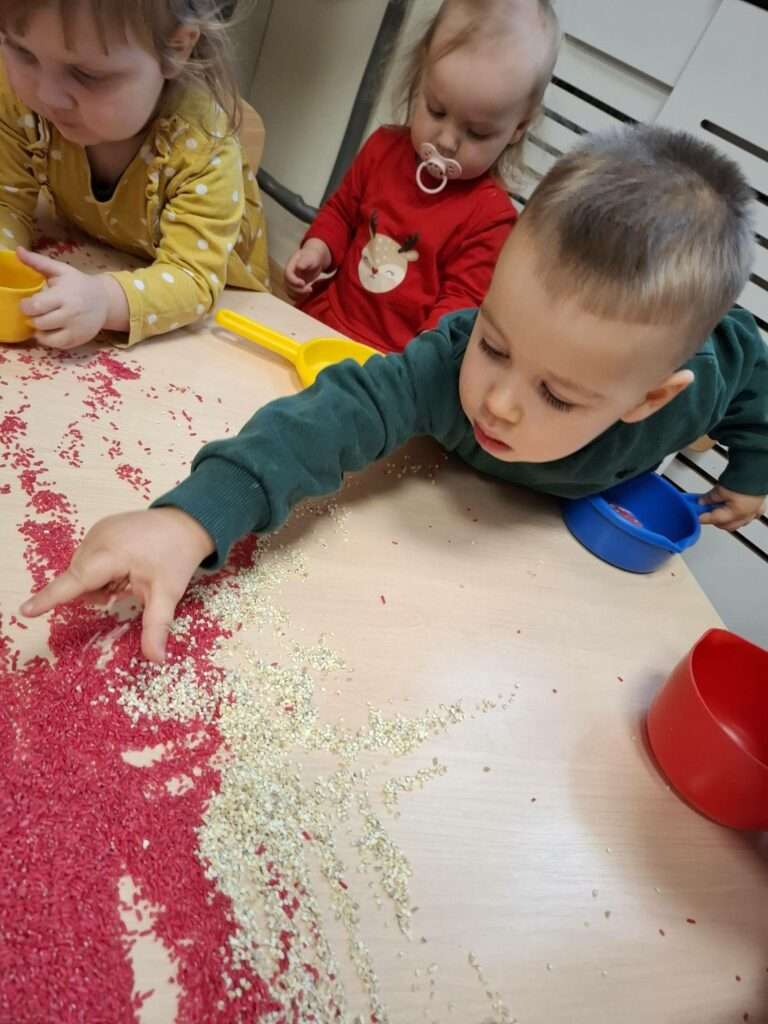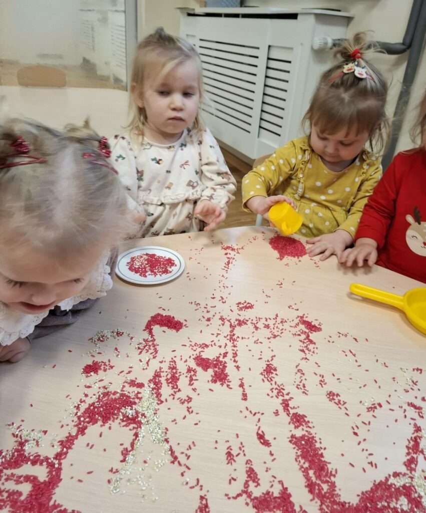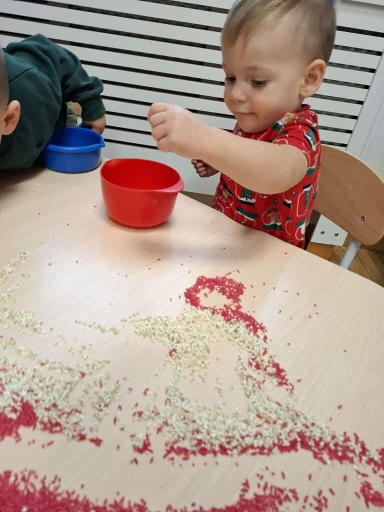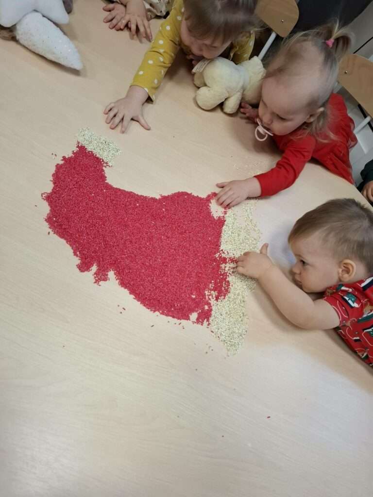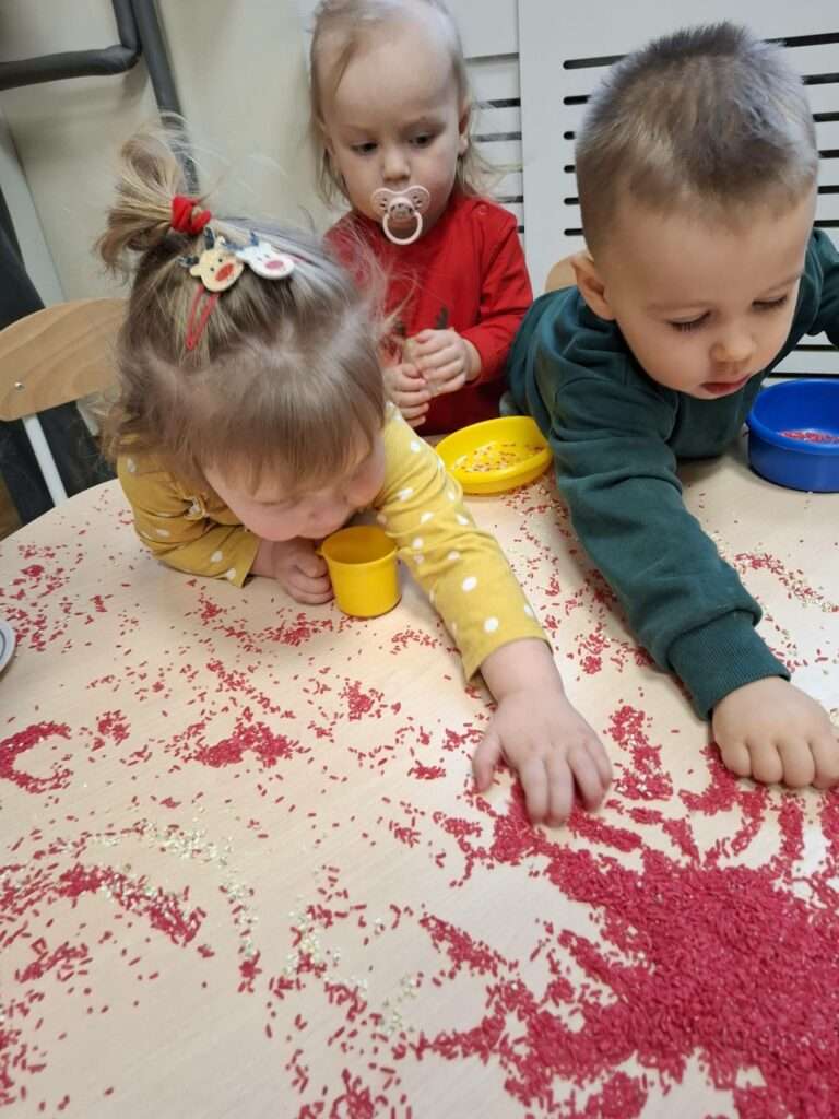 Maluszki z ogromną ciekawością przesypywały, mieszały i dotykały kolorowego ryżu w świątecznych barwach, nawiązując do tematu choinki i czapki Mikołaja. Takie aktywności rozwijają małą motorykę, wspierają zmysły i dają mnóstwo radości.![]()