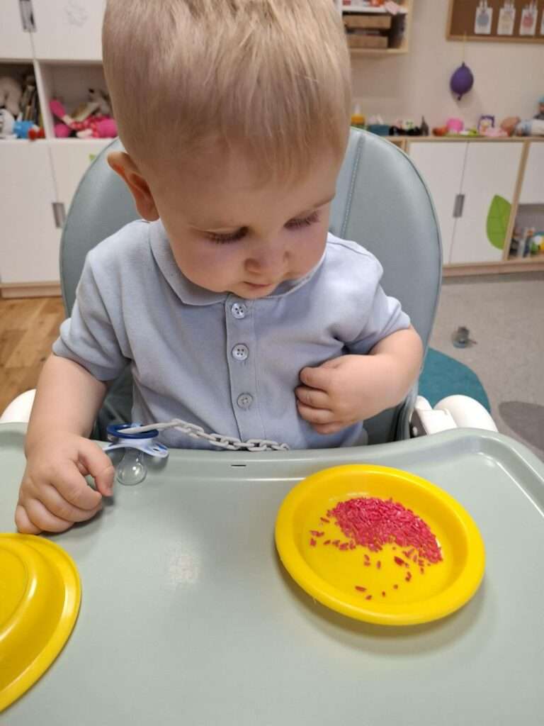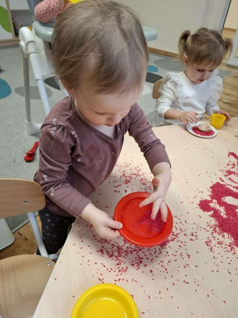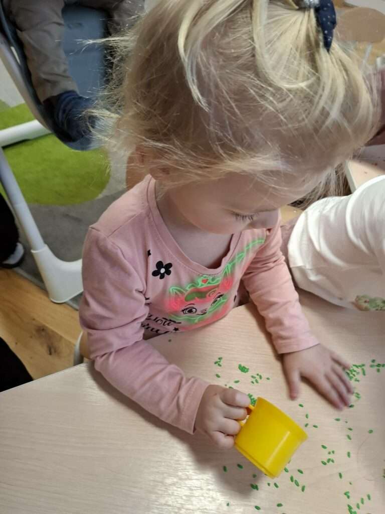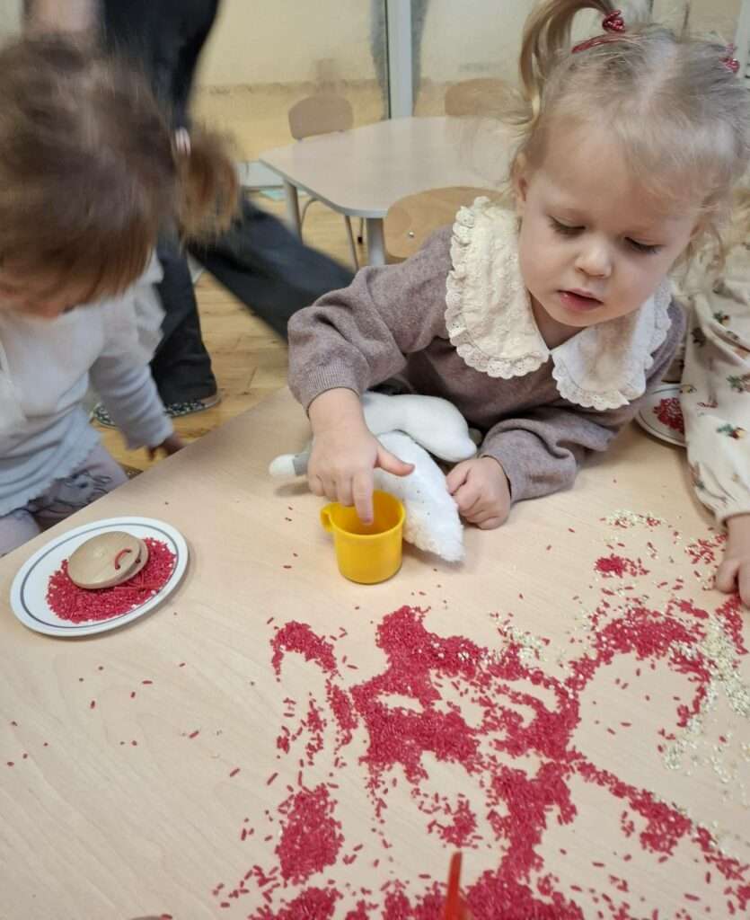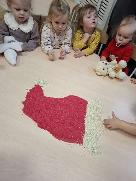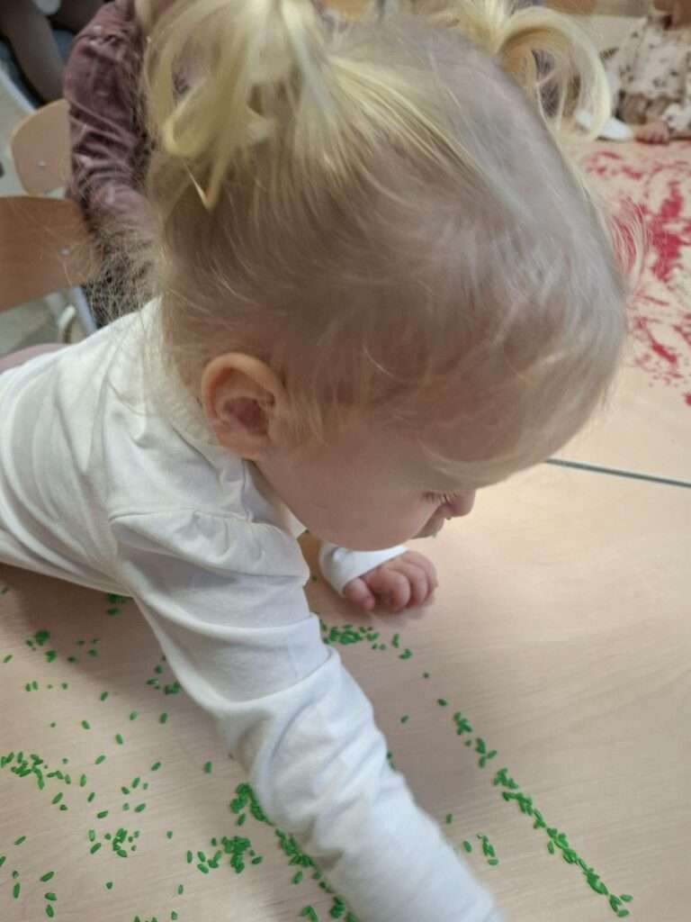 Maluszki z ogromną ciekawością przesypywały, mieszały i dotykały kolorowego ryżu w świątecznych barwach, nawiązując do tematu choinki i czapki Mikołaja. Takie aktywności rozwijają małą motorykę, wspierają zmysły i dają mnóstwo radości.![]()