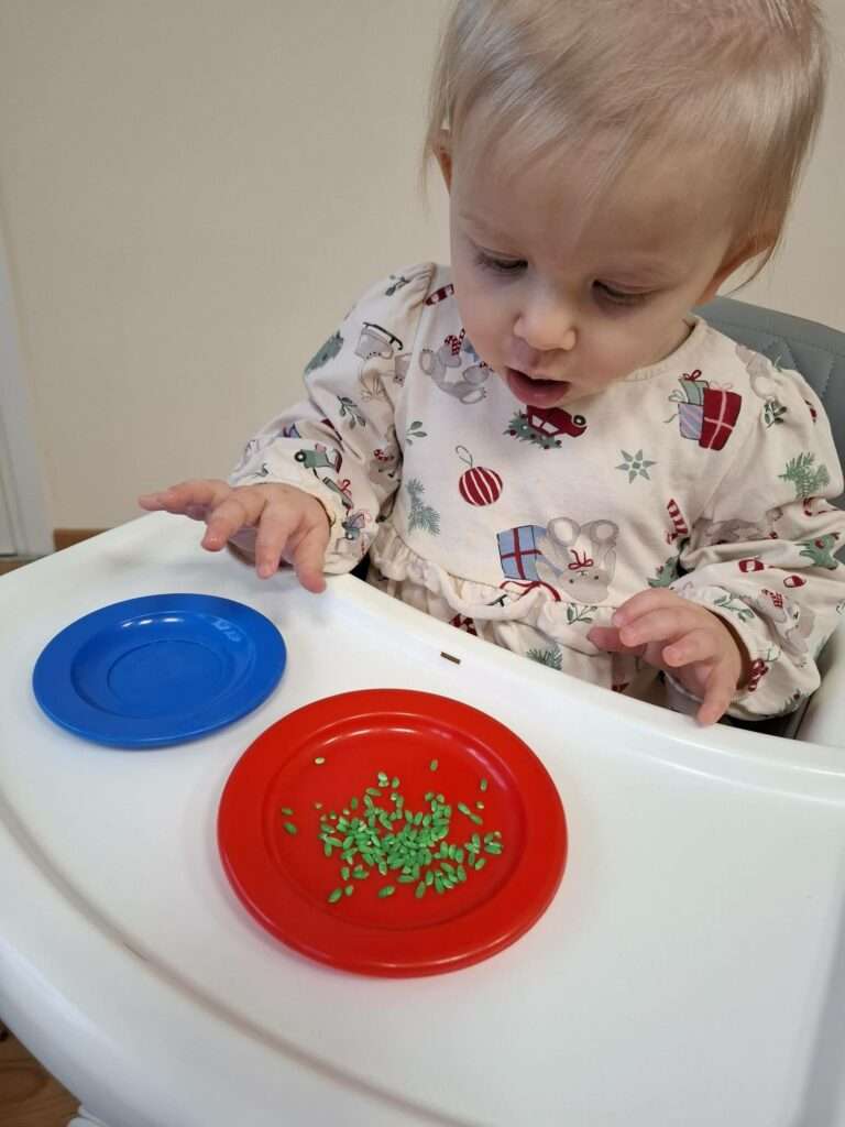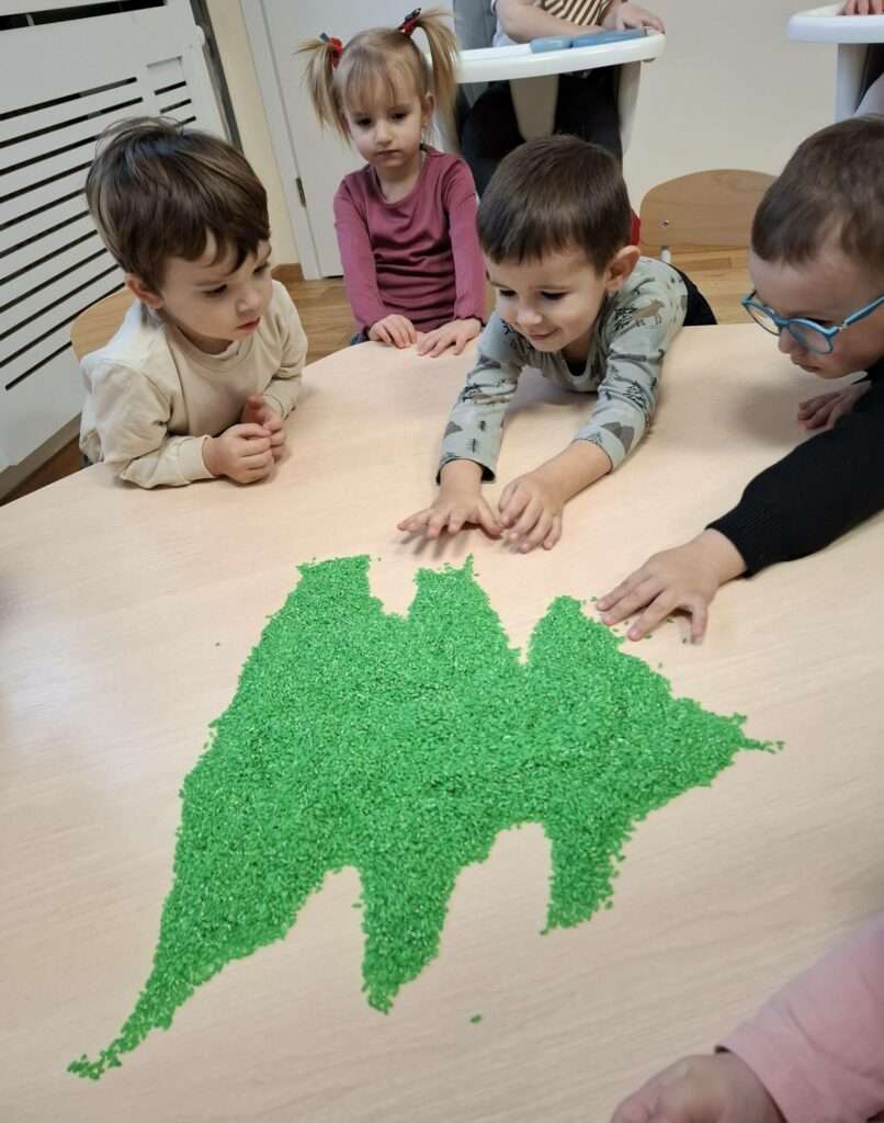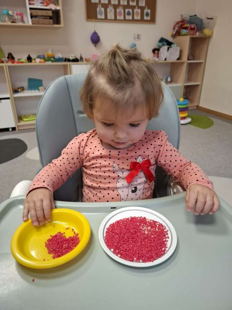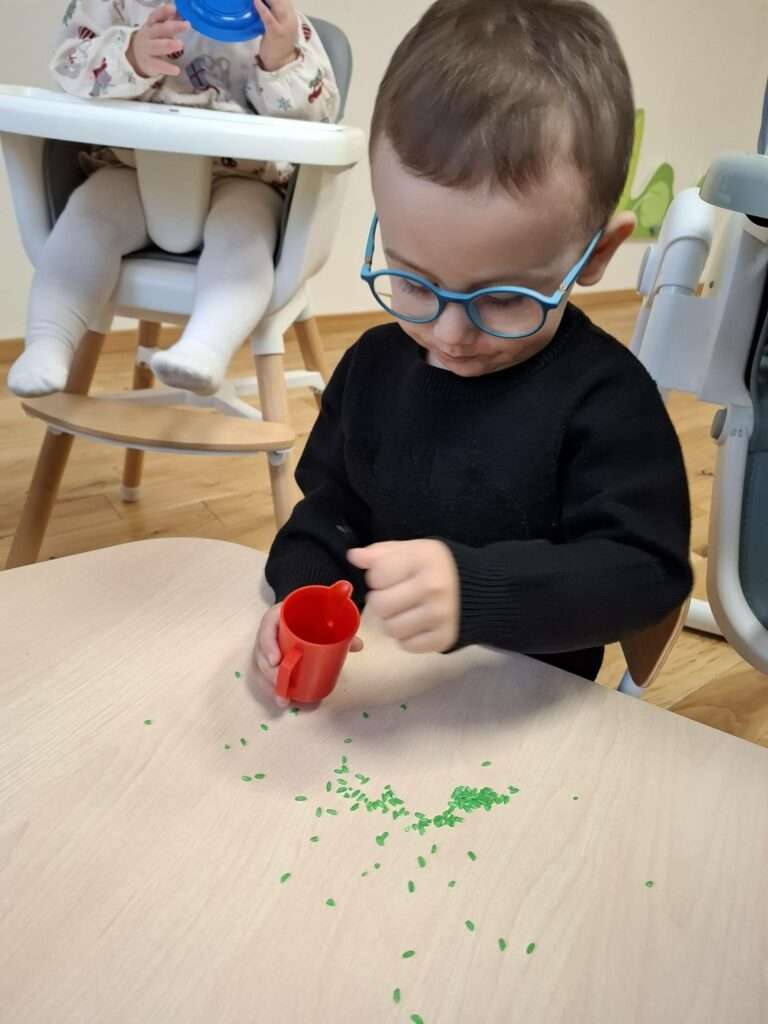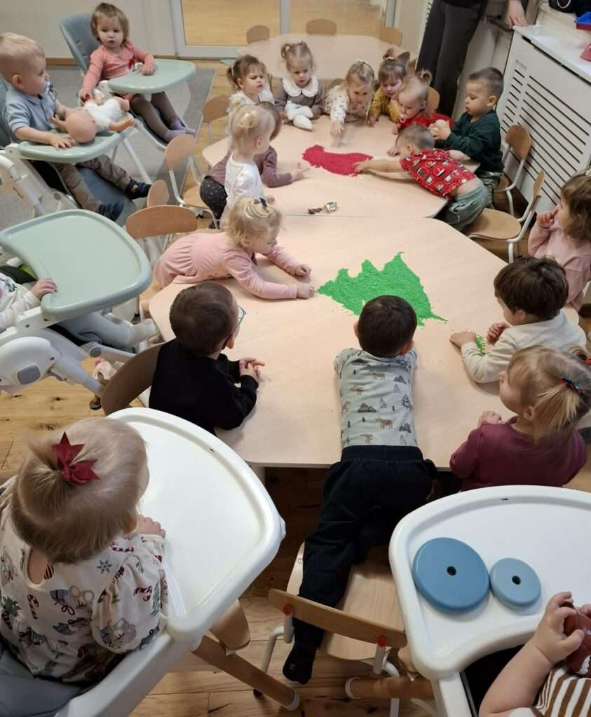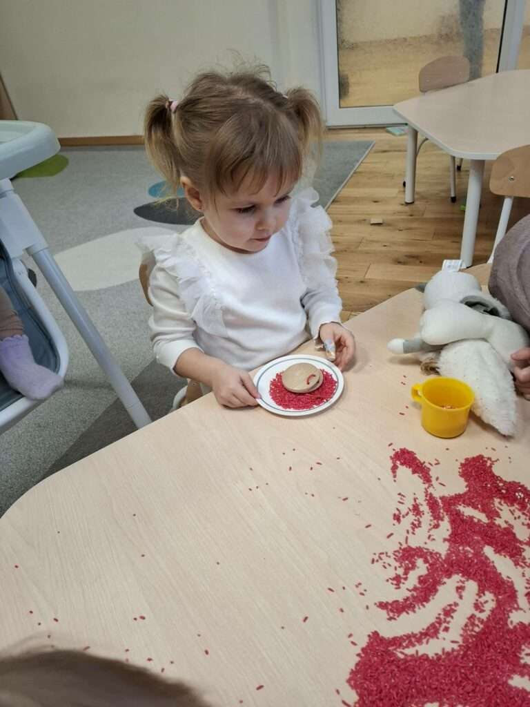 Maluszki z ogromną ciekawością przesypywały, mieszały i dotykały kolorowego ryżu w świątecznych barwach, nawiązując do tematu choinki i czapki Mikołaja. Takie aktywności rozwijają małą motorykę, wspierają zmysły i dają mnóstwo radości.![]()