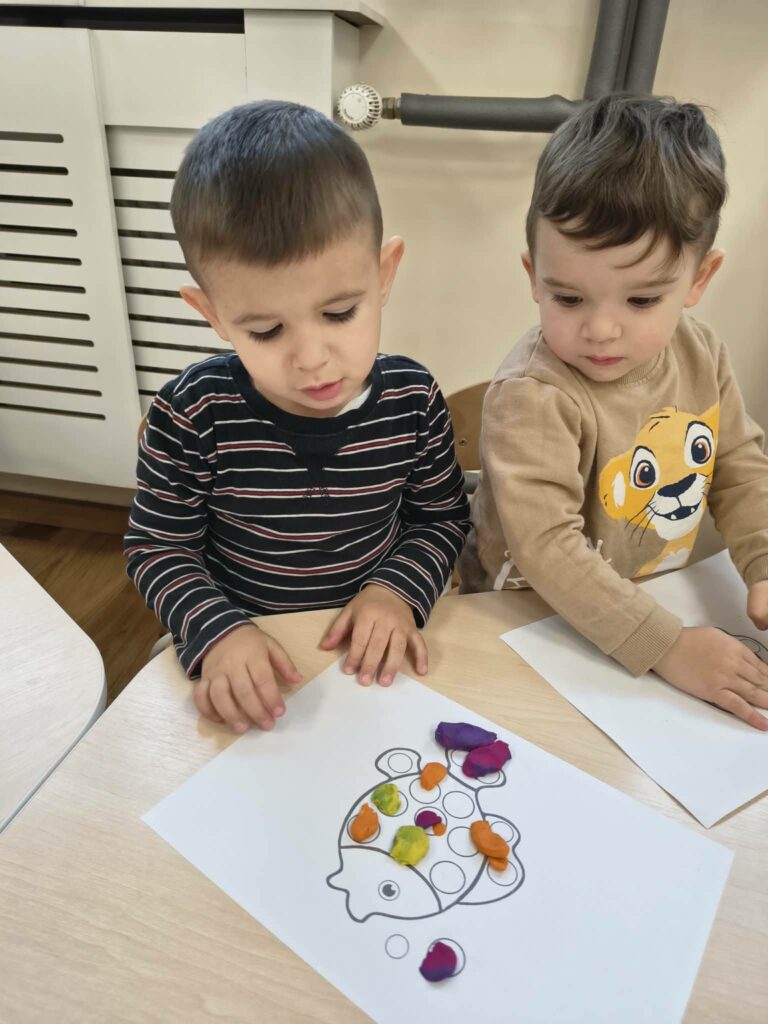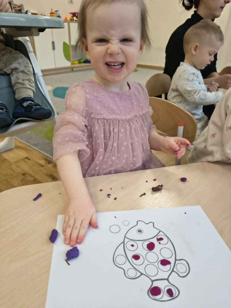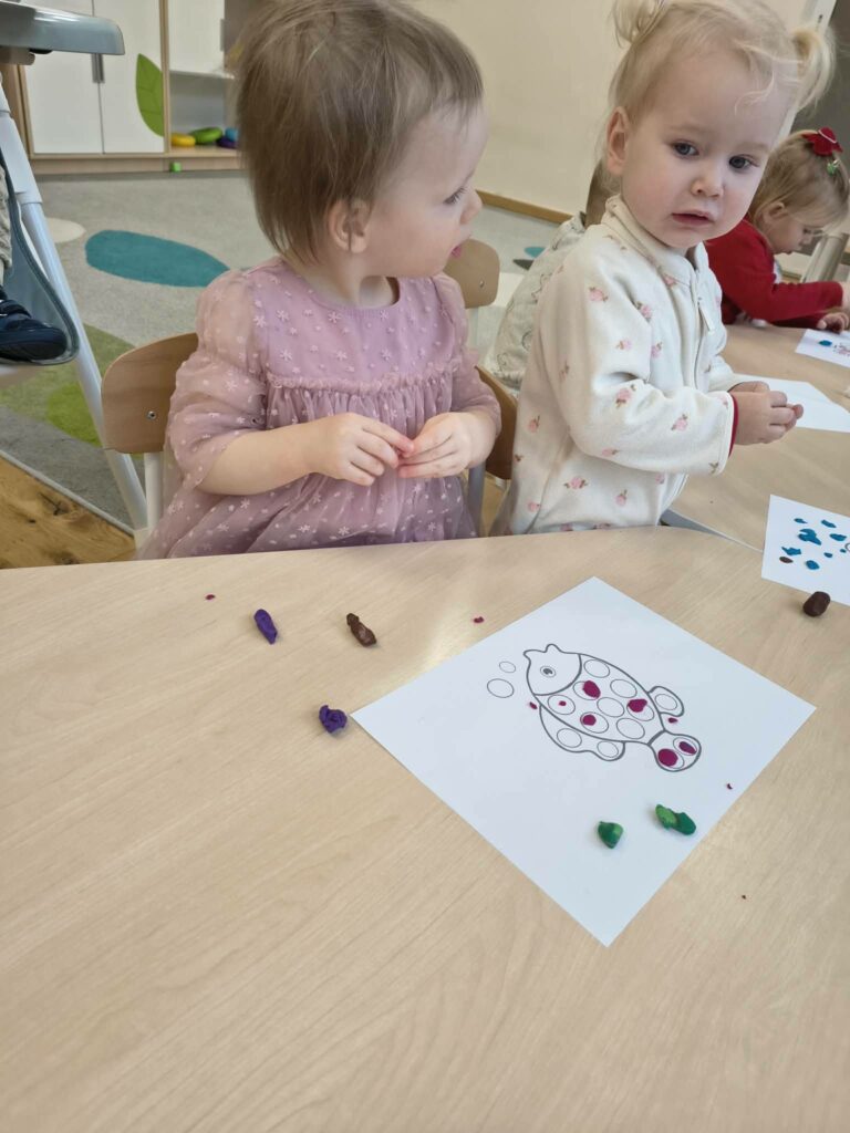 Podczas zajęć plastycznych dzieci wyklejały plasteliną kolorowe rybki, ćwicząc przy tym małą motorykę oraz rozwijając swoją wyobraźnię. Było twórczo, kolorowo i bardzo wesoło. ![]()