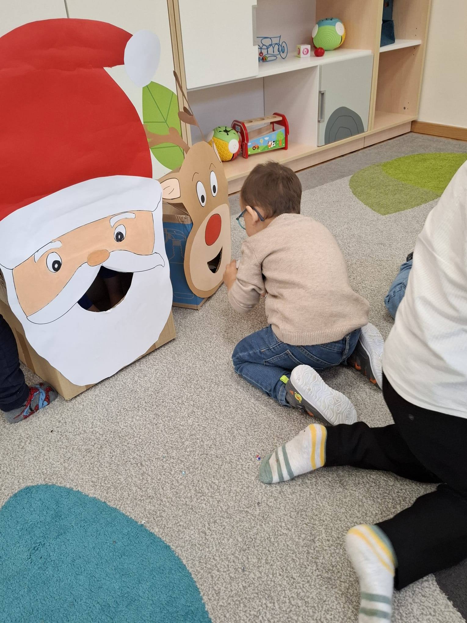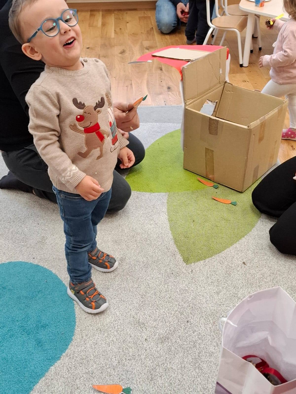 Nie zabrakło także radości z karmienia ciasteczkami Świętego Mikołaja oraz marchewkami jego renifera Rudolfa. Dzieci z entuzjazmem podjęły również aktywność ruchową – szukały ukrytych szyszek, świetnie się przy tym bawiąc.