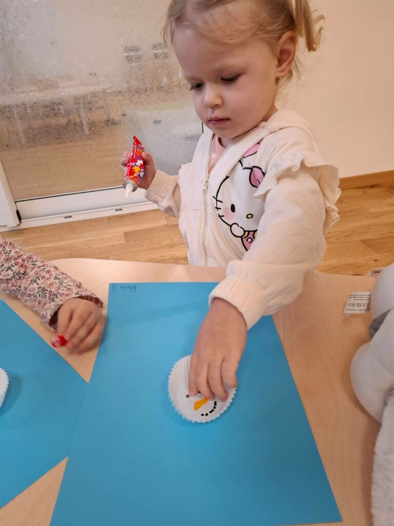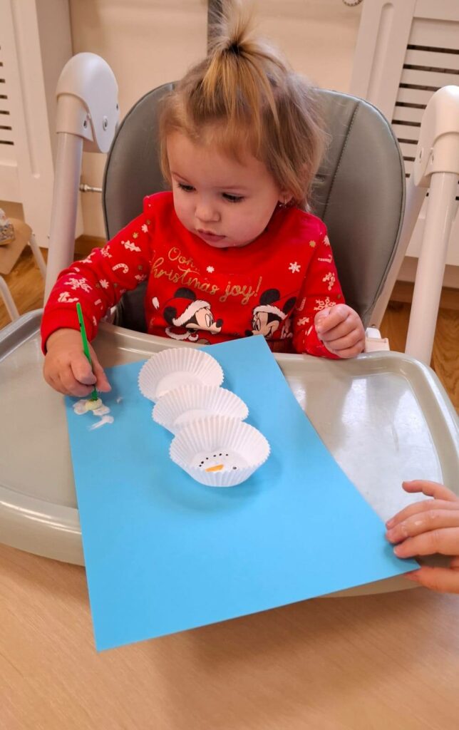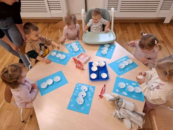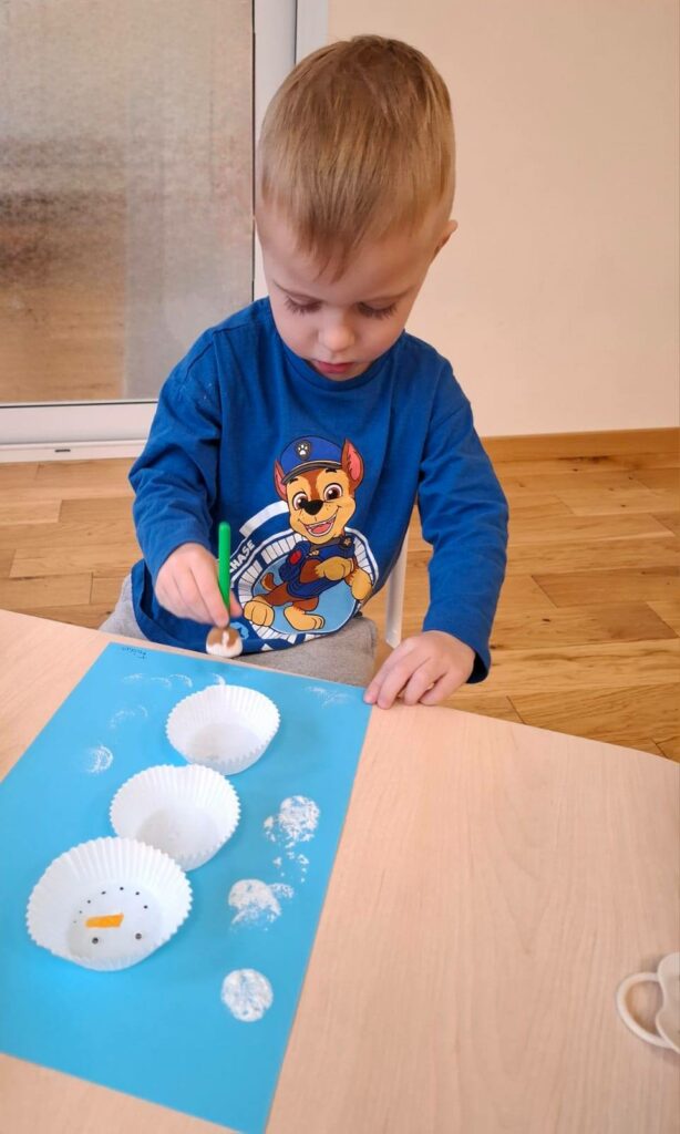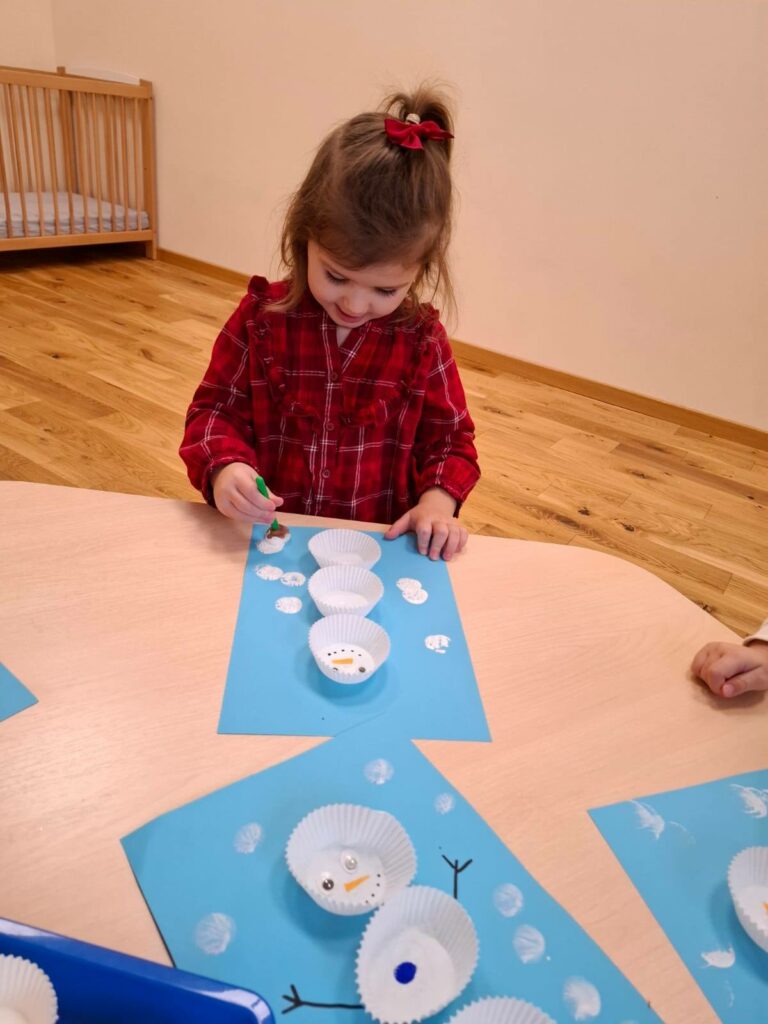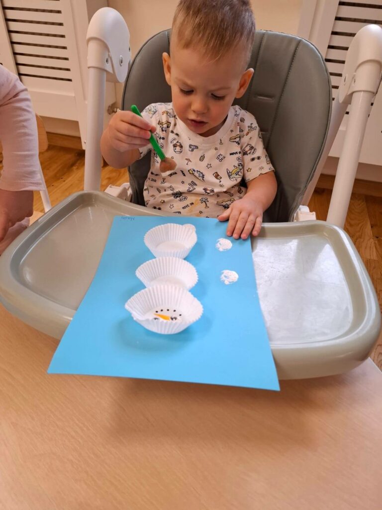 W naszym żłobku panowała prawdziwie zimowa atmosfera! Dzieci wykonały pracę plastyczną przedstawiającą bałwanka, wykorzystując papilotki do muffinek. Dodatkowo mali artyści odbijali stempelki imitujące padający śnieg, co sprawiło im mnóstwo radości.