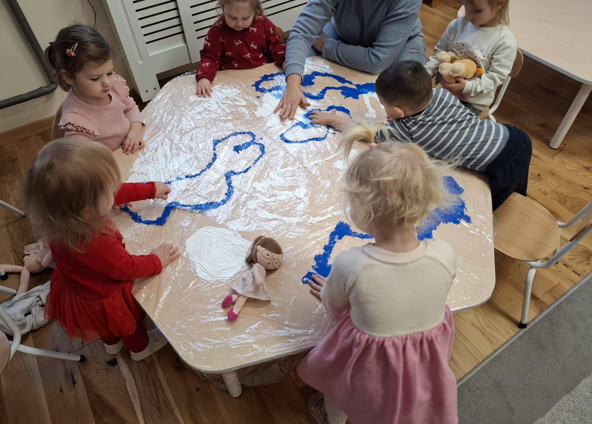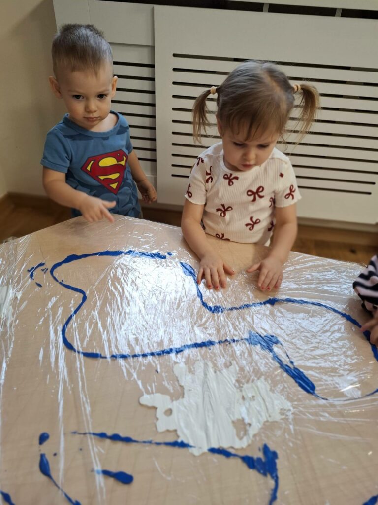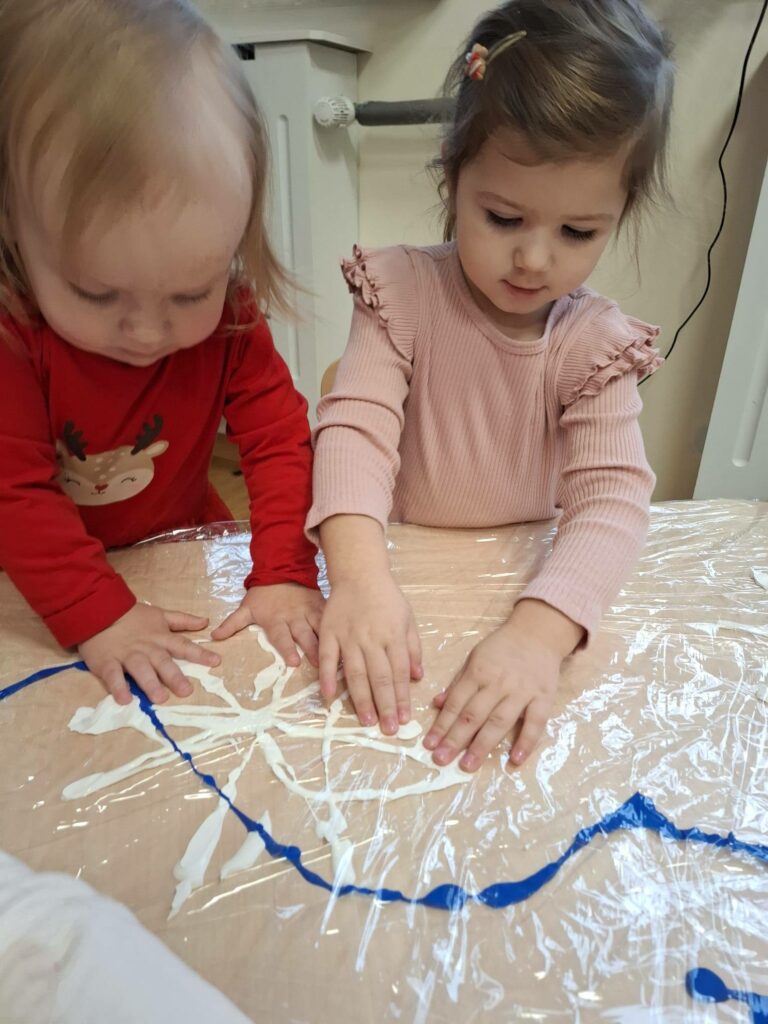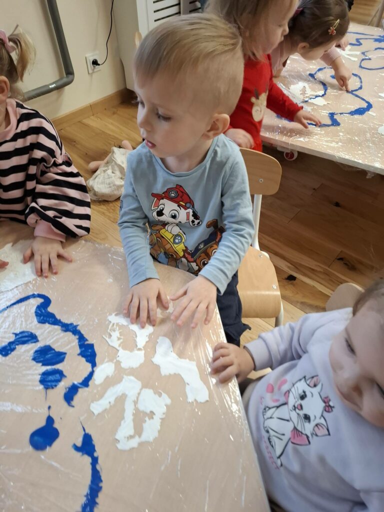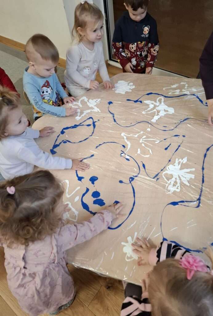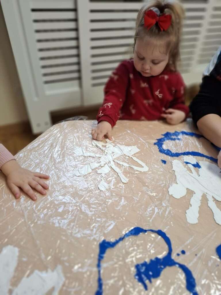 Była to wspólna, grupowa praca, pełna radości, ciekawości i sensorycznych doświadczeń. Dzieci obserwowały, jak kolory się łączą i zmieniają, tworząc razem wyjątkowy zimowy pejzaż.