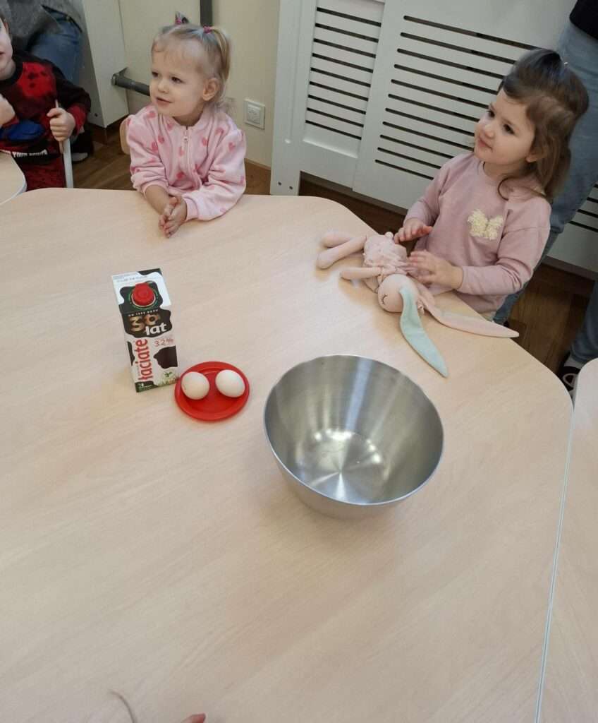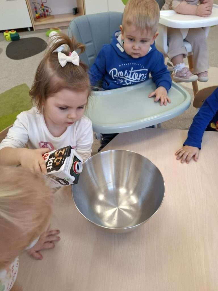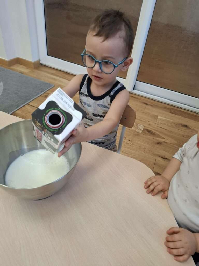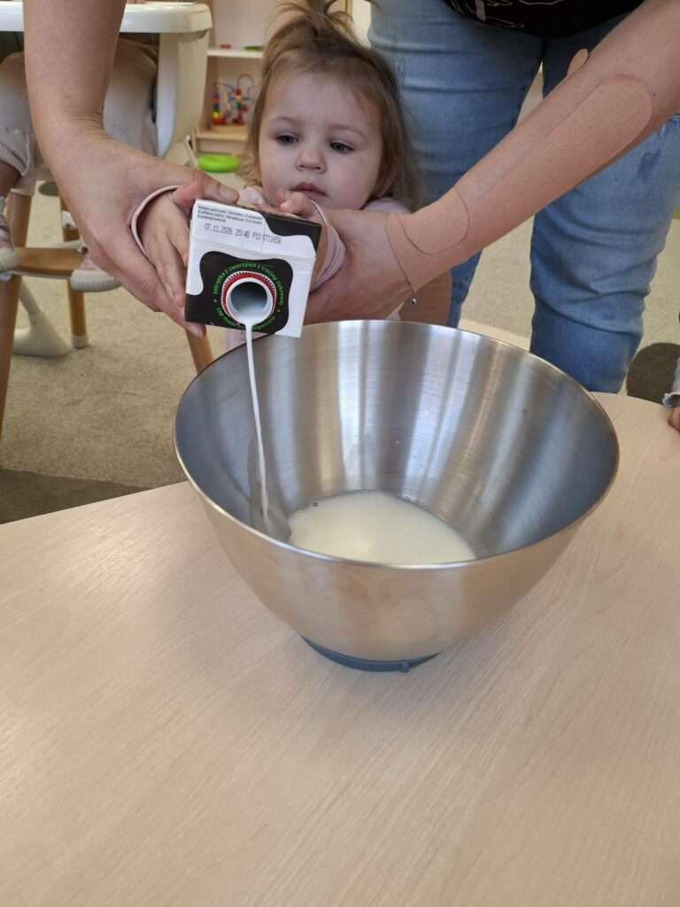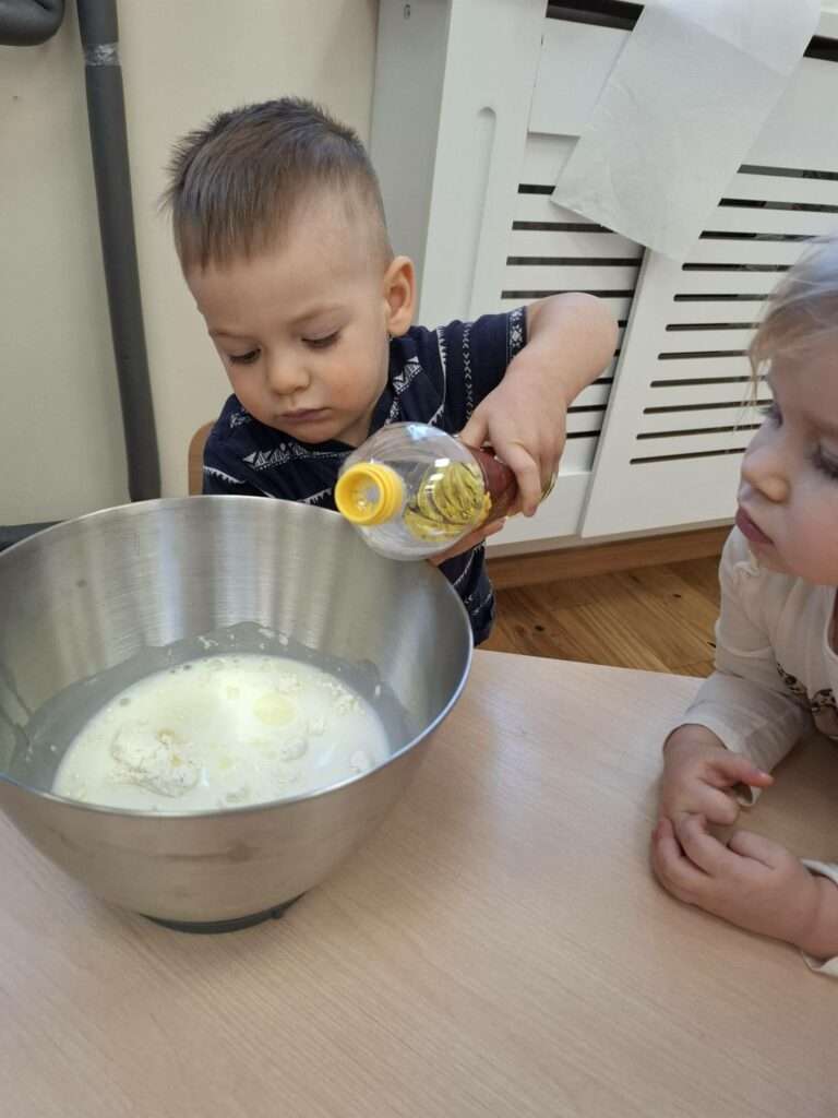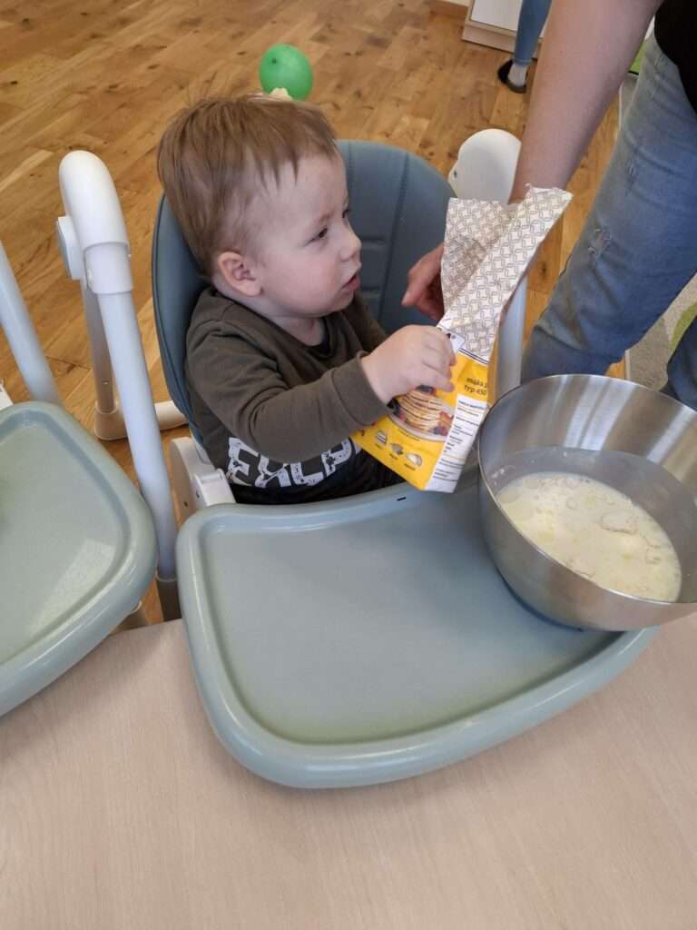 W naszym żłobku odbyły się zajęcia kulinarne z okazji Dnia Naleśnika. Dzieci poznały produkty potrzebne do przygotowania ciasta naleśnikowego oraz z radością uczestniczyły w mieszaniu składników.