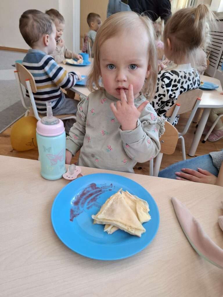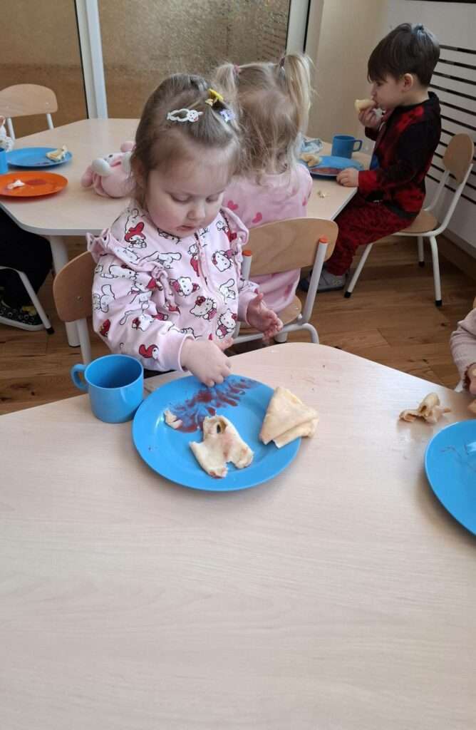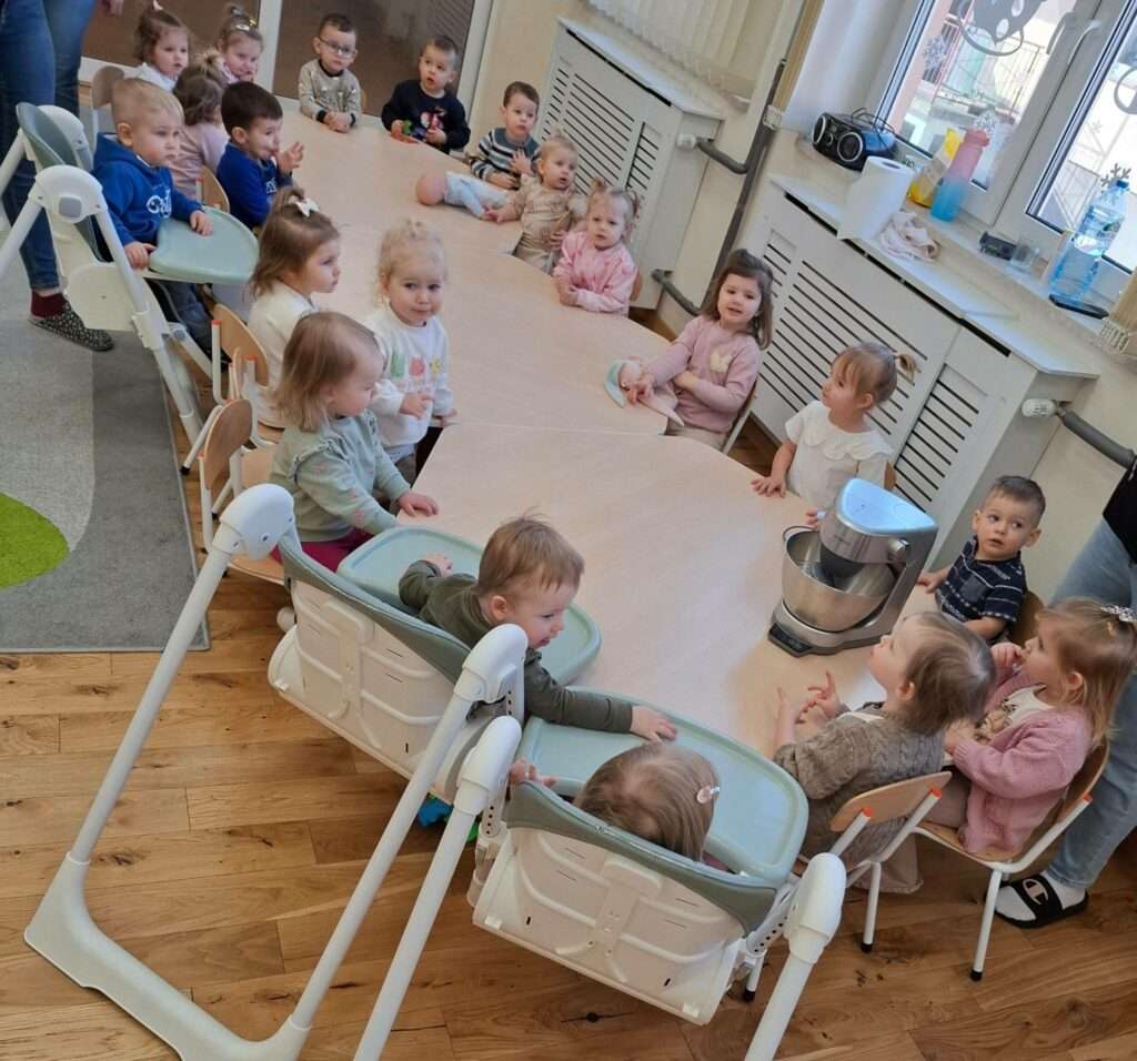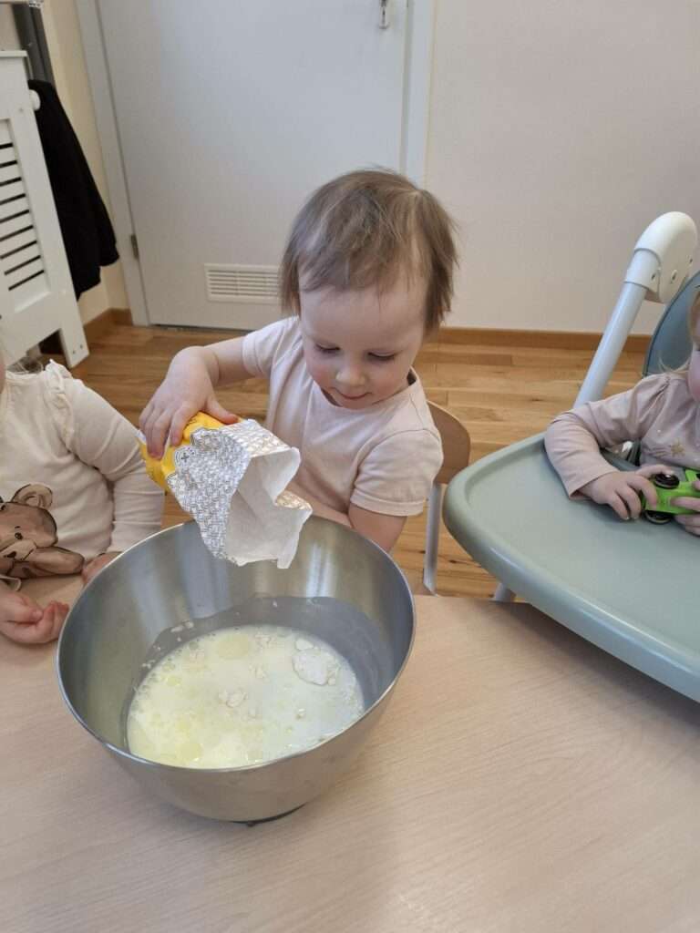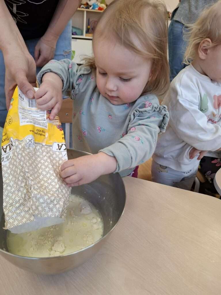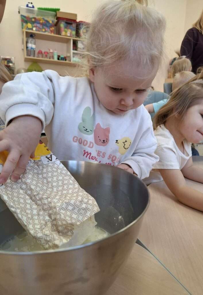 W naszym żłobku odbyły się zajęcia kulinarne z okazji Dnia Naleśnika. Dzieci poznały produkty potrzebne do przygotowania ciasta naleśnikowego oraz z radością uczestniczyły w mieszaniu składników.