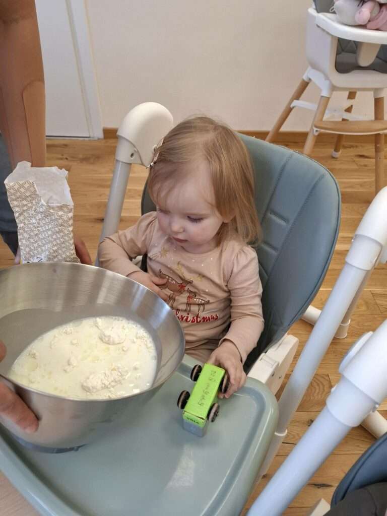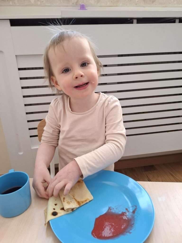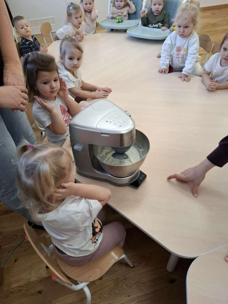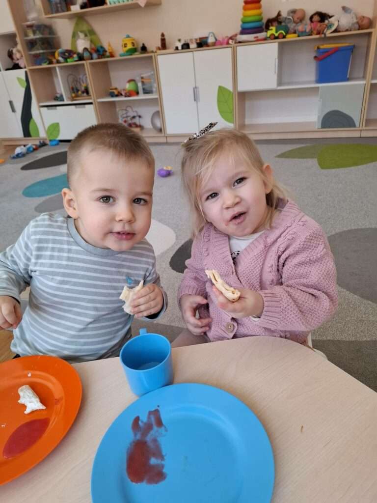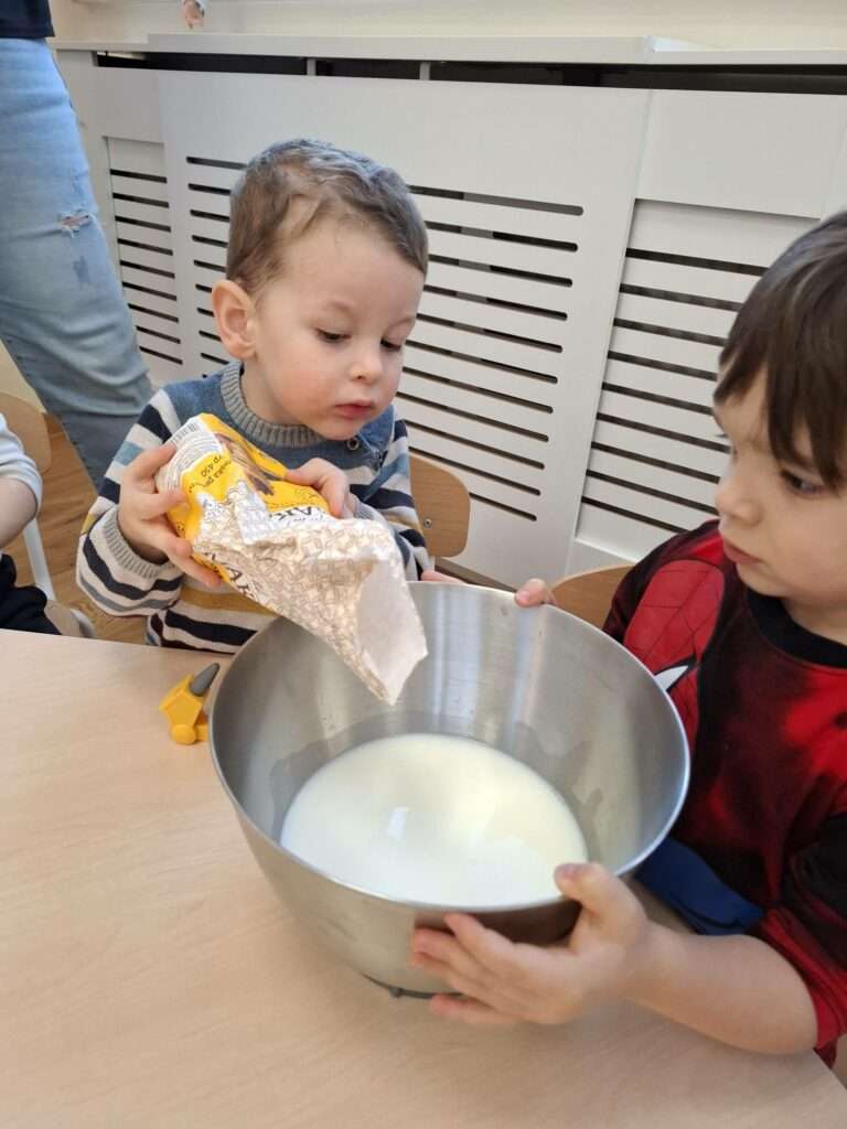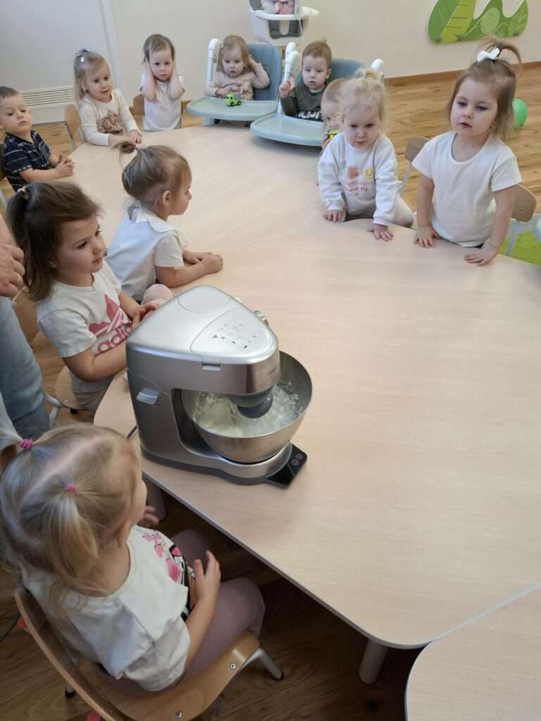 W naszym żłobku odbyły się zajęcia kulinarne z okazji Dnia Naleśnika. Dzieci poznały produkty potrzebne do przygotowania ciasta naleśnikowego oraz z radością uczestniczyły w mieszaniu składników.