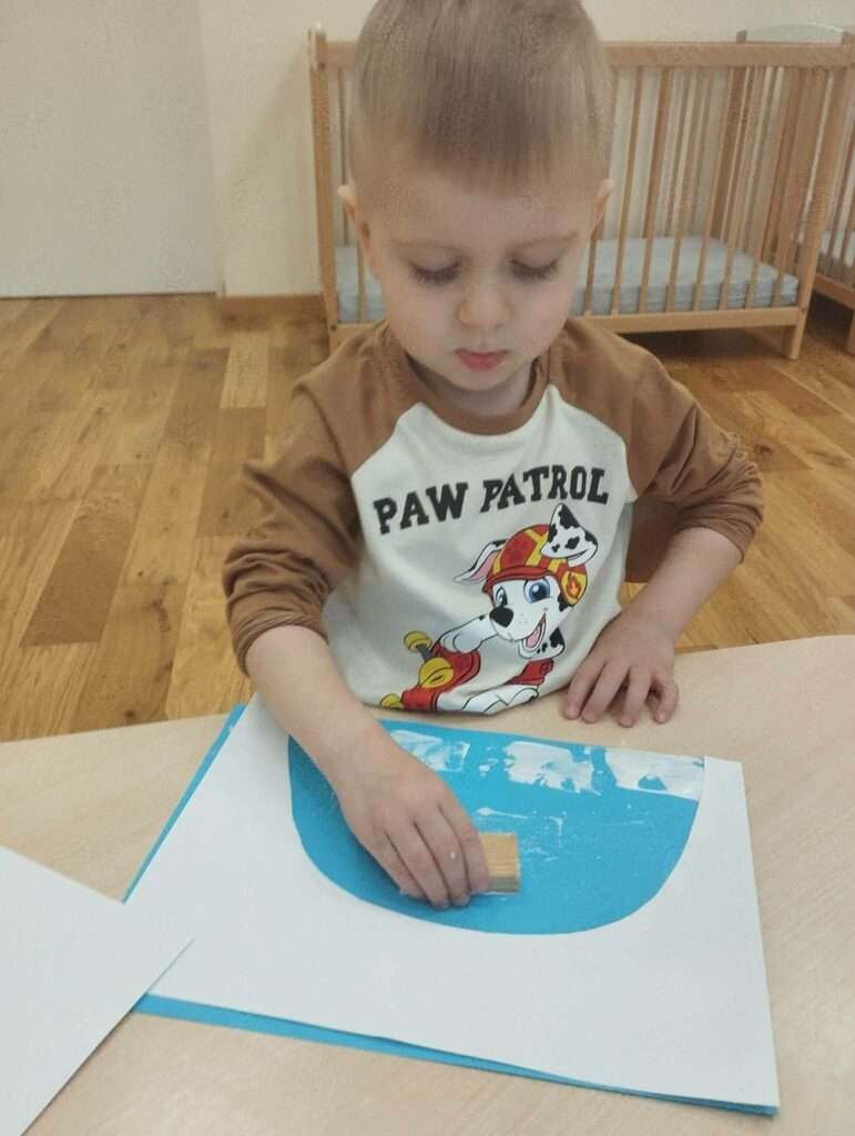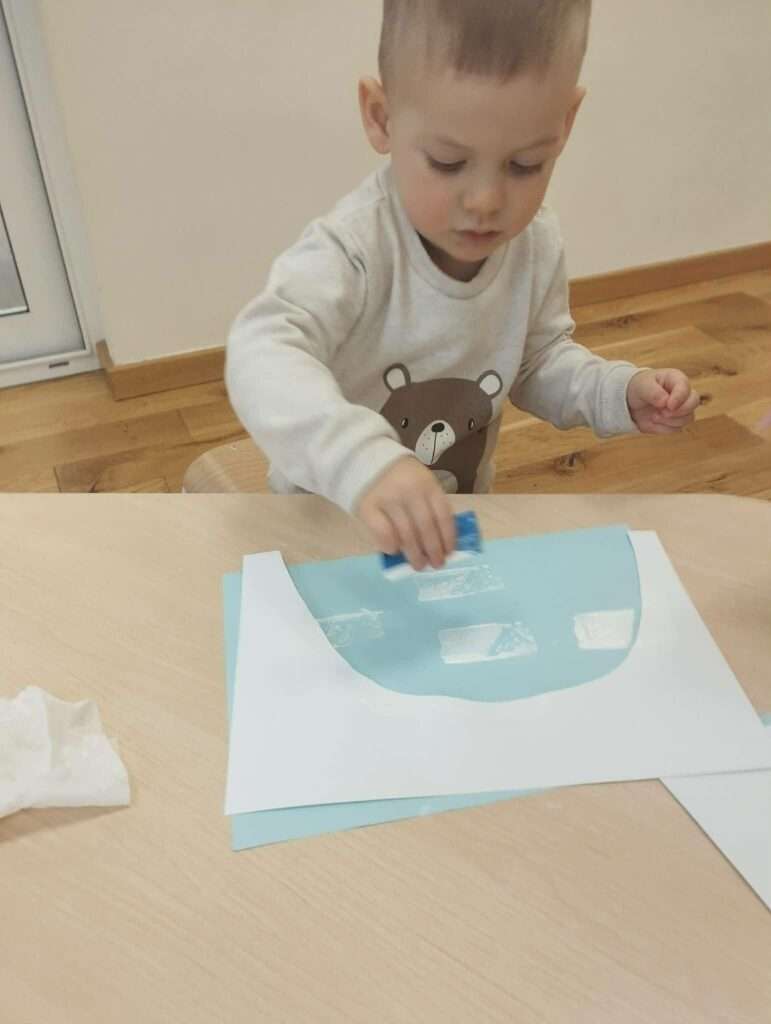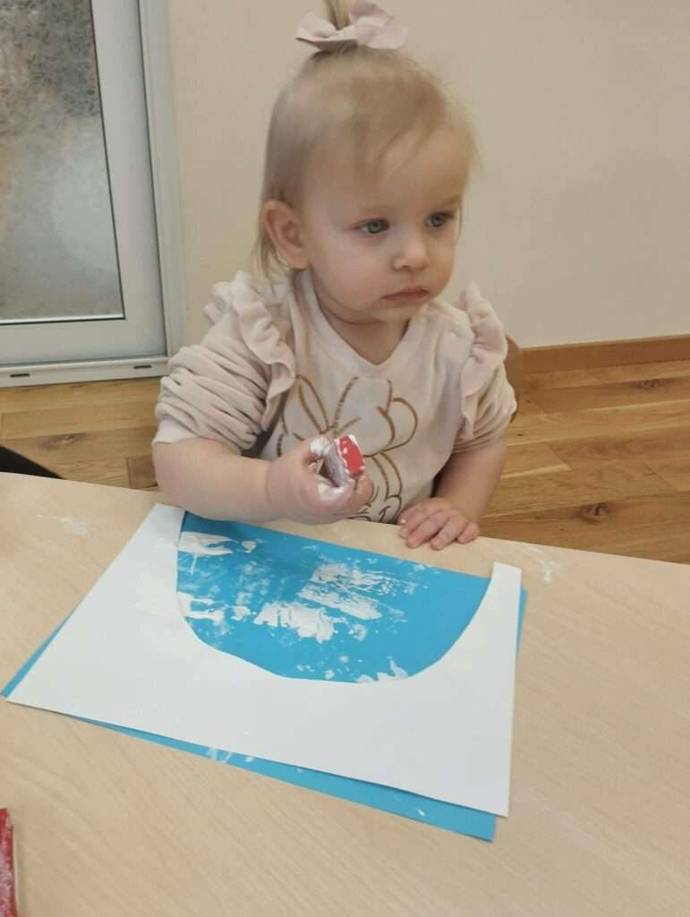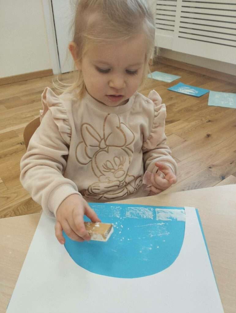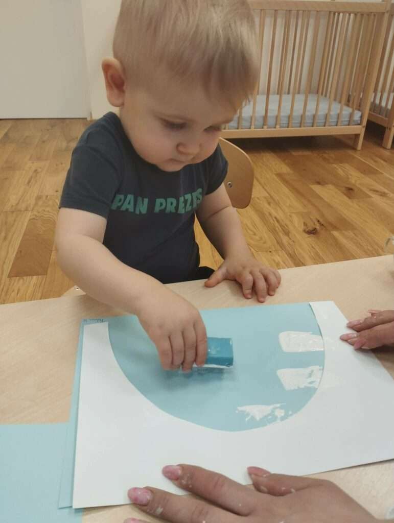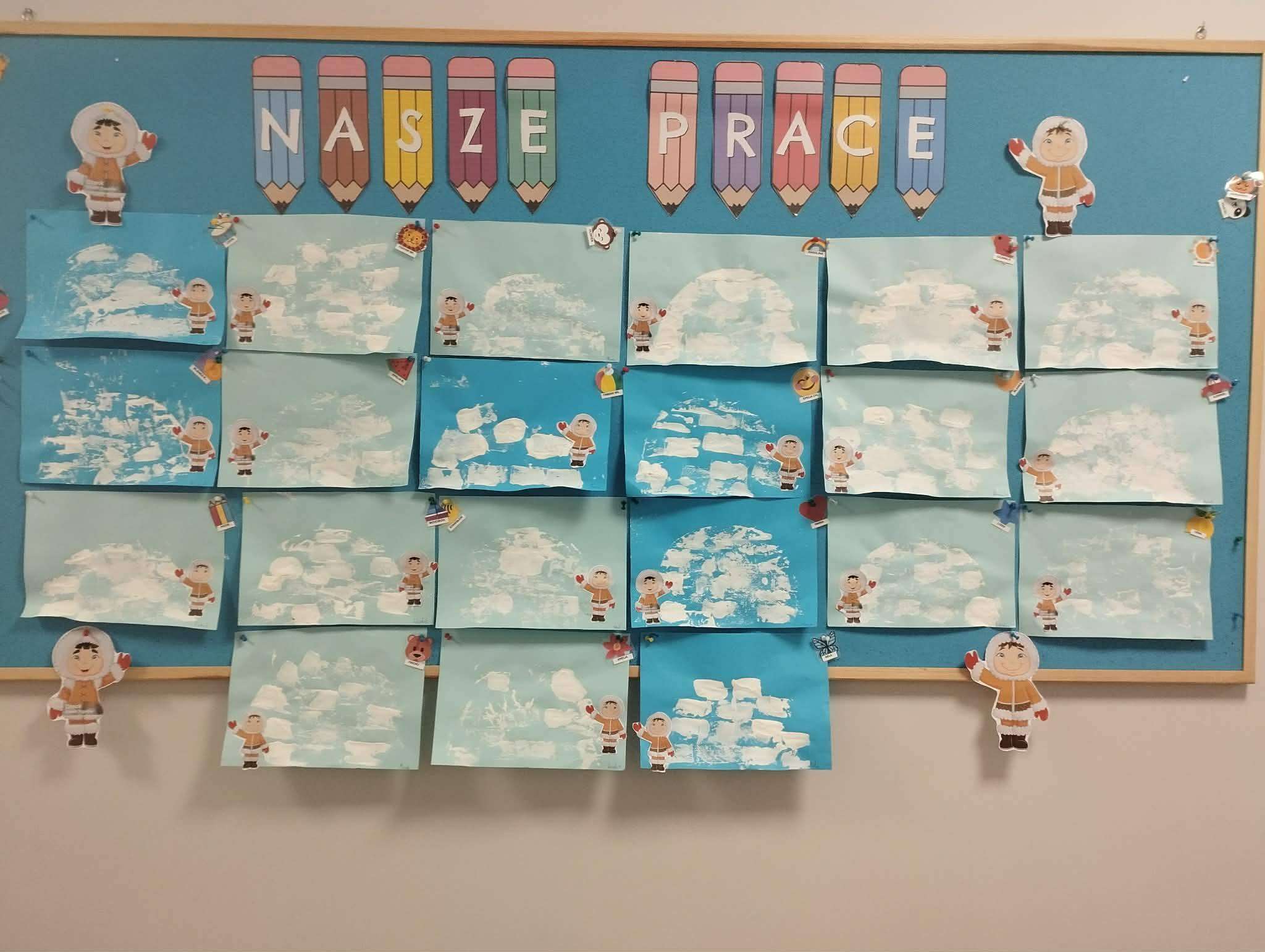 Dzieci z ogromnym zainteresowaniem odkrywały, jak wygląda lodowa budowla. Następnie z zaangażowaniem wykonały pracę plastyczną – za pomocą drewnianych klocków odbijanych w farbie powstały cegiełki, z których zbudowaliśmy nasze igloo. Na koniec dzieci przyklejały Eskimosa, dopełniając całą pracę.