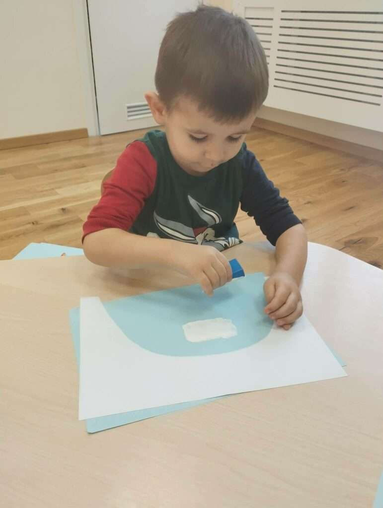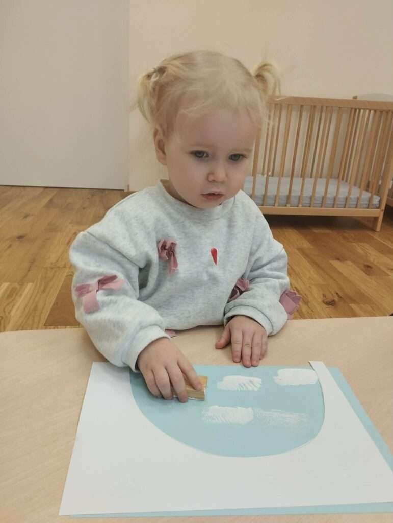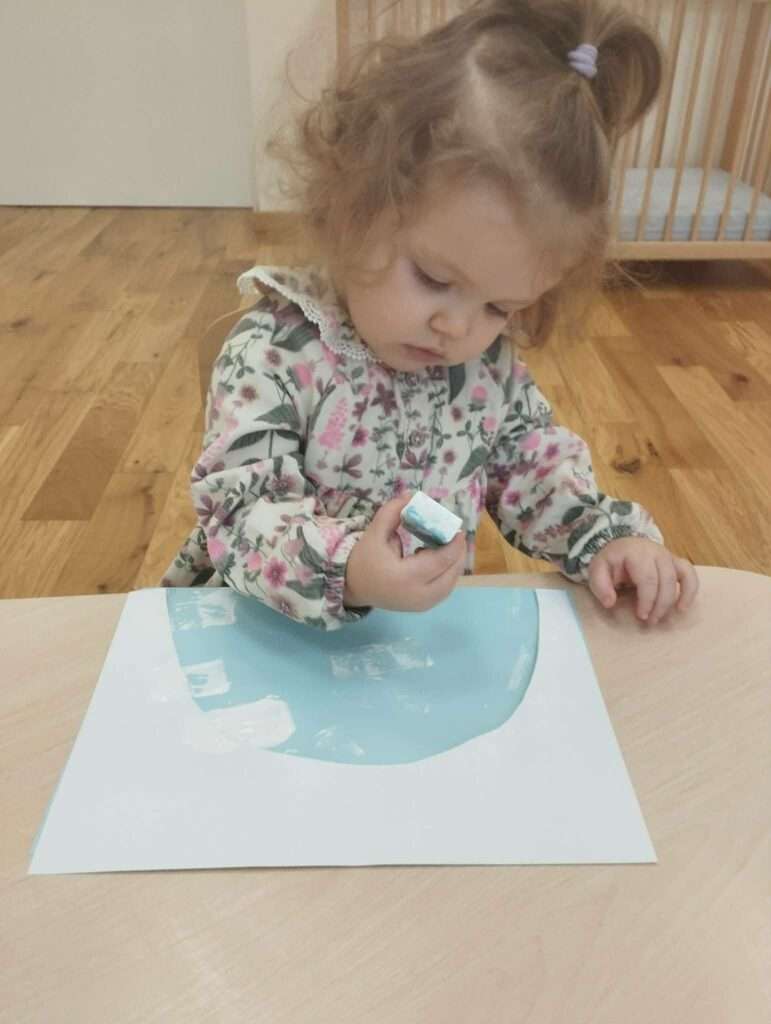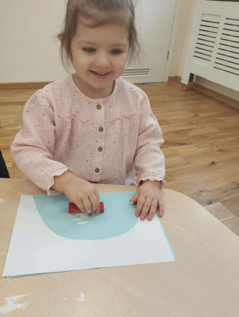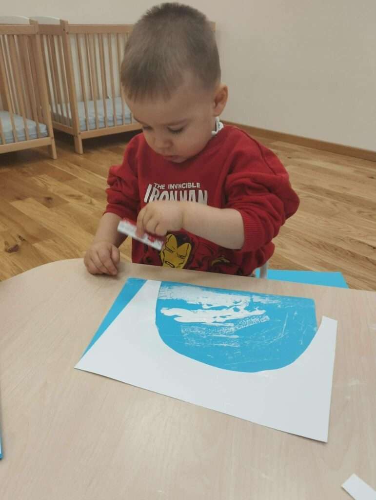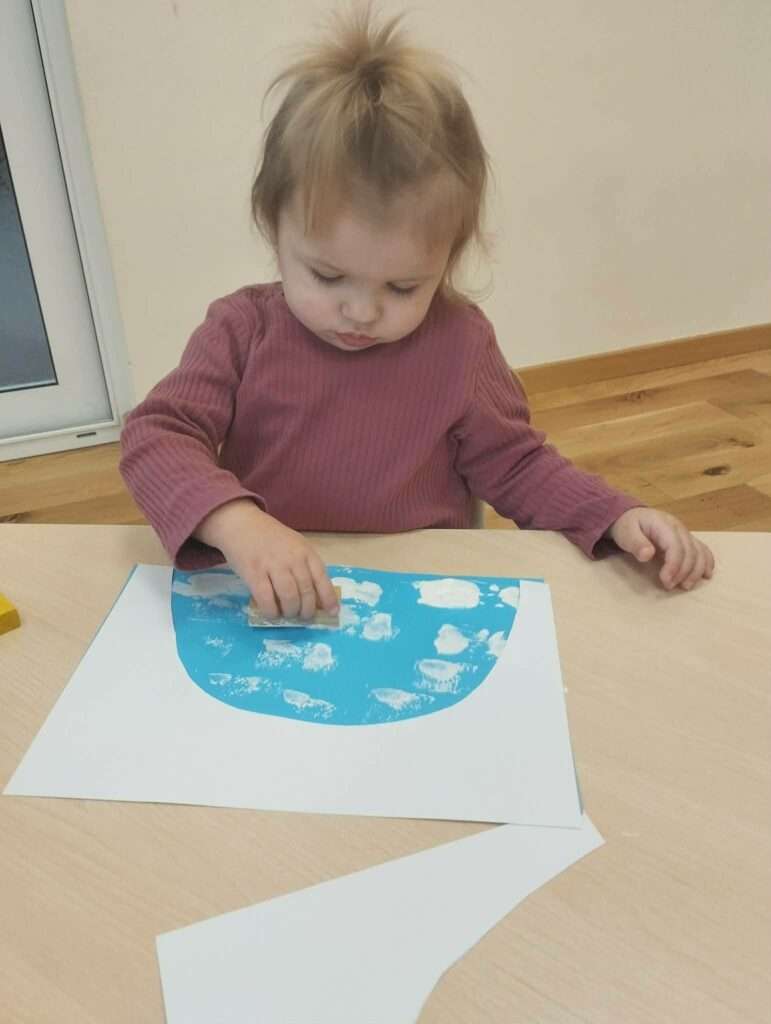 Dzieci z ogromnym zainteresowaniem odkrywały, jak wygląda lodowa budowla. Następnie z zaangażowaniem wykonały pracę plastyczną – za pomocą drewnianych klocków odbijanych w farbie powstały cegiełki, z których zbudowaliśmy nasze igloo. Na koniec dzieci przyklejały Eskimosa, dopełniając całą pracę.