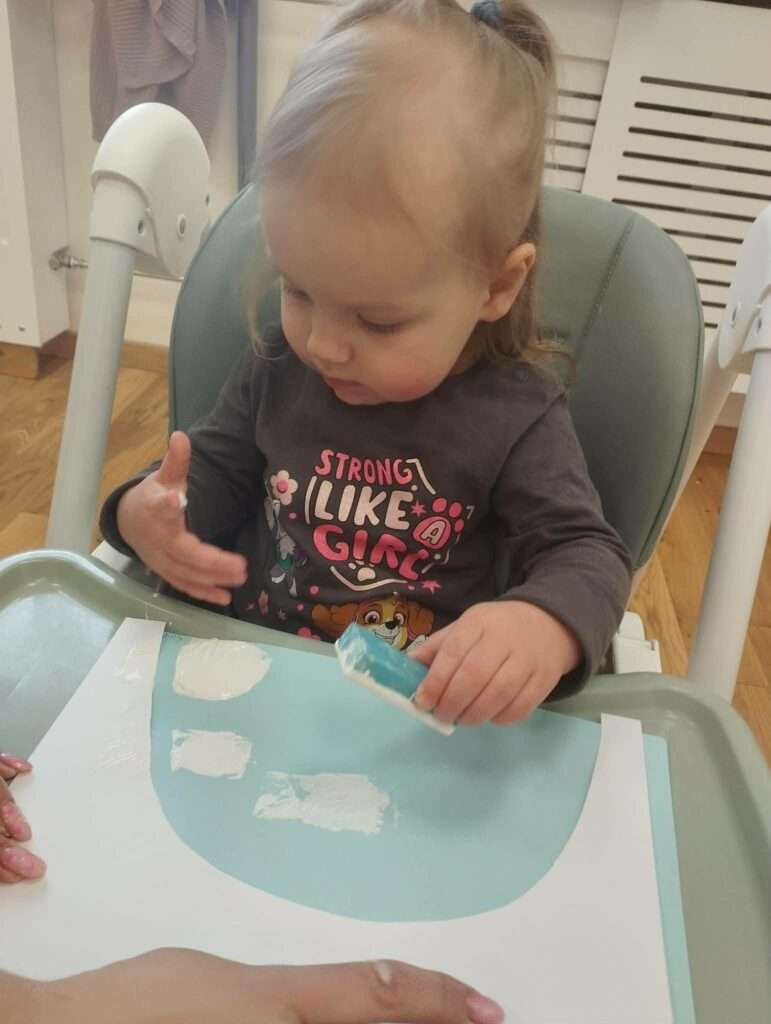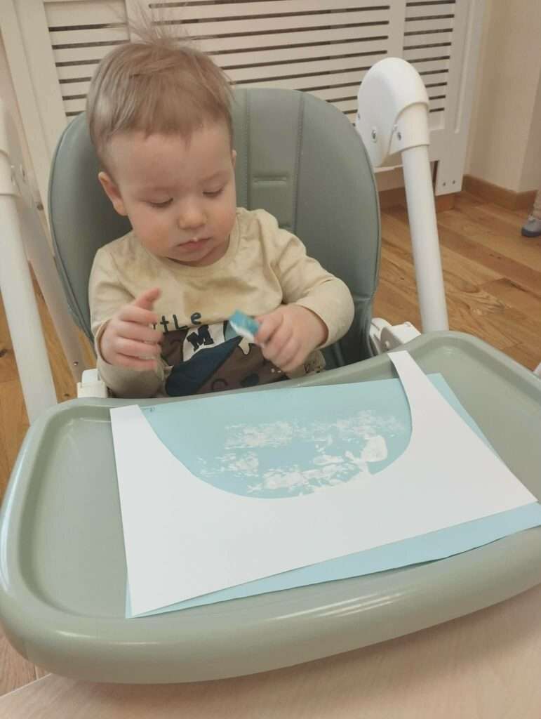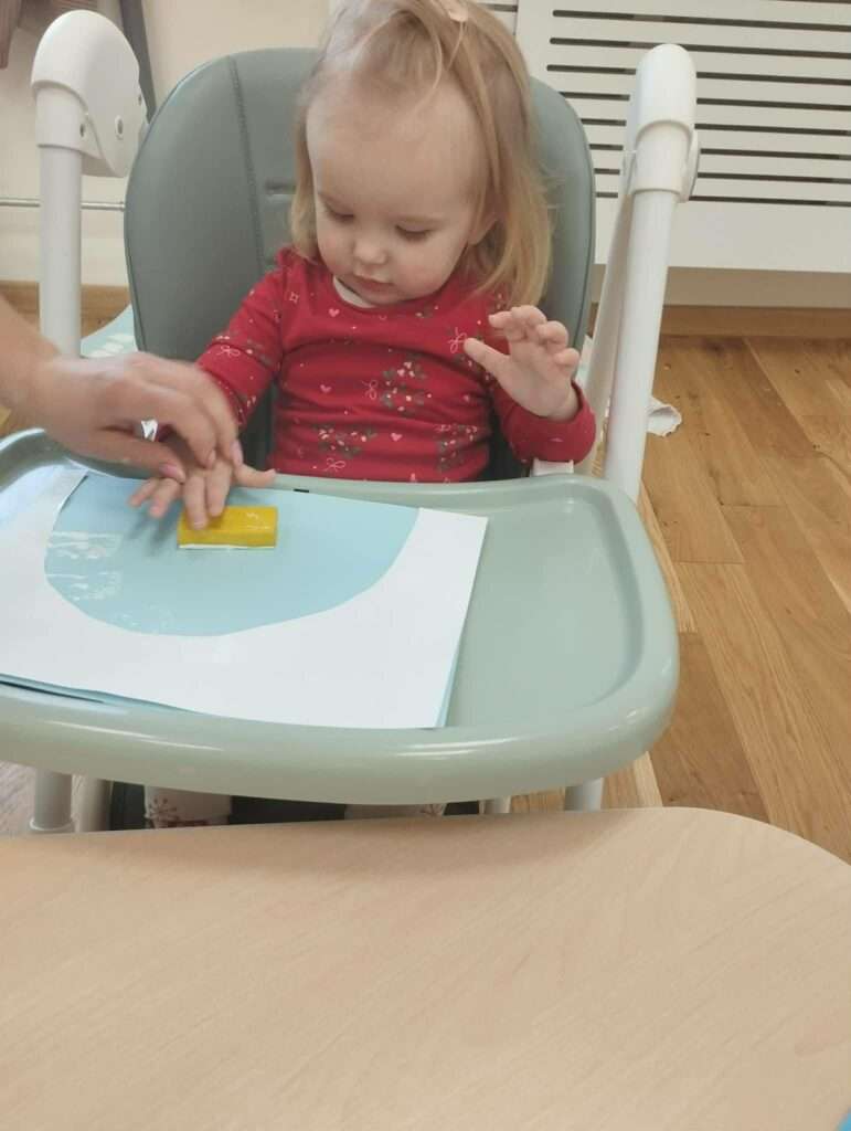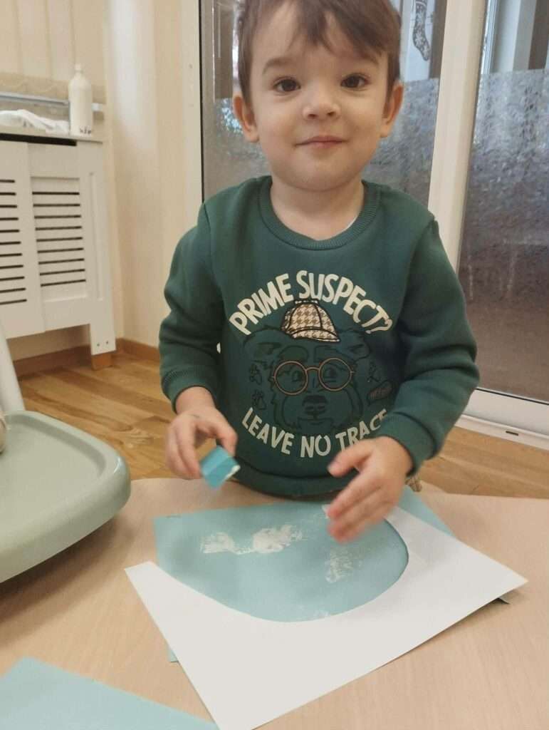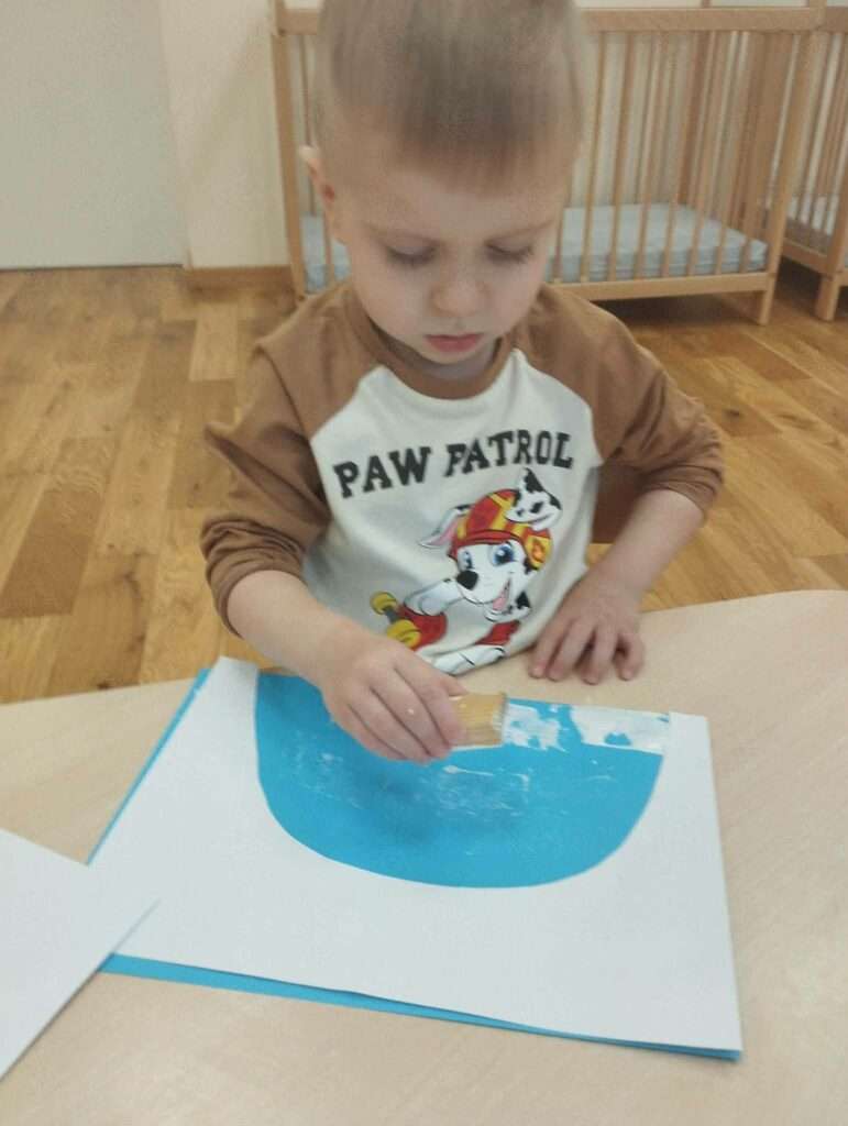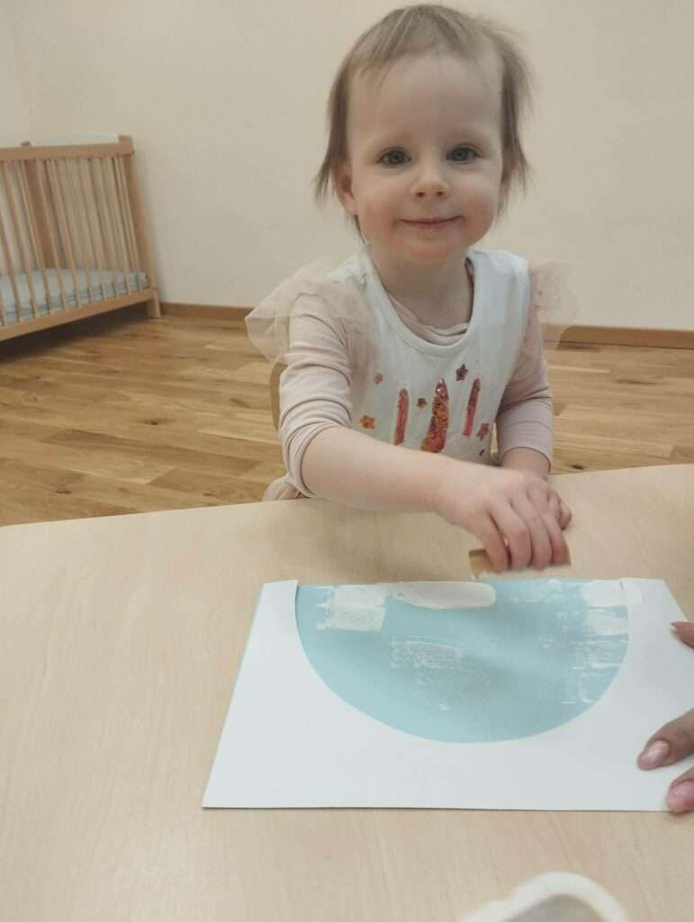 Dzieci z ogromnym zainteresowaniem odkrywały, jak wygląda lodowa budowla. Następnie z zaangażowaniem wykonały pracę plastyczną – za pomocą drewnianych klocków odbijanych w farbie powstały cegiełki, z których zbudowaliśmy nasze igloo. Na koniec dzieci przyklejały Eskimosa, dopełniając całą pracę.